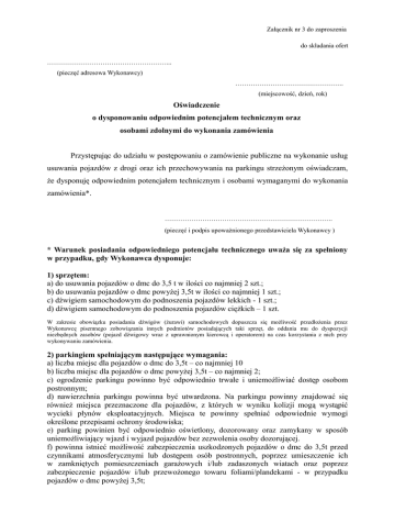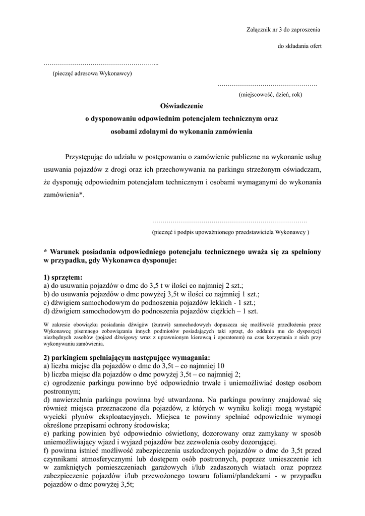 Załącznik nr 3 do zaproszenia do składania ofert ………………………………………………... (pieczęć adresowa Wykonawcy) …………………………………………. (miejscowość, dzień, rok) Oświadczenie o dysponowaniu odpowiednim potencjałem technicznym oraz osobami zdolnymi do wykonania zamówienia Przystępując do udziału w postępowaniu o zamówienie publiczne na wykonanie usług usuwania pojazdów z drogi oraz ich przechowywania na parkingu strzeżonym oświadczam, że dysponuję odpowiednim potencjałem technicznym i osobami wymaganymi do wykonania zamówienia*. …………………………………………………………………. (pieczęć i podpis upoważnionego przedstawiciela Wykonawcy ) * Warunek posiadania odpowiedniego potencjału technicznego uważa się za spełniony w przypadku, gdy Wykonawca dysponuje: 1) sprzętem: a) do usuwania pojazdów o dmc do 3,5 t w ilości co najmniej 2 szt.; b) do usuwania pojazdów o dmc powyżej 3,5t w ilości co najmniej 1 szt.; c) dźwigiem samochodowym do podnoszenia pojazdów lekkich - 1 szt.; d) dźwigiem samochodowym do podnoszenia pojazdów ciężkich – 1 szt. W zakresie obowiązku posiadania dźwigów (żurawi) samochodowych dopuszcza się możliwość przedłożenia przez Wykonawcę pisemnego zobowiązania innych podmiotów posiadających taki sprzęt, do oddania mu do dyspozycji niezbędnych zasobów (pojazd dźwigowy wraz z uprawnionym kierowcą i operatorem) na czas korzystania z nich przy wykonywaniu zamówienia. 2) parkingiem spełniającym następujące wymagania: a) liczba miejsc dla pojazdów o dmc do 3,5t – co najmniej 10 b) liczba miejsc dla pojazdów o dmc powyżej 3,5t – co najmniej 2; c) ogrodzenie parkingu powinno być odpowiednio trwałe i uniemożliwiać dostęp osobom postronnym; d) nawierzchnia parkingu powinna być utwardzona. Na parkingu powinny znajdować się również miejsca przeznaczone dla pojazdów, z których w wyniku kolizji mogą wystąpić wycieki płynów eksploatacyjnych. Miejsca te powinny spełniać odpowiednie wymogi określone przepisami ochrony środowiska; e) parking powinien być odpowiednio oświetlony, dozorowany oraz zamykany w sposób uniemożliwiający wjazd i wyjazd pojazdów bez zezwolenia osoby dozorującej. f) powinna istnieć możliwość zabezpieczenia uszkodzonych pojazdów o dmc do 3,5t przed czynnikami atmosferycznymi lub dostępem osób postronnych, poprzez umieszczenie ich w zamkniętych pomieszczeniach garażowych i/lub zadaszonych wiatach oraz poprzez zabezpieczenie pojazdów i/lub przewożonego towaru foliami/plandekami - w przypadku pojazdów o dmc powyżej 3,5t;