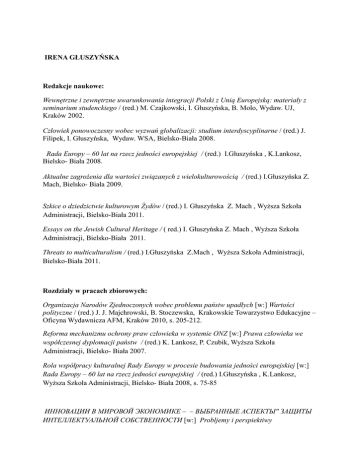 IRENA GŁUSZYŃSKA Redakcje naukowe: Wewnętrzne i zewnętrzne uwarunkowania integracji Polski z Unią Europejską: materiały z seminarium studenckiego / (red.) M. Czajkowski, I. Głuszyńska, B. Molo, Wydaw. UJ, Kraków 2002. Człowiek ponowoczesny wobec wyzwań globalizacji: studium interdyscyplinarne / (red.) J. Filipek, I. Głuszyńska, Wydaw. WSA, Bielsko-Biała 2008. Rada Europy – 60 lat na rzecz jedności europejskiej / (red.) I.Głuszyńska , K.Lankosz, Bielsko- Biała 2008. Aktualne zagrożenia dla wartości związanych z wielokulturowością / (red.) I.Głuszyńska Z. Mach, Bielsko- Biała 2009. Szkice o dziedzictwie kulturowym Żydów / (red.) I. Głuszyńska Z. Mach , Wyższa Szkoła Administracji, Bielsko-Biała 2011. Essays on the Jewish Cultural Heritage / ( red.) I. Głuszyńska Z. Mach , Wyższa Szkoła Administracji, Bielsko-Biała 2011. Threats to multiculturalism / (red.) I.Głuszyńska Z.Mach , Wyższa Szkoła Administracji, Bielsko-Biała 2011. Rozdziały w pracach zbiorowych: Organizacja Narodów Zjednoczonych wobec problemu państw upadłych [w:] Wartości polityczne / (red.) J. J. Majchrowski, B. Stoczewska, Krakowskie Towarzystwo Edukacyjne – Oficyna Wydawnicza AFM, Kraków 2010, s. 205-212. Reforma mechanizmu ochrony praw człowieka w systemie ONZ [w:] Prawa człowieka we współczesnej dyplomacji państw / (red.) K. Lankosz, P. Czubik, Wyższa Szkoła Administracji, Bielsko- Biała 2007. Rola współpracy kulturalnej Rady Europy w procesie budowania jedności europejskiej [w:] Rada Europy – 60 lat na rzecz jedności europejskiej / (red.) I.Głuszyńska , K.Lankosz, Wyższa Szkoła Administracji, Bielsko- Biała 2008, s. 75-85 ИННОВАЦИИ В МИРОВОЙ ЭКОНОМИКЕ – – ВЫБРАННЫЕ АСПЕКТЫ" ЗАЩИТЫ ИНТЕЛЛЕКТУАЛЬНОЙ СОБСТВЕННОСТИ [w:] Probljemy i perspiektiwy gosudarstwiennowo i municipalnowo uprawljenia w innowacinnoj ekonomike postkrizisnowo pjerioda / ( red.) O.P. Owcziennikowa, N.W. Kułażienkowa, T. II, Orzeł 2011, Federacja Rosyjska , s.36 -41. XAPAKTEPИCTИKA HEKOTOPЫX ACЛEKTOB COTPУДHИЧECTBA EBPOПEЙГO COЮЗA И POCCИЙCKOЙ ФEДEPAЦИИ [w:] Izučenie opyta respubliki Polsza po integracii w ES i wozmožnost ego adaptacii w RF na osnowe partnerskih otnošenij : meždunarodnaja naučno-prakmučeskaâ videokonferenciâ (20 noâbpâ 2010) / (red.) O.P. Owcziennikowa, 2011, Federacja Rosyjska , s.31 -38. Artykuły w czasopismach naukowych: Uwarunkowania formalno-prawne procesu rozszerzenia Unii Europejskiej, „Państwo i Społeczeństwo” nr 4 2003, s. 153-170. Deutschland gegenüber dem Reformvorschlag des VN-Sicherheitsrates, „Krakowskie Studia Międzynarodowe“ nr 2 2006, s. 117-131. Niemcy wobec propozycji reformy Rady Bezpieczeństwa ONZ, „Krakowskie Studia Międzynarodowe” nr 4 2006, s. 118-131. Opracowania i wybory: Międzynarodowe stosunki kulturalne: wybór dokumentów / Irena Głuszyńska, Kazimierz Lankosz, Wydaw. Wyższa Szkoła Administracji, Bielsko-Biała 2007.
