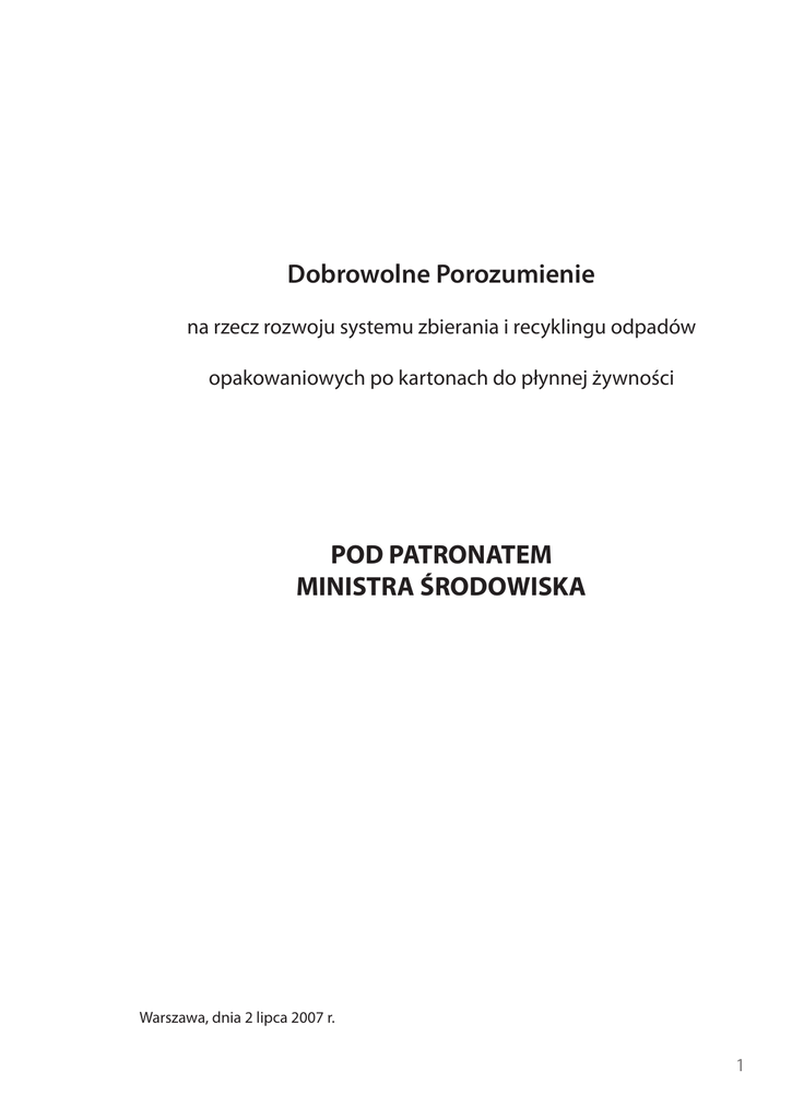 Dobrowolne Porozumienie na rzecz rozwoju systemu zbierania i recyklingu odpadów opakowaniowych po kartonach do płynnej żywności POD PATRONATEM MINISTRA ŚRODOWISKA Warszawa, dnia 2 lipca 2007 r. 1 Dobrowolne Porozumienie na rzecz rozwoju systemu zbierania i recyklingu odpadów opakowaniowych po kartonach do płynnej żywności jest pożyteczną i cenną inicjatywą dla ochrony środowiska. Udzielając tej inicjatywie poparcia, obejmuję ją Patronatem Minister Środowiska Prof. Jan Szyszko 2 Sygnatariusze Dobrowolnego Porozumienia 3 Dobrowolne Porozumienie na rzecz rozwoju systemu zbierania i recyklingu odpadów opakowaniowych po kartonach do płynnej żywności POD HONOROWYM PATRONATEM MINISTRA ŚRODOWISKA zawarte w Warszawie w dniu 2 lipca 2007 r. Strony niniejszego Porozumienia: - kierując się potrzebą ograniczania oddziaływania zużytych opakowań na środowisko naturalne; - dążąc do realizacji postanowień ustawy z dnia 11-go maja 2001 roku o obowiązkach przedsiębiorców w zakresie gospodarowania niektórymi odpadami oraz o opłacie produktowej i opłacie depozytowej (Dz. U. Nr 63 poz. 639 z późniejszymi zmianami); - uznając potrzebę intensyfikacji działań edukacyjnych w zakresie właściwego gospodarowania odpadami opakowaniowymi, w szczególności odpadami pokonsumpcyjnych z opakowań kartonowych do płynnej żywności, postanawiają co następuje: 4 § 1. Strony Porozumienia 1. Stronami Porozumienia są następujące podmioty: a. Organizacje reprezentujące producentów żywności, którzy wprowadzają na rynek żywność w płynie przy wykorzystaniu opakowań kartonowych: i. Krajowy Związek Spółdzielni Mleczarskich Związek Rewizyjny z siedzibą z Warszawie przy ul. Hożej 66/68 zarejestrowany w Sądzie Rejonowym dla Miasta Stołecznego Warszawy w Sądzie Rejonowym dla m.st. Warszawy XIX Wydział Gospodarczy Krajowego Rejestru Sądowego w Warszawie, pod nr KRS 0000113465 , reprezentowany przez: Stanisław Michalski – Prezes Zarządu Waldemar Broś – Zastępca Prezesa Zarządu ii. Związek Prywatnych Przetwórców Mleka z siedzibą w Warszawie przy ul. Nowogrodzkiej 31 lok. 202 zarejestrowany w Sądzie Rejonowym dla m.st. Warszawy XII Wydział Gospodarczy Krajowego Rejestru Sądowego pod nr KRS 0000021514 , reprezentowany przez: Elżbieta Nitecka – Dyrektor Biura Zarządu iii. Stowarzyszenie Krajowa Unia Producentów Soków z siedzibą w Warszawie przy ul. Rakowieckiej 36 zarejestrowane w Sądzie Rejonowym dla m.st. Warszawy XII Wydział Gospodarczy Krajowego Rejestru Sądowego pod nr KRS 0000205017 , reprezentowane przez: Julian Pawlak – Prezes Romuald Ozimek – Wiceprezes zwane dalej „Organizacjami Zrzeszającymi Użytkowników Opakowań” b. Podmioty, które prowadzą działalność gospodarczą na terytorium Polski w zakresie produkcji lub sprzedaży kartonowego materiału opakowaniowego do płynnej żywności i. Elopak S.A., z siedzibą w Czosnowie, przy ul. Duńskiej 3 zarejestrowany w Sądzie Rejonowym dla m.st. Warszawy XIV Wydział Gospodarczy pod nr KRS 0000118262, reprezentowany przez: Edward Zakrzewski – Prezes Zarządu Arkadiusz Nowak – Członek Zarządu ii. SIG Combibloc Sp. z o.o., z siedzibą w Warszawie, przy ul. Bekasów 63/65, zarejestrowany w Sądzie Rejonowym dla m.st. Warszawy XIII Wydział Gospodarczy pod nr KRS 0000185533 reprezentowana przez: Jerzy Górczyński – Prezes Zarządu 5 iii. Tetra Pak Sp. z o.o., z siedzibą w Warszawie, przy ul. 1 Sierpnia 8a, zarejestrowany w Sądzie Rejonowym dla m. st. Warszawy XIII Wydział Gospodarczy pod nr KRS 0000027538, reprezentowana przez: Evan Klintner – Dyrektor Generalny – Członek Zarządu Jan Jasiński - Prokurent zwane dalej „Dostawcami Materiału Opakowaniowego”. c. Organizacje działające na rzecz rozwoju gospodarki żywnościowej i opakowaniowej: i. Stowarzyszenie Polska Koalicja Przemysłowa na Rzecz Opakowań Przyjaznych Środowisku Eko-Pak, z siedzibą w Warszawie przy ul. Pańskiej 73, zarejestrowane w Sądzie Rejonowym dla m. st. Warszawy XIII Wydział Gospodarczy pod nr KRS 0000144806, reprezentowana przez: Agnieszka Krejner-Pawełas – Prezes Zarządu ii. Stowarzyszenie Polska Federacja Producentów Żywności, z siedzibą w Warszawie, przy ul. Chałubińskiego 8, zarejestrowane w Sądzie Rejonowym dla m. st. Warszawy XII Wydział Gospodarczy pod nr KRS 0000143024, reprezentowane przez: Małgorzata Skonieczna – Prezes Małgorzata Faraś – Wiceprezes Zarządu iii. Krajowa Izba Gospodarcza „Przemysł Spożywczy”, z siedzibą w Warszawie, przy Aleja Wilanowska 97E, zarejestrowana w Sądzie Rejonowym dla m. st. Warszawy XIII Wydział Gospodarczy, pod nr KRS 0000239258, reprezentowana przez: Tadeusz Pokrywka – Prezes KIG „PS” zwane dalej „Organizacjami ” 6 § 2. Przedmiot i cel porozumienia 1. Przedmiotem Porozumienia jest uregulowanie zasad współpracy zainteresowanych Stron Porozumienia przy tworzeniu i finansowaniu wspomagania systemu selektywnego zbierania i recyklingu odpadów opakowaniowych po kartonach do płynnej żywności w Polsce. 2. Porozumienie jest otwarte dla wszystkich organizacji, które prowadzą działalność na terytorium Polski w zakresie reprezentowania podmiotów gospodarczych: a. zajmujących się produkcją lub sprzedażą opakowań kartonowych do płynnej żywności lub b. wprowadzających na rynek krajowy żywność w płynie przy wykorzystaniu opakowań kartonowych, w tym podmiotów zlecających wytworzenie produktu w opakowaniu kartonowym pod marką własną oraz importerów opakowań (dalej: Użytkownicy opakowań). 3. Przystąpienie do Porozumienia jest dobrowolne. 4. Porozumienie ma na celu stworzenie mechanizmu wspomagania systemu selektywnego zbierania i recyklingu, odpadów opakowaniowych po kartonach do płynnej żywności w Polsce, zapewniającego osiągnięcie zakładanych wskaźników recyklingu tych odpadów. 7 § 3. Definicje Użyte w niniejszym Porozumieniu pojęcia oznaczają, co następuje: a)