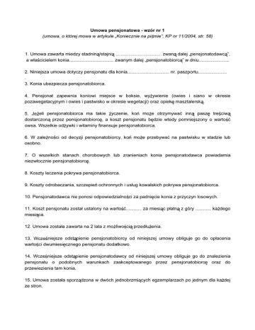 8PRZDSHQVMRQDWRZDZ]yUQU XPRZDRNWyUHMPRZDZDUW\NXOHÄ.RQLHF]QLHQDSL PLH´.3QUVWU 8PRZD]DZDUWDPLHG]\VWDGQLQ VWDMQL ]ZDQ GDOHMÄSHQVMRQDWRGDZF ´ DZáD FLFLHOHPNRQLD]ZDQ\PGDOHMÄSHQVMRQDWRELRUF ´ZGQLX 1LQLHMV]DXPRZDGRW\F]\SHQVMRQDWXGODNRQLDQUSDV]SRUWX .RQLDXEH]SLHF]DSHQVMRQDWRELRUFD 3HQVMRQDW ]DSHZQLD NRQLRZL PLHMVFH Z ERNVLH Z\ \ZLHQLH RZLHV L VLDQR Z RNUHVLH SR]DZHJHWDF\MQ\PLRZLHVLSDVWZLVNRZRNUHVLHZHJHWDFMLRUD]RSLHN PDV]WDOHUVN -H HOL SHQVMRQDWRELRUFD PD WDNLH \F]HQLH NR PR H RWU]\P\ZDü LQQ SDV] WUH FLZ GRVWDUF]RQ SU]H] SHQVMRQDWRELRUF D NRV]W SHQVMRQDWX E G]LH ZWHG\ SRPQLHMV]RQ\ R ZDUWR ü RZVD:V]HONLHRG \ZNLLZLWDPLQ\ILQDQVXMHSHQVMRQDWRELRUFD : ]DOH QR FL RG GHF\]ML SHQVMRQDWRELRUF\ NR PR H SU]HE\ZDü QD SDVWZLVNX Z VWDG]LH OXE RVREQR 2 ZV]HONLFK VWDQDFK FKRURERZ\FK OXE ]UDQLHQLDFK NRQLD SHQVMRQDWRGDZFD SRZLDGDPLD QLH]ZáRF]QLHSHQVMRQDWRELRUF .RV]W\OHF]HQLDSRNU\ZDSHQVMRQDWRELRUFD .RV]W\RGUREDF]DQLDV]F]HSLH RFKURQQ\FKLXVáXJNRZDOVNLFKSRNU\ZDSHQVMRQDWRELRUFD 3HQVMRQDWRGDZFDQLHSRQRVLRGSRZLHG]LDOQR FL]DSDGQL FLHNRQLD]SU]\F]\QORVRZ\FK .RV]WSHQVMRQDWX]RVWDáXVWDORQ\QDZDUWR ü]DPLHVL FSáDWQ ]JyU\ND GHJR PLHVL FD 8PRZD]RVWDáD]DZDUWDQDODWD]PR OLZR FL SU]HGáX HQLD :F]H QLHMV]H RGVW SLHQLH SHQVMRQDWRELRUF\ RG QLQLHMV]HM XPRZ\ REOLJXMH JR GR RSáDFHQLD ZDUWR FLGZXPLHVL F]QHJRSHQVMRQDWXGRGDWNRZR :F]H QLHMV]H RGVW SLHQLH SHQVMRQDWRGDZF\ RG QLQLHMV]HM XPRZ\ REOLJXMH JR GR ]QDOH]LHQLD SHQVMRQDWX R SRGREQ\FK ZDUXQNDFK ]DDNFHSWRZDQHJR SU]H] SHQVMRQDWRELRUF RUD] GR SU]HZLH]LHQLDWDPNRQLD 8PRZD]RVWDáDVSRU] G]RQDZGZyFKMHGQREU]PL F\FKHJ]HPSODU]DFKSRMHGQ\PGODND GHM ]HVWURQ
