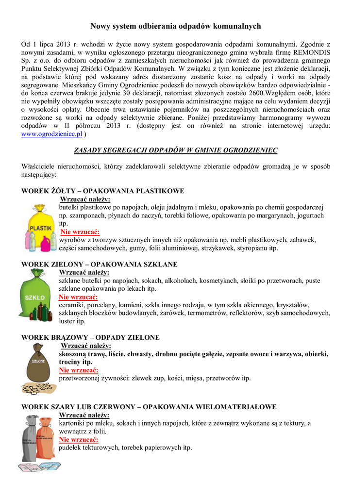 Nowy system odbierania odpadów komunalnych Od 1 lipca 2013 r. wchodzi w życie nowy system gospodarowania odpadami komunalnymi. Zgodnie z nowymi zasadami, w wyniku ogłoszonego przetargu nieograniczonego gmina wybrała firmę REMONDIS Sp. z o.o. do odbioru odpadów z zamieszkałych nieruchomości jak również do prowadzenia gminnego Punktu Selektywnej Zbiórki Odpadów Komunalnych. W związku z tym konieczne jest złożenie deklaracji, na podstawie której pod wskazany adres dostarczony zostanie kosz na odpady i worki na odpady segregowane. Mieszkańcy Gminy Ogrodzieniec podeszli do nowych obowiązków bardzo odpowiedzialnie do końca czerwca brakuje jedynie 30 deklaracji, natomiast złożonych zostało 2600.Względem osób, które nie wypełniły obowiązku wszczęte zostały postępowania administracyjne mające na celu wydaniem decyzji o wysokości opłaty. Obecnie trwa ustawianie pojemników na poszczególnych nieruchomościach oraz rozwożone są worki na odpady selektywnie zbierane. Poniżej przedstawiamy harmonogramy wywozu odpadów w II półroczu 2013 r. (dostępny jest on również na stronie internetowej urzędu: www.ogrodzieniec.pl ) ZASADY SEGREGACJI ODPADÓW W GMINIE OGRODZIENIEC Właściciele nieruchomości, którzy zadeklarowali selektywne zbieranie odpadów gromadzą je w sposób następujący: WOREK ŻÓŁTY – OPAKOWANIA PLASTIKOWE Wrzucać należy: butelki plastikowe po napojach, oleju jadalnym i mleku, opakowania po chemii gospodarczej np. szamponach, płynach do naczyń, torebki foliowe, opakowania po margarynach, jogurtach itp. Nie wrzucać: wyrobów z tworzyw sztucznych innych niż opakowania np. mebli plastikowych, zabawek, części samochodowych, gumy, folii aluminiowej, strzykawek, styropianu itp. WOREK ZIELONY – OPAKOWANIA SZKLANE Wrzucać należy: szklane butelki po napojach, sokach, alkoholach, kosmetykach, słoiki po przetworach, puste szklane opakowania po lekach itp. Nie wrzucać: ceramiki, porcelany, kamieni, szkła innego rodzaju, w tym szkła okiennego, kryształów, szklanych bloczków budowlanych, żarówek, termometrów, reflektorów, szyb samochodowych, luster itp. WOREK BRĄZOWY – ODPADY ZIELONE Wrzucać należy: skoszoną trawę, liście, chwasty, drobno pocięte gałęzie, zepsute owoce i warzywa, obierki, trociny itp. Nie wrzucać: przetworzonej żywności: zlewek zup, kości, mięsa, przetworów itp. WOREK SZARY LUB CZERWONY – OPAKOWANIA WIELOMATERIAŁOWE Wrzucać należy: kartoniki po mleku, sokach i innych napojach, które z zewnątrz wykonane są z tektury, a wewnątrz z folii. Nie wrzucać: pudełek tekturowych, torebek papierowych itp. Odpady opakowaniowe selektywnie zbierane w workach nie musza być myte, ale bezwzględnie muszą być opróżnione z zawartości.. POJEMNIK- ODPADY POZOSTAŁE PO SEGREGACJI Wrzucać należy: Wszystko to, czego nie gromadzimy w workach: zielonym, żółtym, brązowym i szarym, kompostowniku oraz to czego nie możemy oddać do punktu selektywnej zbiórki, np. zabrudzone tekturowe talerzyki jednorazowe, porcelanę, styropian opakowaniowy, gumę, odpady drewniane, artykuły higieniczne (wata, pampersy, podpaski, chusteczki higieniczne), popiół z systemów grzewczych, kości, odchody zwierząt domowych, blistry po tabletkach, zużyte strzykawki, odzież i obuwie, Nie należy wrzucać: Odpadów, które możemy wysegregować w workach, zagospodarować w kompostowniku lub oddać do punktu selektywnej zbiórki odpadów. DOPUSZCZA SIĘ, ABY W POJEMNIKU NA ODPADY BYŁO 5% ODPADÓW INNYCH FRAKCJI, W ZWIĄZKU Z POWYŻSZYM MOŻNA DO POJEMNIKA WRZUCAĆ ODPADY W WORKACH NA ŚMIECI W KTÓRYCH BYŁY GROMADZONE PRZED UMIESZCZENIEM W POJEMNIKU. Oprócz regularnej zbiórki odpadów wymienionych powyżej, raz w roku będą organizowane wystawki odpadów wielkogabarytowych, opon oraz zużytego sprzętu elektrycznego i elektronicznego. Od 1 lipca 2013 r. zostanie uruchomiony w Ogrodzieńcu przy ul. Kościuszki 210 (baza firmy REMONDIS) Punkt Selektywnego Zbierania Odpadów, do którego wszyscy właściciele posesji zamieszkałych będą mogli oddać selektywnie zebrane odpady takie jak: zielone i biodegradowalne, papier i tekturę, tworzywa sztuczne, opakowania wielomateriałowe, metale, szkło, zużyty sprzęt elektryczny i elektroniczny, odpady wielkogabarytowe, zużyte baterie i akumulatory, zużyte opony, przeterminowane leki. Do Punktu Selektywnego Zbierania Odpadów Komunalnych właściciele nieruchomości zamieszkałych będą mogli przekazywać gruz z remontów prowadzonych samodzielnie w limicie 0,5 m3/mieszkańca/rok. Gruz trzeba dostarczyć do Punktu Selektywnego Zbierania Odpadów Komunalnych i przeładować do pojemnika wskazanego przez pracownika obsługującego ww. punkt. Gruz odbierany w ramach systemu może składać się z cegieł, pustaków i betonu, nie może zawierać zanieczyszczeń w postaci elementów azbestowych, drewnianych, ceramiki, pianek, plastików itp. Punkt czynny będzie w każdą sobotę w godzinach od 8:00 – 19.00, jeśli sobota będzie dniem ustawowo wolnym od pracy punkt będzie czynny w najbliższy poprzedzający sobotę piątek w godzinach od 8:00 – 19.00. Urząd Miasta i Gminy Ogrodzieniec