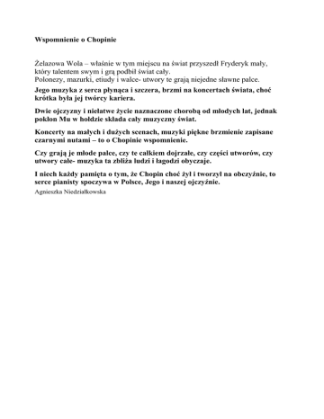 Wspomnienie o Chopinie Żelazowa Wola – właśnie w tym miejscu na świat przyszedł Fryderyk mały, który talentem swym i grą podbił świat cały. Polonezy, mazurki, etiudy i walce- utwory te grają niejedne sławne palce. Jego muzyka z serca płynąca i szczera, brzmi na koncertach świata, choć krótka była jej twórcy kariera. Dwie ojczyzny i niełatwe życie naznaczone chorobą od młodych lat, jednak pokłon Mu w hołdzie składa cały muzyczny świat. Koncerty na małych i dużych scenach, muzyki piękne brzmienie zapisane czarnymi nutami – to o Chopinie wspomnienie. Czy grają je młode palce, czy te całkiem dojrzałe, czy części utworów, czy utwory całe- muzyka ta zbliża ludzi i łagodzi obyczaje. I niech każdy pamięta o tym, że Chopin choć żył i tworzył na obczyźnie, to serce pianisty spoczywa w Polsce, Jego i naszej ojczyźnie. Agnieszka Niedziałkowska