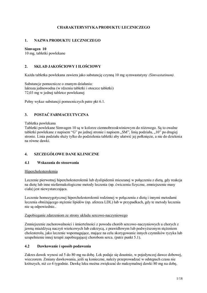 CHARAKTERYSTYKA PRODUKTU LECZNICZEGO 1. NAZWA PRODUKTU LECZNICZEGO Simvagen 10 10 mg, tabletki powlekane 2. SKŁAD JAKOŚCIOWY I ILOŚCIOWY Każda tabletka powlekana zawiera jako substancję czynną 10 mg symwastatyny (Simvastatinum). Substancje pomocnicze o znanym działaniu: laktoza jednowodna (w rdzeniu tabletki i otoczce tabletki) 72,03 mg w jednej tabletce powlekanej Pełny wykaz substancji pomocniczych patrz pkt 6.1. 3. POSTAĆ FARMACEUTYCZNA Tabletka powlekana Tabletki powlekane Simvagen 10 są w kolorze ciemnobrzoskwiniowym do różowego. Są to owalne tabletki powlekane z napisem “G” po jednej stronie i napisem „SM”, linią podziału, „10” po drugiej stronie. Linia podziału służy tylko do podzielenia tabletki aby ułatwić jej połknięcie, a nie do dzielenia na równe dawki. 4. 4.1 SZCZEGÓŁOWE DANE KLINICZNE Wskazania do stosowania Hipercholesterolemia Leczenie pierwotnej hipercholesterolemii lub dyslipidemii mieszanej w połączeniu z dietą, gdy reakcja na dietę lub inne niefarmakologiczne metody leczenia (np. ćwiczenia fizyczne, zmniejszenie masy ciała) jest niewystarczająca. Leczenie homozygotycznej hipercholesterolemii rodzinnej w połączeniu z dietą i innymi metodami leczenia obniżającego stężenie lipidów (np. afereza LDL) lub w przypadkach, gdy te metody leczenia nie są odpowiednie.. Zapobieganie zdarzeniom ze strony układu sercowo-naczyniowego Zmniejszenie zachorowalności i śmiertelności z powodu chorób sercowo-naczyniowych u chorych z jawną miażdżycą naczyń wieńcowych lub cukrzycą, z prawidłowym lub podwyższonym stężeniem cholesterolu, jako leczenie wspomagające, mające na celu skorygowanie innych czynników ryzyka lub uzupełnienie innej terapii zapobiegającej chorobom serca. (patrz punkt 5.1). 4.2 Dawkowanie i sposób podawania Zakres dawek wynosi od 5 do 80 mg na dobę. Lek podaje się doustnie, w pojedynczej dawce dobowej, wieczorem. Zmiany dawkowania, jeśli są konieczne, należy przeprowadzać w odstępach czasu nie krótszych, niż co 4 tygodnie. Dawkę leku można zwiększać do maksymalnej dawki 80 mg na dobę, 1/18 podawanej raz na dobę, wieczorem. Dawkę 80 mg zaleca się jedynie u chorych z ciężką hipercholesterolemią i dużym ryzykiem powikłań sercowo-naczyniowych, u których nie osiągnięto celów terapeutycznych przy zastosowaniu niższych dawek i gdy spodziewane korzyści przewyższają potencjalne ryzyko. (Patrz punkty 4.4 i 5.1) Hipercholesterolemia Pacjent powinien stosować standardową dietę niskocholesterolową. Dietę taką należy kontynuować w czasie leczenia symwastatyną. Zazwyczaj dawka początkowa wynosi 10-20 mg na dobę i jest podawana raz na dobę, wieczorem. U pacjentów, u których konieczne jest znaczne obniżenie stężenia cholesterolu LDL (o ponad 45%), leczenie można rozpocząć od dawki 20-40 mg na dobę, podawanej raz na dobę, wieczorem. Zmiany dawkowania, jeśli są konieczne, należy przeprowadzać w sposób opisany powyżej. Homozygotyczna hipercholesterolemia rodzinna Na podstawie wyników kontrolowanego badania klinicznego zaleca się stosowanie symwastatyny w dawce początkowej 40 mg na dobę. Symwastatynę należy stosować u tych chorych dodatkowo do innych metod leczenia obniżającego stężenie lipidów (np. afereza LDL) lub w przypadku, gdy inne metody takiego leczenia są niedostępne. Zapobieganie zdarzeniom ze strony układu sercowo-naczyniowego Zwykle dawka symwastatyny u pacjentów z wysokim ryzykiem choroby wieńcowej (z lub bez hiperlipidemii) wynosi 20 do 40 mg na dobę i jest podawana raz na dobę, wieczorem, Leczenie farmakologiczne można rozpocząć jednocześnie z dietą i ćwiczeniami fizycznymi. Zmiany dawkowania, jeśli są konieczne, należy przeprowadzać w sposób podany powyżej. Terapia skojarzona Symwastatyna jest skuteczna w monoterapii lub w terapii skojarzonej z lekami wiążącymi kwasy żółciowe. Symwastatynę należy podawać nie później niż 2 godziny przed albo nie wcześniej niż 4 godziny po podaniu leków wiążących kwasy żółciowe. U pacjentów, którzy jednocześnie z symwastatyną przyjmują fibraty inne niż gemfibrozyl (patrz punkt 4.3) lub fenofibrat, dawka symwastatyny nie powinna przekraczać 10 mg na dobę. U pacjentów przyjmujących jednocześnie z symwastatyną amiodaron, amlodypinę, werapamil lub diltiazem, dawka symwastatyny nie powinna przekraczać 20 mg na dobę. Dawkowanie u chorych z niewydolnością nerek Nie ma konieczności zmiany dawkowania u pacjentów z umiarkowaną niewydolnością nerek. U pacjentów z ciężką niewydolnością nerek (klirens kreatyniny < 30 ml/min) należy starannie rozważyć podawanie dawki większej niż 10 mg na dobę i jeśli jest to niezbędne bardzo ostrożnie rozpocząć leczenie. Stosowanie u osób w podeszłym wieku Nie ma konieczności dostosowania dawkowania. Stosowanie u dzieci i młodzieży (w wieku 10-17 lat) Dla dzieci i młodzieży (chłopcy w fazie II wg. skali Tannera i dziewczynki co najmniej rok po wystąpieniu pierwszej miesiączki, w wieku 10-17 lat) z heterozygotyczną hipercholesterolemią rodzinną zalecana dawka początkowa wynosi 10 mg raz na dobę, wieczorem. Przed rozpoczęciem leczenia symwastatyną dzieci i młodzież powinny pozostawać na standardowej diecie obniżającej poziom cholesterolu; dietę należy utrzymywać przez cały okres terapii. 2/18 Zalecany zakres dawek to 10-40 mg/dobę; maksymalna zalecana dawka dobowa to 40 mg. Dawki powinny być dobierane indywidualnie, zgodnie z zalecanym celem terapeutycznym określonym w wytycznych pediatrycznych (patrz punkt 4.4 i 5.1). Modyfikacji dawkowania należy dokonywać w odstępach nie krótszych niż 4 tygodnie. Doświadczenie w stosowaniu symwastatyny u dzieci przed pokwitaniem jest ograniczone. 4.3 Przeciwwskazania 4.4 Nadwrażliwość na symwastatynę lub jakikolwiek inny składnik produktu leczniczego wymienione w punkcie 6.1, Czynna choroba wątroby lub utrzymujące się, niewyja