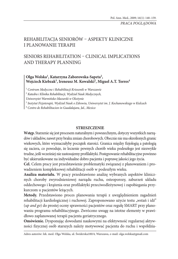 Pol. Ann. Med., 2009; 16(1): 148–159. PRACA POGLĄDOWA REHABILITACJA SENIORÓW – ASPEKTY KLINICZNE I PLANOWANIE TERAPII SENIORS REHABILITATION – CLINICAL IMPLICATIONS AND THERAPY PLANNING Olga Wolska1, Katarzyna Zaborowska-Sapeta2, Wojciech Kiebzak3, Ireneusz M. Kowalski2, Miguel A.T. Torres4 1 Centrum Medyczne i Rehabilitacji Kriosonik w Warszawie Katedra i Klinika Rehabilitacji, Wydział Nauk Medycznych, Uniwersytet Warmińsko-Mazurski w Olsztynie 3 Instytut Fizjoterapii, Wydział Nauk o Zdrowiu, Uniwersytet im. J. Kochanowskiego w Kielcach 4 Centro de Rehabilitacion in Guadalajara, Jal., Mexico 2 STRESZCZENIE Wstęp. Starzenie się jest procesem naturalnym i powszechnym, dotyczy wszystkich narządów i układów, nawet przy braku zmian chorobowych. Obecnie nie ma określonych granic wiekowych, które wyznaczałyby początek starości. Granica między fizjologią a patologią się zaciera, co powoduje, że leczenie pewnych chorób wieku podeszłego jest niezwykle trudne, jeśli wcześniej nie zastosujemy profilaktyki. Postępowanie rehabilitacyjne powinno być ukierunkowane na indywidualne dobro pacjenta i poprawę jakości jego życia. Cel. Celem pracy jest przedstawienie problematyki związanej z planowaniem i prowadzeniem kompleksowej rehabilitacji osób w podeszłym wieku. Analiza materiału. W pracy przedstawiono analizę wybranych aspektów klinicznych choroby zwyrodnieniowej narządu ruchu, osteoporozy, zaburzeń układu oddechowego i krążenia oraz profilaktyki przeciwodleżynowej i zapobiegania przykurczom u pacjentów leżących. Metody. Przedstawiono proces planowania terapii z uwzględnieniem zagadnień rehabilitacji kardiologicznej i ruchowej. Zaproponowano użycie testu „wstań i idź” (up and go) do prostej oceny sprawności pacjentów oraz regułę SMART przy planowaniu programu rehabilitacyjnego. Zwrócono uwagę na istotne elementy w prawidłowo zaplanowanej terapii pacjenta geriatrycznego. Omówienie. Dysponując dowodami naukowymi na efektywność regularnej aktywności fizycznej osób starszych należy motywować pacjenta do ruchu i współdziaAdres autorów: lek. med. Olga Wolska, ul. Świderska100/4, Warszawa, e-mail: [email protected] Rehabilitacja seniorów – aspekty kliniczne i planowanie terapii 149 łania. Rehabilitacja ma na celu poprawę ogólnego samopoczucia, zachowanie niezależnego trybu życia, zmniejszenie ryzyka zachorowania na niektóre choroby i łagodzenie ich przebiegu, działanie przeciwbólowe oraz minimalizację skutków niepełnosprawności. Dyskusja. Kompleksowa rehabilitacja osób starszych odnosi swe działania do każdego pacjenta w zakresie jego możliwości lokomocyjnych, działań przeciwbólowych, oddziaływań na sferę psychiczną oraz socjologiczną życia. Prawidłowo kierowana i systematyczna aktywność fizyczna w podeszłym wieku może poprawić zdrowie fizyczne i psychiczne, nawet jeśli nie powstrzymuje samego procesu starzenia. Zaopatrzenie ortopedyczne osób starszych zmniejsza ich niepełnosprawność. Poprawa motoryki, zdolność do samoobsługi i samodzielności przywraca pacjentom pewność siebie, wzmacnia integrację społeczną i kulturalną oraz umożliwia powrót do aktywności zawodowej. Wnioski. Pacjenci w podeszłym wieku są obciążeni licznymi schorzeniami i wymagają indywidualnego podejścia rehabilitacyjnego. Prawidłowo skonstruowany program usprawniania i fizykoterapii uwzględnia wszystkie czynniki wpływające na jakość życia seniora i wytycza cele usprawniania. Rehabilitacja powinna mieć charakter długofalowy, kompleksowy oraz zawierać elementy profilaktyki. ABSTRACT Introduction. Aging is a natural and prevalent process. It concerns all organs and systems, even if there are no signs of pathology. At present there is no age limit which indicates specifically the beginning of senility. The border between physiology and pathology is blurred; consequently, the treatment of some geriatric diseases is difficult, especially when preventive measures have not been taken. Rehabilitation should focus on personal well-being of the patients and improving their quality of life. Aim. The aim of this article is to discuss issues concerning the planning of complex rehabilitation of geriatric patients and its management. Materials and methods. This article analyses selected clinical aspects of: osteoarthritis, osteoporosis, pulmonary and circulatory disturbances, prevention of bedsore and contractures in bedridden patients. The process of planning the therapy, including cardiologic and orthopaedic rehabilitation, is presented. The application of the Get Up and Go Test to evaluate patients’ fitness and the SMART principle when planning a rehabilitation course is proposed. Essential factors in a correctly planned therapy of geriatric patients are emphasised. Discussion. Due to scientific evidence confirming the efficiency of regular physical activity in the case of senior patients, they should be motivated to undertake physical exercises and to cooperate. Rehabilitation aims at: improving general well–being, 150 O. Wolska, K. Zaborowska-Sapeta, W. Kiebzak, I.M. Kowalski, M.A.T. Torres allowing to maintain an independent way of life, reducing the risk of some diseases and easing their course, reducing pain and disability effects. Complex geriatric rehabilitation concerns every patient in terms of motion ability, pain release, as well as psychological and social spheres of life. Properly conducted and systematically undertaken physical activities can improve physical and mental health of senior patients, even though they do not stop the aging process itself. Orthopaedic devices for geriatric patients decrease their disability. Improvement in motor functioning, personal care skills and independence restores patients’ self-confidence, reinforces their social and cultural integration and allows them to become professionally active again. Conclusions. Geriatric patients suffer from various diseases a