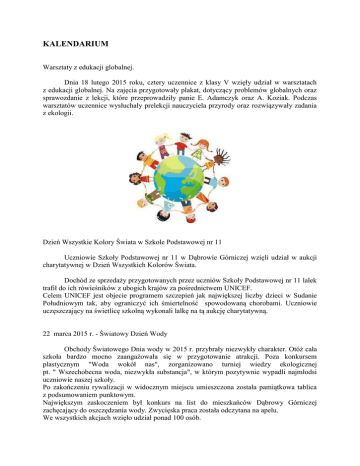 KALENDARIUM Warsztaty z edukacji globalnej. Dnia 18 lutego 2015 roku, cztery uczennice z klasy V wzięły udział w warsztatach z edukacji globalnej. Na zajęcia przygotowały plakat, dotyczący problemów globalnych oraz sprawozdanie z lekcji, które przeprowadziły panie E. Adamczyk oraz A. Koziak. Podczas warsztatów uczennice wysłuchały prelekcji nauczyciela przyrody oraz rozwiązywały zadania z ekologii. Dzień Wszystkie Kolory Świata w Szkole Podstawowej nr 11 Uczniowie Szkoły Podstawowej nr 11 w Dąbrowie Górniczej wzięli udział w aukcji charytatywnej w Dzień Wszystkich Kolorów Świata. Dochód ze sprzedaży przygotowanych przez uczniów Szkoły Podstawowej nr 11 lalek trafił do ich rówieśników z ubogich krajów za pośrednictwem UNICEF. Celem UNICEF jest objecie programem szczepień jak największej liczby dzieci w Sudanie Południowym tak, aby ograniczyć ich śmiertelność spowodowaną chorobami. Uczniowie uczęszczający na świetlicę szkolną wykonali lalkę na tą aukcję charytatywną. 22 marca 2015 r. - Światowy Dzień Wody Obchody Światowego Dnia wody w 2015 r. przybrały niezwykły charakter. Otóż cała szkoła bardzo mocno zaangażowała się w przygotowanie atrakcji. Poza konkursem plastycznym "Woda wokół nas", zorganizowano turniej wiedzy ekologicznej pt. " Wszechobecna woda, niezwykła substancja", w którym pozytywnie wypadli najmłodsi uczniowie naszej szkoły. Po zakończeniu rywalizacji w widocznym miejscu umieszczona została pamiątkowa tablica z podsumowaniem punktowym. Największym zaskoczeniem był konkurs na list do mieszkańców Dąbrowy Górniczej zachęcający do oszczędzania wody. Zwycięska praca została odczytana na apelu. We wszystkich akcjach wzięło udział ponad 100 osób. W związku z organizowanym przedsięwzięciem naszej gminy „Przekażmy młodzieży…” poszczególni uczniowie z klasy V i VI - 21 maja 2015r. - w auli Technicznych Zakładów Naukowych, zaprezentowali wraz z innymi wybranymi szkołami podstawowymi krótką inscenizację na temat rocznicy zakończenia II wojny światowej. Wracając do Projektu Edukacyjnego „Edukacja globalna-nieustające wyzwanie czy tracona szansa?” cztery uczennice z klasy piątej - Paulina Kluczny, Emilia Karwacińska, Kinga Szymczak, Natalia Kuberska wraz z opiekunami panią Edytą Adamczyk i panią Agnieszką Koziak, 25maja 2015r. wzięły udział w wycieczce do Parku Edukacji Globalnej „Wioski Świata” w Krakowie. Podczas wycieczki uczennice mogły obejrzeć mieszkania i domy z różnych stron świata a także zaprezentować w formie zabawy wiele ciekawostek na temat Szwajcarii - kraju, który zespół naszej szkoły wylosował, aby go odpowiednio przedstawić. W ramach tego projektu 8 czerwca 2015 r. grupa dziewcząt z klasy V weźmie udział w grze miejskiej „Poskramiacze globalnych wyzwań”. Odwiedzając poszczególne stacje, dziewczęta będą się zmagać z zadaniami dotyczącymi zagadnień edukacji globalnej w zakresie: ograniczonego dostępu do edukacji, słabego dostępu do wody pitnej uchodźctwa, nieodpowiedzialnej konsumpcji, niezrównoważonego rozwoju i nieetycznej mody. W ten sposób uczestnicy gry „Poskramiacze globalnej wyzwań” zdobędą wiedzę z zakresu globalnej współzależności oraz wpływu ich działania na procesy zachodzące na świecie. Konferencja podsumowująca ten projekt odbędzie się 15 czerwca 2015r. w Urzędzie Miejskim w Dąbrowie Górniczej. Zadaniem drużyny naszej szkoły będzie zaprezentowanie wylosowanej części świata. Uczniowie, którzy brali udział w „Interdyscyplinarnym Programie Edukacji Filmowej KinoSzkoła” w miesiącu czerwcu obejrzą w kinie „Kadr” w Pałacu Kultury Zagłębia w Dąbrowie Górniczej film, który zakończy naszą edukacje filmową w roku szkolnym 2014/2015. Dnia 2 czerwca 2015 r. o godz. 16.00 w naszej szkole odbył się koncert muzyczny: „Spotkanie z piosenką” z okazji Dnia Matki. W związku z tym wcześniej wszyscy uczniowie na zajęciach lekcyjnych redagowali zaproszenia dla swoich mam. ŹRÓDEŁKO POLECA Klasa V poleca: Redakcja "Źródełka" serdecznie poleca serię książek autora Andrzeja Maleszki pod tytułem: "Magiczne drzewo". Powieść "Magiczne drzewo i czerwone krzesło" zachęciła nas do sięgnięcia po następne tomy tej "magicznej" książki. Opowiada ona o trójce rodzeństwa, które nagle znajduje magiczne drzewo. Dzieci dopiero później odkrywają tajemnice tego okazałego mebla i dzięki niemu przeżywają niezwykłe przygody. Powieść kończy się szczęśliwie a krzesło odlatuje od właścicieli, by dalej przeżywać magiczne przygody. Natomiast nasi bohaterowie ruszają w dal. Redakcja poleca również książkę Dariusza Rekosza: "Pocztówka z Toronto". Śmierć, miłość, przyjaźń, pieniądze i wykluczenie społeczne - temu wszystkiemu musi sprostać Monika, uczennica przeciętnego gimnazjum, Jak daleko posunie się, aby pomóc mamie? Komu będzie można zaufać? Pełna ciepła, wzruszeń i niesamowitych zwrotów akcji książka pomoże zrozumieć decyzje, podejmowane przez młodych ludzi. WYWIADY ŹRÓDEŁKA Wywiad z uczennicą naszej szkoły - Natalią Kuberską, która zajęła I miejsce w VII Ogólnopolskim Konkursie Malarsko - Poetyckim: "Siedem grzechów głównych". Redakcja Źródełka: Natalia, ile zajęło Ci czasu na napisanie wierszy na konkurs? Natalia: Poświęciłam na napisanie jednego wiersza około 40 minut. R: Czy ktoś pomagał Ci w ich napisaniu? N: Mama i pani ucząca mnie języka polskiego. R: Co Cię natchnęło do napisania wierszy o takiej tematyce? N: Pani, która mnie uczy języka polskiego opowiedziała o konkursie: "Siedem grzechów głównych" i zaczęłam pisać. R: Jak się czułaś przed wejściem do studia radiowego? N: Oczywiście stresowałam się trochę. R: Natalka, czy będziesz dalej pisała wiersze? N: Oczywiście. R: Jakie tematyka interesuje Cię najbardziej, jeśli chodzi o pisanie utworów poetyckich? 