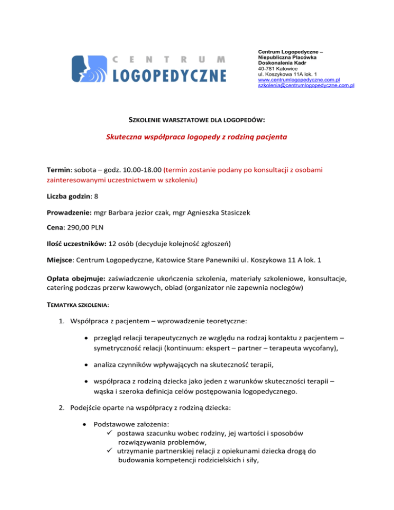 Centrum Logopedyczne – Niepubliczna Placówka Doskonalenia Kadr 40-781 Katowice ul. Koszykowa 11A lok. 1 www.centrumlogopedyczne.com.pl [email protected] SZKOLENIE WARSZTATOWE DLA LOGOPEDÓW: Skuteczna współpraca logopedy z rodziną pacjenta Termin: sobota – godz. 10.00-18.00 (termin zostanie podany po konsultacji z osobami zainteresowanymi uczestnictwem w szkoleniu) Liczba godzin: 8 Prowadzenie: mgr Barbara jezior czak, mgr Agnieszka Stasiczek Cena: 290,00 PLN Ilość uczestników: 12 osób (decyduje kolejność zgłoszeń) Miejsce: Centrum Logopedyczne, Katowice Stare Panewniki ul. Koszykowa 11 A lok. 1 Opłata obejmuje: zaświadczenie ukończenia szkolenia, materiały szkoleniowe, konsultacje, catering podczas przerw kawowych, obiad (organizator nie zapewnia noclegów) TEMATYKA SZKOLENIA: 1. Współpraca z pacjentem – wprowadzenie teoretyczne: przegląd relacji terapeutycznych ze względu na rodzaj kontaktu z pacjentem – symetryczność relacji (kontinuum: ekspert – partner – terapeuta wycofany), analiza czynników wpływających na skuteczność terapii, współpraca z rodziną dziecka jako jeden z warunków skuteczności terapii – wąska i szeroka definicja celów postępowania logopedycznego. 2. Podejście oparte na współpracy z rodziną dziecka: Podstawowe założenia: postawa szacunku wobec rodziny, jej wartości i sposobów rozwiązywania problemów, utrzymanie partnerskiej relacji z opiekunami dziecka drogą do budowania kompetencji rodzicielskich i siły, indywidualizacja pracy, terapia jako doświadczenie wzmacniające, ukierunkowujące na przyszłość, modelowanie myślenia skoncentrowanego na rozwiązaniach zamiast problemie. Źródła – przykłady podejść terapeutycznych opartych na współpracy z rodziną dziecka. 3. Praktyczne strategie pomocne w nawiązywaniu dobrego kontaktu z rodziną: wykorzystanie optymalnych zasad komunikowania się – doskonalenie umiejętności aktywnego słuchania, zidentyfikowanie barier w skutecznym komunikowaniu się, budowanie atmosfery bezpieczeństwa i wsparcia, wykorzystanie mocnych stron rodziny dla rozwiązania problemu, okazywanie zaufania i wiary w możliwości rozwiązania problemu dziecka przez rodziców – docenianie sukcesów, metoda przewartościowania, współpraca z rodziną w zakresie budowania i realizacji planu postępowania terapeutycznego – sposoby angażowania rodziny w formułowanie i realizację celów terapeutycznych. 4. Prezentacja i ćwiczenia kontaktu terapeutycznego z rodziną z wykorzystaniem metody videocoachingu. 5. Postawa wewnętrzna terapeuty jako stały element poddawany autorefleksji – podsumowanie szkolenia. Ważne! Osoby zainteresowane udziałem w szkoleniu proszone są o: 1. Sprawdzenie dostępności miejsc na szkoleniu. Kontakt: [email protected] lub nr tel. + 48 604 776 149; 2. Wypełnienie formularza zgłoszeniowego – dokument FORMULARZ ZGŁOSZENIOWY do pobrania na stronie: www.centrumlogopedyczne.com.pl, a następnie dokonanie wpłaty na konto Centrum Logopedycznego. Formularz zgłoszeniowy wraz z kopią dowodu wpłaty należy jak najszybciej odesłać na adres mailowy Centrum Logopedycznego. Wpłaty za udział w szkoleniu należy dokonywać w kwocie 290,00 PLN na konto: BRE Bank/MBank 13 1140 2004 0000 3502 3281 7635 Centrum Logopedyczne Katarzyna Węsierska 40-781 z dopiskiem: Warsztaty – współpraca logopedy z rodziną Katowice ul. Łąkowa 31 mgr Barbara Jeziorczak, logopeda, psycholog, socjolog. Zajmuje się terapią logopedyczną i psychologiczną dorosłych i dzieci. Współautorka przewodnika dla rodziców: Czy moje dziecko się jąka? oraz artykułów z zakresu logopedii i psychologii. W przeszłości zaangażowana w pracę z osobami jąkającymi podczas Intensywnych programów terapeutycznych dla dzieci, młodzieży oraz dorosłych jąkających się, organizowanych przez dra M. Chęćka. Brała udział w wielu szkoleniach dla psychologów i logopedów, m.in. z zakresu terapii krótkoterminowej, terapii rodziny i wykorzystania metody wideo treningu, a także w kursie: An Overview of Working with Children Who Stammer w The Miachel Palin Centre for Stammering Children w Londynie. mgr Agnieszka Stasiczek, psycholog, oligofrenopedagog, absolwentka Uniwersytetu Śląskiego i Politechniki Śląskiej. Swoje bogate doświadczenie zawodowe nabywała pracując w poradni psychologiczno-pedagogicznej i przedszkolach. Kilkukrotnie uczestniczyła w charakterze psychoterapeuty w Intensywnych programach terapeutycznych dla dzieci, młodzieży oraz dorosłych jąkających się, prowadzonych przez dra M. Chęćka. Od lat współpracuje z firmami doskonalenia zawodowego i wyższymi uczelniami, prowadząc szkolenia i wykłady z zakresu: komunikacji interpersonalnej, negocjacji i rozwiązywania konfliktów, asertywności, planowania i organizacji czasu, treningu kreatywności i przygotowywania klientów do wystąpień publicznych. Specjalizuje się w terapii problemów emocjonalnych dzieci i młodzieży z zaburzeniami mowy oraz ich rodzin, zajmuje się zagadnieniami związanymi z rozwojem umiejętności osobistych i społecznych.