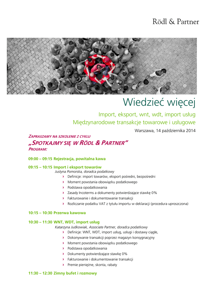 Wiedzieć więcej Import, eksport, wnt, wdt, import usług Międzynarodowe transakcje towarowe i usługowe Warszawa, 14 października 2014 ZAPRASZAMY NA SZKOLENIE Z CYKLU „SPOTKAJMY SIĘ W RÖDL & PARTNER” PROGRAM: 09:00 – 09:15 Rejestracja, powitalna kawa 09:15 – 10:15 Import i eksport towarów Justyna Pomorska, doradca podatkowy › Definicje: import towarów, eksport pośredni, bezpośredni › › › › › Moment powstania obowiązku podatkowego Podstawa opodatkowania Zasady Incoterms a dokumenty potwierdzające stawkę 0% Fakturowanie i dokumentowanie transakcji Rozliczanie podatku VAT z tytułu importu w deklaracji (procedura uproszczona) 10:15 – 10:30 Przerwa kawowa 10:30 – 11:30 WNT, WDT, import usług Katarzyna Judkowiak, Associate Partner, doradca podatkowy › Definicje: WNT, WDT, import usług, usługi i dostawy ciągłe, › › › › › › Dokonywanie transakcji poprzez magazyn konsygnacyjny Moment powstania obowiązku podatkowego Podstawa opodatkowania Dokumenty potwierdzające stawkę 0% Fakturowanie i dokumentowanie transakcji Premie pieniężne, skonta, rabaty 11:30 – 12:30 Zimny bufet i rozmowy Import, eksport, wnt, wdt, import usług Międzynarodowe transakcje towarowe i usługowe Warszawa, 14 październik 2014 PROWADZĄCY Katarzyna Judkowiak Associate Partner, doradca podatkowy tel.: + 48 22 244 00 28 e-mail: [email protected] Justyna Pomorska Doradca podatkowy tel.: + 48 22 244 00 18 e-mail: [email protected] Absolwentka Europejskiego Uniwersytetu Viadrina we Frankfurcie nad Odrą. Stypendystka Uniwersytetu Republiki w Montevideo (Urugwaj). Specjalista w zakresie międzynarodowego prawa podatkowego. Doświadczony wykładowca w zakresie VAT oraz podatków dochodowych. Autorka i współautorka licznych publikacji książkowych w zakresie podatków, w tym ponad 1200-stronicowej publikacji „VAT 2014. Komentarz dla praktyków” wydawnictwa ODDK. Jej najnowsze publikacje to „Samochód w firmie. Instruktaż opodatkowania VAT, CIT, PIT” oraz „Podatek VAT – instruktaż rozliczania z podatkami” wydawnictwa ODDK. Z Rödl & Partner związana od roku 2005. Posługuje się językiem angielskim, niemieckim i hiszpańskim. Absolwentka studiów prawniczych Katolickiego Uniwersytetu Lubelskiego Jana Pawła II w Lublinie. Specjalizuje się w tematyce VAT, ze szczególnym uwzględnieniem zasad opodatkowania podatkiem VAT transakcji wewnątrzwspólnotowych, importu i eksportu. Współautorka obszernej publikacji „VAT 2014. Komentarz dla praktyków”. Autorka licznych artykułów prasowych o tematyce podatkowej, publikowanych na łamach „Gazety Prawnej” oraz współautorka publikacji m.in. „VAT 2014. Komentarz dla praktyków” oraz Samochód w firmie. Instruktaż opodatkowania VAT, CIT, PIT” wydawnictwa ODDK. Z Rödl & Partner związana od roku 2008. Włada językiem angielskim. TERMIN I ZGŁOSZENIA Spotkanie zostanie przeprowadzone w języku polskim w dniu 14 października 2014 r. w godzinach 9:00-12:30 w biurze Rödl & Partner w Warszawie, ul. Sienna 73. Zgłoszenia przyjmuje: Joanna Dzieł fax: + 48 22 696 28 01 e-mail: [email protected] Termin nadsyłania zgłoszeń upływa 9 października 2014 r. Koszt uczestnictwa wynosi: 200 zł + 23% VAT za osobę. Dla klientów Rödl & Partner koszt uczestnictwa wynosi 100 zł + 23% VAT. Uczestnikom zapewniamy przerwy kawowe oraz zimny bufet. Informujemy także, że ilość miejsc jest ograniczona, a warunkiem uczestnictwa jest otrzymanie mailem potwierdzenia o rejestracji. ZGŁOSZENIE Import, eksport, wnt, wdt, import usług Międzynarodowe transakcje towarowe i usługowe Warszawa, 14 października 2014 r., 9:00-12:30 ………………………………………………………………………………………………...... firma ………………………………………………………………………………………………...... imię i nazwisko uczestnika ………………………………………………… . e-mail ………………… telefon …………….. fax ………………………………………………………………………………………………...... adres: ulica, numer ……………………………………………………………… adres: miasto …………………… data ……………………...... podpis Zgłoszenia przyjmujemy: mailem na adres: faksem na numer: [email protected] +48 22 696 28 01 ……………………….......... kod pocztowy Warunkiem uczestnictwa jest otrzymanie mailem potwierdzenia o zarejestrowaniu uczestnika. Koszt uczestnictwa wynosi 200 PLN + VAT za osobę. Dla klientów Rödl & Partner koszt uczestnictwa wynosi 100 zł + 23% VAT za osobę. Uczestnikom zapewniamy przerwy kawowe oraz zimny bufet. Informujemy, że ilość miejsc jest ograniczona. Decyduje kolejność zgłoszeń. Wysłanie zgłoszenia jest równoznaczne z akceptacją przetwarzania danych osobowych i kontaktowych do celów związanych ze szkoleniami jak również promocją usług spółek grupy Rödl & Partner.