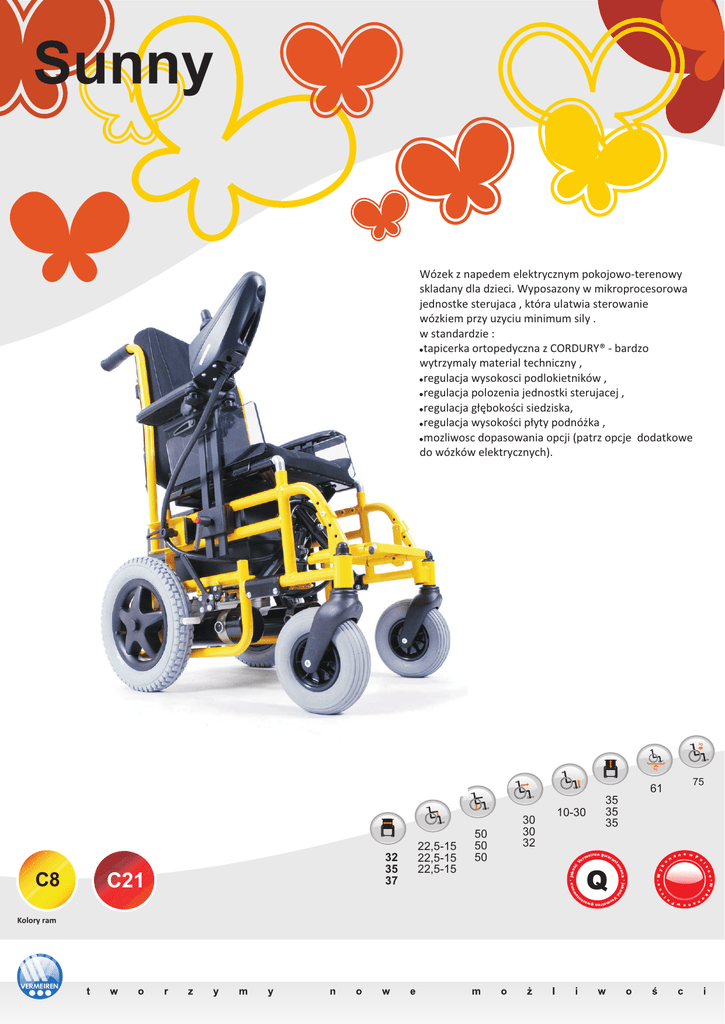 Sunny Wózek z napedem elektrycznym pokojowo-terenowy skladany dla dzieci. Wyposazony w mikroprocesorowa jednostke sterujaca , która ulatwia sterowanie wózkiem przy uzyciu minimum sily . w standardzie : !tapicerka ortopedyczna z CORDURY® - bardzo wytrzymaly material techniczny , !regulacja wysokosci podlokietników , !regulacja polozenia jednostki sterujacej , !regulacja g³êbokoœci siedziska, !regulacja wysokoœci p³yty podnó¿ka , !mozliwosc dopasowania opcji (patrz opcje dodatkowe do wózków elektrycznych). 75 61 o c e*W y k o l rm Ve æ o s a n e w P na * jakoœ e w a n P W y c e* k wa to n n an s eiren gwar an Kolory ram eiren gwar o rm Ve l C21 22,5-15 22,5-15 22,5-15 30 30 32 35 35 35 na * jakoœ wa æ to C8 32 35 37 50 50 50 10-30 Konstrukcja wózka umo¿liwia ³atwy i szybki sposób demonta¿u poszczególnych czêœci i z³o¿enie. Nawet ma³e auto nie stanowi problemu je¿eli chodzi o przestrzeñ ³adunkow¹. Wózek podró¿uje razem z w³aœcicielem. BRAND F A B R I C Do wykonania tapicerki wykorzystaliœmy materia³ CORDURA®. Jest to techniczny materia³ wysokogatunkowy bardzo mocny i wytrzyma³y na otarcia. Poliamid pokryty pow³ok¹ poliuretanow¹ z apretur¹ Teflonu®, nieprzepuszczaj¹c¹ wody. Cordura jest rejestrowan¹ chronion¹ mark¹ firmy DuPont® jako odporny na uszkodzenia materia³ markowy. Wykorzystywany do produkcji odzie¿y w sportach ekstremalnych i w wojsku. Dla osób . które potrzebuj¹ inne materia³y mamy skaj oraz soft. Wózek g³ównie przeznaczony do u¿ywania wewn¹trz pomieszczeñ ale dziêki mocnej jednostce napêdowej (200 W) mo¿na go z powodzeniem u¿ywaæ równie¿ na zewn¹trz. Dla dzieci wymagaj¹cych specyficznych rozwi¹zañ konstrukcyjnych odpowiadaj¹cym ich fizycznej kondycji mamy wiele rozwi¹zañ opcjonalnych , które u³atwi¹ u¿ywanie ale równie¿ zagwarantuj¹ wysoki komfort. Proszê skontaktowaæ siê z nami aby dowiedzieæ siê wiêcej na temat opcji dodatkowych lub odwiedziæ nasz¹ stronê www.vermeiren.pl cordura soft skaj 2x12V/44 Ah 2x200W 10 (17%) 30 km 6 km/h 1,5cm 140 cm tapicerka t w o r z y m y n o w e m o ¿ l i w o œ c i