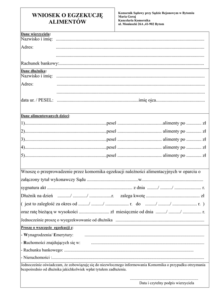 WNIOSEK O EGZEKUCJĘ ALIMENTÓW Komornik Sądowy przy Sądzie Rejonowym w Bytomiu Maria Goraj Kancelaria Komornika ul. Moniuszki 26A ,41-902 Bytom Dane wierzyciela: Nazwisko i imię: ............................................................................................................................... Adres: ............................................................................................................................... ............................................................................................................................... Rachunek bankowy:............................................................................................................................ Dane dłużnika: Nazwisko i imię: ............................................................................................................................... Adres: ............................................................................................................................... ............................................................................................................................... data ur. / PESEL: ......................................................................imię ojca.......................................... Dane alimentowanych dzieci: 1)......................................................................pesel .......................................alimenty po ............. zł 2)......................................................................pesel ...................................... alimenty po ............. zł 3)......................................................................pesel ...................................... alimenty po ............. zł 4)......................................................................pesel ...................................... alimenty po ............. zł 5)......................................................................pesel ...................................... alimenty po ............. zł Wnoszę o przeprowadzenie przez komornika egzekucji należności alimentacyjnych w oparciu o załączony tytuł wykonawczy Sądu ............................................w..................................................... sygnatura akt ......................................................................... z dnia ........./ ........../ ....................... r. Dłużnik na dzień .........../ ............/ ...................r. zalega kwotę .............................................. zł ( jest to zaległość za okres od ........./ ........../ .................... r. do ........./ ........../ ..................... r. ) oraz ratę bieżącą w wysokości .......................... zł miesięcznie od dnia ........./ ........../ ................ r. Jednocześnie proszę o wyegzekwowanie od dłużnika ............................................................................ Proszę o wszczęcie egzekucji z: - Wynagrodzenia/ Emerytury: - Ruchomości znajdujących się w: ............................................................................................................... ......................................................................................................... - Rachunku bankowego: ........................................................................................................................ - Nieruchomości :............................................................................................................................................. Jednocześnie oświadczam, że zobowiązuję się do niezwłocznego informowania Komornika o przypadku otrzymania bezpośrednio od dłużnika jakichkolwiek wpłat tytułem zadłużenia. ..................................................................... Data i czytelny podpis wierzyciela