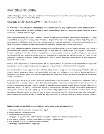 KMP ZIELONA GÓRA Źródło: http://zgora.lubuska.policja.gov.pl/go2/serwis-informacyjny/aktualnosci/16001,Sezon-motocyklowy-rozpoczety.html Wygenerowano: Sobota, 4 marca 2017, 06:27 SEZON MOTOCYKLOWY ROZPOCZĘTY…. W minioną sobotę oficjalnie rozpoczęto sezon motocyklowy. Czy tegoroczny będzie bezpieczny? To pytanie zadają sobie zarówno policjanci jak i motocykliści. Wszyscy zgodnie zapewniają, że zrobią wszystko, aby tak właśnie było. Mimo, że pogoda niezbyt sprzyjała, na parkingu Centrum Rekreacyjno-Sportowego w Zielonej Górze motocykliści z całego województwa zainaugurowali kolejny sezon. Wreszcie po długim okresie zimowym, mogli wyjechać na drogi. Oczywiście na parkingu podczas oficjalnego otwarcia sezonu motocyklowego nie mogło zabraknąć także zielonogórskich policjantów, w tym także patrolu motocyklowego. Ponadto policyjna eskorta pilotowała przejazd motocyklistów przez miasto. Jak co roku policjanci spotkali się przy Centrum Rekreacyjno-Sportowym z motocyklistami, aby przypomnieć im o zasadach bezpiecznego zachowania na drogach, a także o tym, że będą zwracali większą uwagę na to, jak jeżdżą motocykliści. Dodatkowo policjanci mieli dla zebranych niespodziankę – przeprowadzili konkurs z nagrodami. Uczestnicy konkurencji sprawnościowych mieli do przejechania wyznaczony przez policjantów odcinek, ale warunkiem było, aby zrobić to… jak najwolniej! Dodatkowo uczestnicy musieli odpowiedzieć także na pytania dotyczące bezpieczeństwa w ruchu drogowym. Chętnych nie brakowało. Konkurs został zorganizowany w ramach projektu KIK 76 „Bezpieczeństwo w ruchu drogowym” współfinansowanego przez Szwajcarię w ramach szwajcarskiego programu współpracy z nowymi krajami członkowskimi Unii Europejskiej. Zwycięzcą konkursu okazał się pan Radosław z Gubina, który otrzymał w nagrodę kask motocyklowy. Pan Rafał z Zielonej Góry wywalczył rękawice, a pięciu innych uczestników otrzymało pasy odblaskowe: pan Marcin z Gubina, pan Michał z Konradowa, pan Jakub z Otynia oraz dwaj zielonogórzanie pan Paweł i pan Andrzej. Wszystkim wyróżnionym gratulujemy wiedzy i umiejętności. Okazję jaką jest inauguracja sezonu, policjanci wykorzystali do przypomnienia o konieczności zachowania zasad bezpieczeństwa na drogach, a także o tym, że motocyklista jest tzw. niechronionym uczestnikiem ruchu drogowego (nie chroni go karoseria samochodu) i dlatego powinien w szczególny sposób zadbać o swoje bezpieczeństwo. Z policyjnych obserwacji wynika, że bardzo często młodzi kierowcy, którzy dopiero niedawno zdobyli uprawnienia do kierowania motocyklem, popisują się zbyt szybką czy też brawurową jazdą zapominając o możliwych konsekwencjach takiego zachowania. Niestety często brawura nie idzie w parze z umiejętnościami i wyobraźnią, dlatego policjanci prosili o przestrzeganie zasad bezpieczeństwa i rozsądek, aby w przyszłym roku na kolejnym rozpoczęciu sezonu nikogo nie zabrakło. Jadąc motocyklem czy skuterem pamiętajmy o zachowaniu zasad bezpieczeństwa: ● dostosuj prędkość do warunków panujących na drogach ● nie jedź slalomem między pojazdami ● zawsze zakładaj kask ochronny ● pamiętaj o odzieży ochronnej - niedopuszczalna jest jazda w krótkich spodenkach, klapkach i bez kasku ● samo ubranie ochronne i kask nie zapewnią bezpieczeństwa – jedź ostrożnie ● zwracaj uwagę na innych uczestników ruchu drogowego ● przestrzegaj przepisów kodeksu drogowego ● nie przeceniaj swoich umiejętności ● nie ryzykuj na drodze, nawet niegroźna kolizja czy wywrotka grozi utratą zdrowia lub życia ● nie siadaj za kierownicę po alkoholu lub narkotykach Ocena: 1/5 (2) Tweetnij