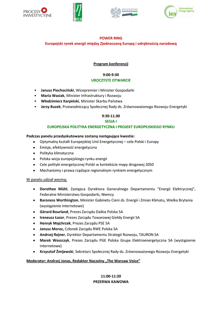 POWER RING Europejski rynek energii między Zjednoczoną Europą i odrębnością narodową Program konferencji 9:00-9:30 UROCZYSTE OTWARCIE • • • • Janusz Piechociński, Wicepremier i Minister Gospodarki Maria Wasiak, Minister Infrastruktury i Rozwoju Włodzimierz Karpiński, Minister Skarbu Państwa Jerzy Buzek, Przewodniczący Społecznej Rady ds. Zrównoważonego Rozwoju Energetyki 9:30-11.00 SESJA I EUROPEJSKA POLITYKA ENERGETYCZNA I PROJEKT EUROPEJSKIEGO RYNKU Podczas panelu przedyskutowane zostaną następujące kwestie: Optymalny kształt Europejskiej Unii Energetycznej – cele Polski i Europy Emisje, efektywność energetyczna Polityka klimatyczna Polska wizja europejskiego rynku energii Cele polityki energetycznej Polski w kontekście mapy drogowej 2050 Mechanizmy i prawa rządzące regionalnym rynkiem energetycznym W panelu udział wezmą: Dorothee Mühl, Zastępca Dyrektora Generalnego Departamentu "Energii Elektrycznej", Federalne Ministerstwo Gospodarki, Niemcy Baroness Worthington, Minister Gabinetu Cieni ds. Energii i Zmian Klimatu, Wielka Brytania (wystąpienie internetowe) Gérard Bourland, Prezes Zarządu Dalkia Polska SA Ireneusz Łazor, Prezes Zarządu Towarowej Giełdy Energii SA Henryk Majchrzak, Prezes Zarządu PSE SA Janusz Moroz, Członek Zarządu RWE Polska SA Andrzej Rejner, Dyrektor Departamentu Strategii Rozwoju, TAURON SA Marek Woszczyk, Prezes Zarządu PGE Polska Grupa Elektroenergetyczna SA (wystąpienie internetowe) Krzysztof Żmijewski, Sekretarz Społecznej Rady ds. Zrównoważonego Rozwoju Energetyki Moderator: Andrzej Jonas, Redaktor Naczelny „The Warsaw Voice” 11:00-11:20 PRZERWA KAWOWA 11:20-13:00 SESJA II Polska premiera raportu „WORLD ENERGY OUTLOOK 2014” oraz debata „Energia jądrowa w europejskiej polityce energetycznej i klimatycznej” Wystąpienie specjalne: Fatih Birol, Główny Ekonomista Międzynarodowej Agencji Energetycznej – polska premiera raportu „World Energy Outlook 2014”. Prezentacja raportu będzie połączona z debatą pt.: „Energia jądrowa w europejskiej polityce energetycznej i klimatycznej” W panelu udział wezmą: Janusz Piechociński, Wicepremier i Minister Gospodarki Dominique Ristori, Dyrektor Generalny DG ds. Energii, Komisja Europejska Fatih Birol, Główny Ekonomista Międzynarodowej Agencji Energetycznej Bruno Blotas, Wiceprezes ds. Rozwoju Biznesu w Polsce i krajach Bałtyckich, AREVA SA Gavin Dobbing, Business Development Manager, AMEC Foster Wheeler Jacek Cichosz, Prezes Zarządu PGE EJ 1 Moderator: Wojciech Hann, Partner, Deloitte 13:00-13:20 PRZERWA NA POCZĘSTUNEK 13:20-14:50 SESJA III: BUSINESS CASE: CZY EUROPA BEZ REINDUSTRIALIZACJI MOŻE POZOSTAĆ KONKURENCYJNA NA RYNKU? Podczas panelu przedyskutowane zostaną następujące kwestie: Model rynku europejskiego z punktu widzenia przemysłu Plany europejskie 2020-2030 a polskie możliwości realizacji Jak Europa może wzmacniać swoją konkurencyjność na rynku energii? Górnictwo W panelu udział wezmą: Maciej Bielecki, Dyrektor Sprzedaży do Sektora Energetycznego, Hewlett-Packard Polska Andrzej Dycha, Podsekretarz Stanu w Ministerstwie Gospodarki (do potwierdzenia) Wojciech Hann, Partner, Deloitte Leszek Juchniewicz, Wiceprzewodniczący Społecznej Rady ds. Zrównoważonego Rozwoju Energetyki Henryk Jacek Kaliś, Przewodniczący Forum Odbiorców Energii Elektrycznej i Gazu Mirosław Kowalik, Dyrektor Sprzedaży i Marketingu, ALSTOM Sp. z o.o. Grzegorz Onichimowski, Przedstawiciel na Polskę Enernoc Maciej Sokołowski, Dyrektor Departamentu Prawa Energetycznego w Kancelarii Prawniczej Maciej Panfil i Partnerzy Roman Szwed, Prezes Zarządu ATENDE SA Tomasz Ślęzak, Country Manager, ArcelorMittal SA Adam Witek, Prezes Energetyka sp z o.o w Lubinie oraz WPEC S.A. w Legnicy, Grupa KGHM Moderator: Wojciech Jakóbik, Redaktor naczelny, BiznesAlert.pl 14:50-15:10 PRZERWA KAWOWA 15:10-16:30 PANEL SPECJALNY: Debata pt. „INNOWACYJNOŚĆ NA ODSIECZ ZRÓWNOWAŻONEGO ROZWOJU”* Podczas panelu przedyskutowane zostaną następujące kwestie: Droga do pogodzenia ochrony klimatu z konkurencyjnością Napędy rozwoju lokalnego – działania rozproszone Energetyka prosumencka Energetyka gminna Mikrosieci inteligentne Itp. Od zatrudnienia przez wartość dodaną do produktu krajowego W panelu udział wezmą: Mariusz Kajka, Ekspert-Konsultant Biznesowy ds. Energetyki, Hewlett-Packard Polska Piotr Kacejko, Rektor Politechniki Lubelskiej Marek Maniecki, Wiceprezes Zarządu, Globema Sp. z o.o. Bożena Wróblewska, Ekspert Forum Rozwoju Efektywnej Energii (FREE) oraz Szefowa działu Innowacji GASPOL ENERGY Krzysztof Żmijewski, Sekretarz Społecznej Rady ds. Zrównoważonego Rozwoju Energetyki Moderator: Marina Coey, Prezes Zarządu, Procesy Inwestycyjne *Panel zrealizowano w ramach Projektu SDZP dofinansowanego ze środków Narodowego Centrum Badań i Rozwoju oraz Narodowego Funduszu Ochrony Środowiska i Gospodarki Wodnej w ramach programu „Gekon”. .