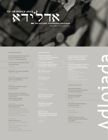 12–16 marca 2013 dni kultury żydowskiej adlojada Biografia i świadectwo 12 marca (wtorek) 13 marca (środa) Zachodniopomorskie Centrum Doskonalenia Nauczycieli (ul. gen. J. Sowińskiego 68) Muzeum Narodowe w Szczecinie (Gmach Główny, ul. Wały Chrobrego 3) Interpretacje dzienników getta warszawskiego Warsztaty Sympozjum z okazji 70. rocznicy powstania w getcie warszawskim. Świadectwa 11.00–12.00 Zagłada w literaturze polskiej Sławomir Buryła 10.00–10.30 Zło a życie wieczne Ireneusz Ziemiński 12.15–13.00 Emanuel Ringelblum, Kronika getta warszawskiego Piotr Krupiński 10.30–11.00 Sens pomimo zła Jaromir Brejdak 17.00–18.30 Piśmiennictwo getta w kanonie szkolnym. Od Zdążyć przed Panem Bogiem do I była miłość w getcie Dyskusja panelowa Anna Kondracka-Zielińska, Ireneusz Statnik, Magdalena Wasielewska, Jerzy Wojcieszak Prowadzenie Sławomir Iwasiów 11.00–11.30 Dyskusja 14 marca (czwartek) 13.15–14.00 Mary Berg, Dziennik z getta warszawskiego Ewelina Tota Muzeum Historii Szczecina, Oddział Muzeum Narodowego w Szczecinie (Ratusz Staromiejski, ul. ks. Mściwoja II 8) 17.00–18.30 Wokół Pięciu ksiąg Tory Pawła Śpiewaka (Wydawnictwo Uniwersytetu Warszawskiego, Warszawa 2012) Rozmowa z autorem, Ingą Iwasiów, ks. Cezarym Korcem Prowadzenie Jerzy Madejski 18.30–20.00 „Wspomnień czar” Koncert piosenek z repertuaru Wiery Gran Śpiew Ewa Filipowicz-Kosińska Akompaniament Krzysztof Baranowski Wprowadzenie Aleksandra Grzemska 11.30–12.00 Przerwa kawowa 12.00–12.30 Żydowscy Kolumbowie Historia zapomniana Sławomir Buryła Zachodniopomorskie Centrum Doskonalenia Nauczycieli (ul. gen. J. Sowińskiego 68) Muzeum Narodowe w Szczecinie (Gmach Główny, ul. Wały Chrobrego 3) Żydowskie biografie – artyści i ich dzieła Wykłady 12.30–13.00 Literatura o Zagładzie Problem autorstwa Piotr Weiser 17.00–17.45 Uczniowie Strzemińskiego Przyjaciele Żydzi Anna Saciuk-Gąsowska 13.00–13.30 Bokser i śmierć Motyw walki w dyskusji nad przedstawialnością Zagłady Paweł Wolski 17.45–18.00 Przerwa kawowa 13.30–14.00 Dyskusja 18.00–18.45 „Ocalić od zapomnienia” Artyści getta warszawskiego i ich sztuka Magdalena Tarnowska 12–16 marca 2013 dni kultury żydowskiej adlojada Biografia i świadectwo 15 marca (piątek) Muzeum Narodowe w Szczecinie (Gmach Główny, ul. Wały Chrobrego 3) 18.00–19.00 Koncert muzyki żydowskiej Wykonanie Chór Ton Art Dyrygent Andrzej Potapczuk secesja café w czasie dni kultury żydowskiej adlojada przygotuje specjalne menu kuchni żydowskiej Duo Chalil Peter Müntel, Ralf Winkelmann Ostatni utwór wykonany z Chórem Okręgowej Izby Lekarskiej Remedium 16 marca (sobota) Muzeum Narodowe w Szczecinie (Gmach Główny, ul. Wały Chrobrego 3) 12.00–13.00 Projekcja filmu Wybrany (reż. Weronika Fibich, Adam Ptaszyński, 2011) Wprowadzenie twórcy dokumentu 13.00–14.00 Biografie. Wokół filmu Wybrany Dyskusja panelowa Eryk Krasucki, Weronika Fibich, Adam Ptaszyński Prowadzenie Piotr Krupiński Secesja Café (al. Papieża Jana Pawła II 19/1) 16.00–17.30 Pieśni żydowskie Koncert Przygotowanie Ewa Filipowicz-Kosińska Wykonanie uczniowie Zespołu Szkół Muzycznych im. Feliksa Nowowiejskiego w Szczecinie Agata Porczak, Anna Kozioł, Bartosz Juszczak, Wojciech Pieńkowski, Joanna Wojtowicz, Małgorzata Cofta Akompaniament Mirosława Białas ydowski Instytut Historyczny im. Emanuela Ringelbluma