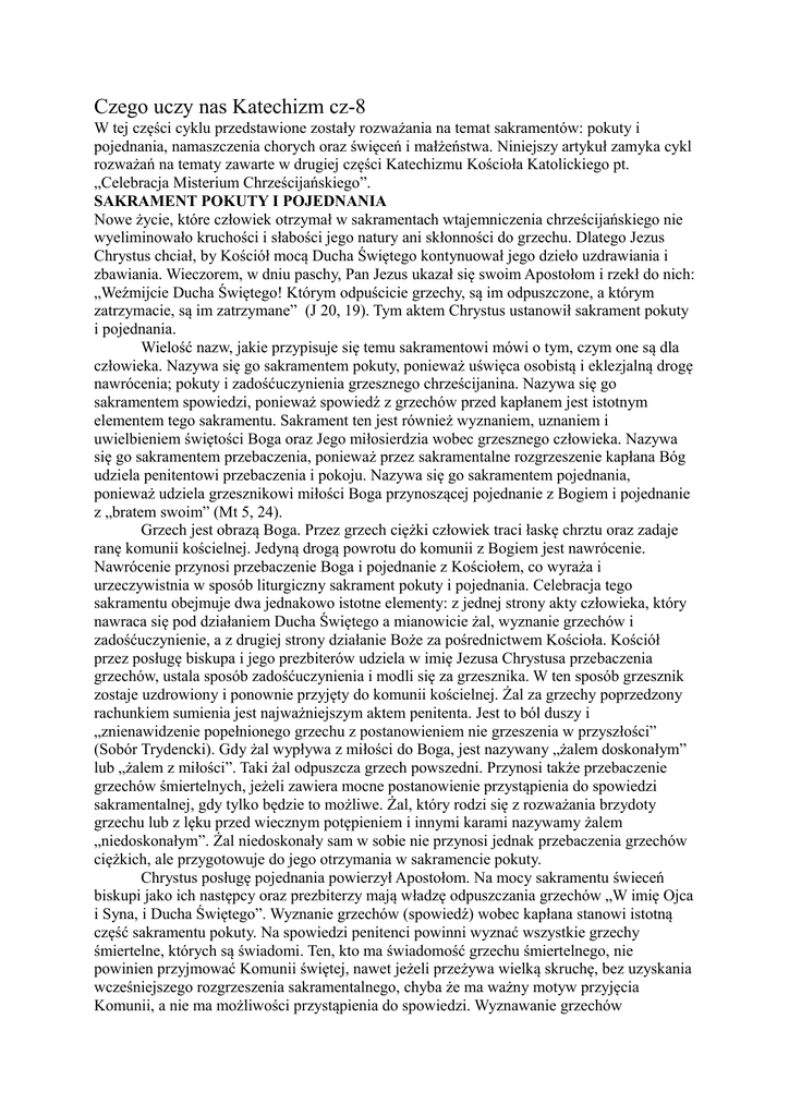 Czego uczy nas Katechizm cz-8 W tej części cyklu przedstawione zostały rozważania na temat sakramentów: pokuty i pojednania, namaszczenia chorych oraz święceń i małżeństwa. Niniejszy artykuł zamyka cykl rozważań na tematy zawarte w drugiej części Katechizmu Kościoła Katolickiego pt. „Celebracja Misterium Chrześcijańskiego”. SAKRAMENT POKUTY I POJEDNANIA Nowe życie, które człowiek otrzymał w sakramentach wtajemniczenia chrześcijańskiego nie wyeliminowało kruchości i słabości jego natury ani skłonności do grzechu. Dlatego Jezus Chrystus chciał, by Kościół mocą Ducha Świętego kontynuował jego dzieło uzdrawiania i zbawiania. Wieczorem, w dniu paschy, Pan Jezus ukazał się swoim Apostołom i rzekł do nich: „Weźmijcie Ducha Świętego! Którym odpuścicie grzechy, są im odpuszczone, a którym zatrzymacie, są im zatrzymane” (J 20, 19). Tym aktem Chrystus ustanowił sakrament pokuty i pojednania. Wielość nazw, jakie przypisuje się temu sakramentowi mówi o tym, czym one są dla człowieka. Nazywa się go sakramentem pokuty, ponieważ uświęca osobistą i eklezjalną drogę nawrócenia; pokuty i zadośćuczynienia grzesznego chrześcijanina. Nazywa się go sakramentem spowiedzi, ponieważ spowiedź z grzechów przed kapłanem jest istotnym elementem tego sakramentu. Sakrament ten jest również wyznaniem, uznaniem i uwielbieniem świętości Boga oraz Jego miłosierdzia wobec grzesznego człowieka. Nazywa się go sakramentem przebaczenia, ponieważ przez sakramentalne rozgrzeszenie kapłana Bóg udziela penitentowi przebaczenia i pokoju. Nazywa się go sakramentem pojednania, ponieważ udziela grzesznikowi miłości Boga przynoszącej pojednanie z Bogiem i pojednanie z „bratem swoim” (Mt 5, 24). Grzech jest obrazą Boga. Przez grzech ciężki człowiek traci łaskę chrztu oraz zadaje ranę komunii kościelnej. Jedyną drogą powrotu do komunii z Bogiem jest nawrócenie. Nawrócenie przynosi przebaczenie Boga i pojednanie z Kościołem, co wyraża i urzeczywistnia w sposób liturgiczny sakrament pokuty i pojednania. Celebracja tego sakramentu obejmuje dwa jednakowo istotne elementy: z jednej strony akty człowieka, który nawraca się pod działaniem Ducha Świętego a mianowicie żal, wyznanie grzechów i zadośćuczynienie, a z drugiej strony działanie Boże za pośrednictwem Kościoła. Kościół przez posługę biskupa i jego prezbiterów udziela w imię Jezusa Chrystusa przebaczenia grzechów, ustala sposób zadośćuczynienia i modli się za grzesznika. W ten sposób grzesznik zostaje uzdrowiony i ponownie przyjęty do komunii kościelnej. Żal za grzechy poprzedzony rachunkiem sumienia jest najważniejszym aktem penitenta. Jest to ból duszy i „znienawidzenie popełnionego grzechu z postanowieniem nie grzeszenia w przyszłości” (Sobór Trydencki). Gdy żal wypływa z miłości do Boga, jest nazywany „żalem doskonałym” lub „żalem z miłości”. Taki żal odpuszcza grzech powszedni. Przynosi także przebaczenie grzechów śmiertelnych, jeżeli zawiera mocne postanowienie przystąpienia do spowiedzi sakramentalnej, gdy tylko będzie to możliwe. Żal, który rodzi się z rozważania brzydoty grzechu lub z lęku przed wiecznym potępieniem i innymi karami nazywamy żalem „niedoskonałym”. Żal niedoskonały sam w sobie nie przynosi jednak przebaczenia grzechów ciężkich, ale przygotowuje do jego otrzymania w sakramencie pokuty. Chrystus posługę pojednania powierzył Apostołom. Na mocy sakramentu świeceń biskupi jako ich następcy oraz prezbiterzy mają władzę odpuszczania grzechów „W imię Ojca i Syna, i Ducha Świętego”. Wyznanie grzechów (spowiedź) wobec kapłana stanowi istotną część sakramentu pokuty. Na spowiedzi penitenci powinni wyznać wszystkie grzechy śmiertelne, których są świadomi. Ten, kto ma świadomość grzechu śmiertelnego, nie powinien przyjmować Komunii świętej, nawet jeżeli przeżywa wielką skruchę, bez uzyskania wcześniejszego rozgrzeszenia sakramentalnego, chyba że ma ważny motyw przyjęcia Komunii, a nie ma możliwości przystąpienia do spowiedzi. Wyznawanie grzechów powszednich nie jest samo w sobie konieczne, niemniej jest przez Kościół zalecane. Regularne spowiadanie się z grzechów powszednich pomaga nam kształtować nasze sumienia, walczyć ze złymi skłonnościami i czynić postępy w życiu duchowym. Grzesznik uwolniony z grzechu powinien uczynić coś, co naprawi skutki jego grzechu. Ten akt nazywa się „zadośćuczynieniem” lub „pokutą”. Pokuta może mieć różne formy. Ojcowie Kościoła kładą nacisk na trzy formy: post, modlitwę i jałmużnę. Wyrażają one nawrócenie w odniesieniu do samego siebie, do Boga i do innych ludzi. Każdy kapłan, który spowiada, zobowiązany jest do zachowania absolutnej tajemnicy odnośnie do grzechów wyznawanych przez penitentów oraz wiadomości o życiu penitentów, jakie uzyskał w czasie spowiedzi. Tajemnica ta, która nie dopuszcza żadnych wyjątków, nazywa się „pieczęcią sakramentalną”. Skuteczność pokuty polega na przywróceniu nam łaski Bożej i zjednoczeniu nas w przyjaźni z Bogiem. W szczególności skutkami sakramentu pokuty są: pojednanie z Bogiem, pojednanie z Kościołem, darowanie kary wiecznej spowodowanej przez grzechy śmiertelne, darowanie kar doczesnych, pokój i pogoda sumienia oraz pociecha duchowa, wzrost sił duchowych do walki, jaką musi prowadzić chrześcijanin. W przypadkach koniecznych (gdy na przykład zachodzi bliskie niebezpieczeństwo śmierci) można zastosować wspólnotową celebrację pojednania z ogólną spowiedzią i ogólnym rozgrzeszeniem, z zachowaniem przepisów Kościoła. W takim przypadku wierni, dla ważności rozgrzeszenia, muszą postanowić wyspowiadać się indywidualnie ze swoich ciężkich grzechów, gdy tylko będą mieli do tego okazję. Darowanie kary doczesnej można uzyskać, pod pewnymi warunkami, za pośrednictwem