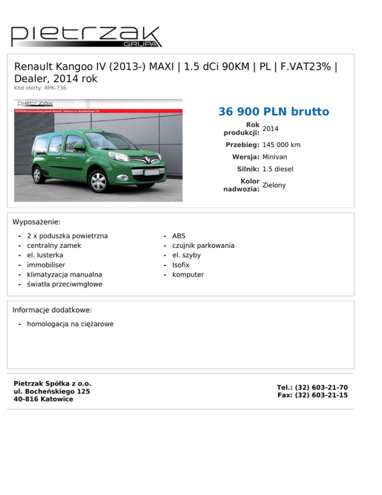 Renault Kangoo IV (2013-) MAXI | 1.5 dCi 90KM | PL | F.VAT23% | Dealer, 2014 rok Kod oferty: RPK-736 36 900 PLN brutto Rok 2014 produkcji: Przebieg: 145 000 km Wersja: Minivan Silnik: 1.5 diesel Kolor Zielony nadwozia: Wyposażenie: - 2 x poduszka powietrzna centralny zamek el. lusterka immobiliser klimatyzacja manualna światła przeciwmgłowe - ABS czujnik parkowania el. szyby Isofix komputer Informacje dodatkowe: - homologacja na ciężarowe Pietrzak Spółka z o.o. ul. Bocheńskiego 125 40-816 Katowice Tel.: (32) 603-21-70 Fax: (32) 603-21-15