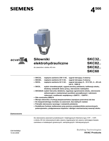 4 Siłowniki elektrohydrauliczne do zaworów o skoku 40 mm 566 SKC32.. SKC82.. SKC62.. SKC60 • SKC32.. • SKC82.. • SKC6.. • • • • • • • napięcie zasilania 230 V AC, sygnał sterujący 3-stawny napięcie zasilania 24 V AC, sygnał sterujący 3-stawny napięcie zasilania 24 V AC, sygnał sterujący 0…10 V DC, 4…20 mA lub 0...1000 Ω SKC6.. wybór charakterystyki, sygnał zwrotny położenia, kalibracja skoku, diodowy wskaźnik stanu pracy, sterowanie nadrzędne SKC62UA wybór kierunku działania, regulacja ograniczenia skoku, sterowanie sekwencyjne z nastawianym punktem początkowym i zakresem roboczym, możliwość współpracy z QAF21.. i QAF61.. Siła nominalna 2800 N Wersje siłownika z funkcją bezpieczeństwa (sprężyna powrotna) lub bez Do bezpośredniego montażu na zaworach, bez żadnych nastaw Pokrętło sterowania ręcznego i wskaźnik położenia Dodatkowe funkcje realizowane przy pomocy przełączników pomocniczych, potencjometru, podgrzewacza trzpienia i dźwigni mechanicznej rewersji skoku Zastosowanie Do sterowania zaworami przelotowymi i trójdrogowymi Siemens typu VVF.. i VXF.. o skoku 40 mm stosowanymi jako zawory regulacyjne lub zawory odcinające bezpieczeństwa w instalacjach grzewczych, wentylacyjnych i klimatyzacyjnych. CM1N4566pl 13.02.2009 Building Technologies HVAC Products Zestawienie typów Napięcie zasilania Typ Standardowa elektronika SKC32.60 SKC32.61 Sygnał sterujący Sprężyna powrotna Funkcja Czas tak 18 s 230 V AC SKC82.60 3-stawny SKC82.60U * SKC82.61 SKC82.61U * SKC62 24 V AC SKC62U * SKC60 Wzbogacona elektronika Funkcje Zamyk. dodatkowe Czas przebiegu Otwier. SKC62UA * 0...10 V DC, 4...20 mA, lub 0...1000 Ω 120 s tak 18 s tak 20 s 120 s 20 s tak tak 1) 20 s 1) Kierunek działania, ograniczenie skoku, sterowanie sekwencyjne, dodanie sygnału * wersje z certyfikatem UL Wyposażenie dodatkowe Zamawianie Typ Opis Do siłownika ASC1.6 Przełącznik pomocniczy SKC6.. Miejsce do montażu 1 x ASC 1.6 ASC9.3 Podwójny przełącznik pomocniczy ASZ7.3 Potencjometr 1000 Ω ASZ7.31 Potencjometr 135 Ω SKC32.. SKC82.. ASZ7.32 Potencjometr 200 Ω 1 x ASC9.3 lub 1 x ASZ7.3 lub 1 x ASZ7.31 lub 1 x ASZ7.32 ASZ6.5 Podgrzewacz trzpienia 24 V AC SKC.. 1 x ASZ6.5 Przy zamawianiu należy podać ilość, nazwę i oznaczenie typu urządzenia oraz wymagane wyposażenie dodatkowe. Przykład: 1 siłownik SKC32.50 1 potencjometr ASZ7.31 Dostawa Siłownik, zawór i wyposażenie dodatkowe dostarczane są w oddzielnych opakowaniach i nie są zmontowane. Części zamienne Wykaz części zamiennych – patrz strona 16. Urządzenia współpracujące Typ zaworu Średnica DN Ciśnienie PN kvs [m3/h] Karta katalog. Zawory przelotowe VV... (zawory regulacyjne lub odcinające): VVF21.. kołnierzowe 100 6 124…160 N4310 VVF31.. kołnierzowe 100…150 10 124…315 N4320 VVF40.. kołnierzowe 100…150 16 124…315 N4330 VVF41.. kołnierzowe 65…150 16 49…300 N4340 VVF45.. kołnierzowe 65…150 16 49…300 N4345 VVF61.. kołnierzowe 65…150 40 49…300 N4382 Zawory trójdrogowe VX... (zawory regulacyjne realizujące «mieszanie» i «rozdzielanie»): VXF21.. kołnierzowe 100 6 124…160 N4410 VXF31.. kołnierzowe 100 10 124…315 N4420 VXF40.. kołnierzowe 100…150 16 124…315 N4430 VXF41.. kołnierzowe 65…150 16 49…300 N4440 VXF61.. kołnierzowe 65…150 40 49…300 N4482 Dopuszczalne różnice ciśnienia ∆pmax i ciśnienia zamykające ∆ps dla zaworu z siłownikiem podane są w kartach katalogowych zaworów. 2/16 Building Technologies HVAC Products Siłowniki elektrohydrauliczne CM1N4566pl 26.06.2008 Uwaga Można też stosować zawory innych producentów o skoku 12…40 mm, pod warunkiem, że realizują one funkcję bezpieczeństwa «zawór zamknięty w stanie bez zasilania» oraz posiadają odpowiednie przyłącze mechaniczne do zamocowania siłownika. Do ograniczenia skoku siłowników SKC32.. i SKC82.., sygnał Y1 musi być doprowadzony poprzez dodatkowy nastawialny wyłącznik krańcowy (ASC9.3). Potrzebne informacje można uzyskać w lokalnych biurach i oddziałach Siemens. Zasada działania siłowników elektrohydraulicznych 1 4567Z02 4567Z01 Budowa i działanie 2 3 4 5 6 7 8 9 10 11 12 1 Pokrętło sterowania ręcznego 2 Cylinder ciśnieniowy 3 Zbiornik oleju 4 Sprężyna powrotna 5 Solenoidalny zawór zwrotny 6 Pompa hydrauliczna 7 Tłok 8 Komora ciśnieniowa 9 Wskaźnik położenia (0 do 1) 10 Przyłącze zaworu (łącznik) 11 Trzpień zaworu 12 Grzybek zaworu Zawór zamknięty Zawór otwarty Otwieranie zaworu Pompa hydrauliczna (6) tłoczy olej ze zbiornika (3) do komory ciśnieniowej (8), przez co następuje przemieszczanie cylindra ciśnieniowego (2) w dół. Trzpień zaworu (11) wsuwa się i zawór się otwiera. Jednocześnie napręża się sprężyna powrotna (4). Zamykanie zaworu Otwarcie zaworu zwrotnego (5) powoduje wypływanie oleju z komory ciśnieniowej z powrotem do zbiornika. Naprężona sprężyna powrotna przemieszcza cylinder ciśnieniowy do góry. Trzpień zaworu wysuwa się i zawór się zamyka. Tryb sterowania ręcznego Poprzez obracanie dźwigni na pokrętle sterowania ręcznego (1) w kierunku zgodnym z kierunkiem ruchu wskazówek zegara, następuje przemieszczanie komory ciśnieniowej w dół i otwieranie zaworu. Jednocześnie napręża się sprężyna powrotna. W trybie sterowania ręcznego, sygnały sterujące Y i Z mogą bardziej otworzyć zawór, ale nie mogą go przestawić do położenia «0%» skoku. Aby utrzymać ręcznie ustawioną pozycję, należy wyłączyć zasilanie lub odłączyć sygnały sterujące Y i Z. Na wskaźniku położenia widoczna jest tarcza z podziałką wskazującą aktualne położenie. Uwaga: Regulator w trybie pracy ręcznej Gdy regulator zostanie przełączony na pracę ręczną na dłuższy okres czasu, to zalecamy ustawienie siłownika w wymaganym położeniu za pomocą dźwigni sterowania ręcznego. Dzięki temu, siłownik będzie w tym czasie pozostawał w tak ustawionym położeniu