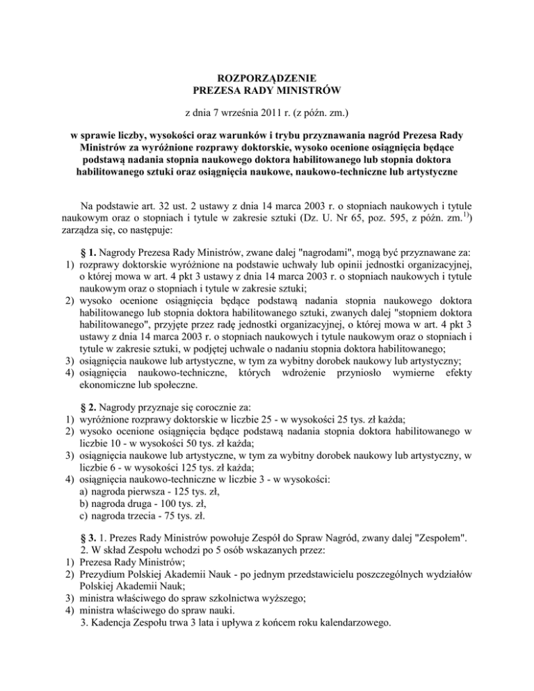 ROZPORZĄDZENIE PREZESA RADY MINISTRÓW z dnia 7 września 2011 r. (z późn. zm.) w sprawie liczby, wysokości oraz warunków i trybu przyznawania nagród Prezesa Rady Ministrów za wyróżnione rozprawy doktorskie, wysoko ocenione osiągnięcia będące podstawą nadania stopnia naukowego doktora habilitowanego lub stopnia doktora habilitowanego sztuki oraz osiągnięcia naukowe, naukowo-techniczne lub artystyczne Na podstawie art. 32 ust. 2 ustawy z dnia 14 marca 2003 r. o stopniach naukowych i tytule naukowym oraz o stopniach i tytule w zakresie sztuki (Dz. U. Nr 65, poz. 595, z późn. zm. 1)) zarządza się, co następuje: § 1. Nagrody Prezesa Rady Ministrów, zwane dalej "nagrodami", mogą być przyznawane za: 1) rozprawy doktorskie wyróżnione na podstawie uchwały lub opinii jednostki organizacyjnej, o której mowa w art. 4 pkt 3 ustawy z dnia 14 marca 2003 r. o stopniach naukowych i tytule naukowym oraz o stopniach i tytule w zakresie sztuki; 2) wysoko ocenione osiągnięcia będące podstawą nadania stopnia naukowego doktora habilitowanego lub stopnia doktora habilitowanego sztuki, zwanych dalej "stopniem doktora habilitowanego", przyjęte przez radę jednostki organizacyjnej, o której mowa w art. 4 pkt 3 ustawy z dnia 14 marca 2003 r. o stopniach naukowych i tytule naukowym oraz o stopniach i tytule w zakresie sztuki, w podjętej uchwale o nadaniu stopnia doktora habilitowanego; 3) osiągnięcia naukowe lub artystyczne, w tym za wybitny dorobek naukowy lub artystyczny; 4) osiągnięcia naukowo-techniczne, których wdrożenie przyniosło wymierne efekty ekonomiczne lub społeczne. 1) 2) 3) 4) 1) 2) 3) 4) § 2. Nagrody przyznaje się corocznie za: wyróżnione rozprawy doktorskie w liczbie 25 - w wysokości 25 tys. zł każda; wysoko ocenione osiągnięcia będące podstawą nadania stopnia doktora habilitowanego w liczbie 10 - w wysokości 50 tys. zł każda; osiągnięcia naukowe lub artystyczne, w tym za wybitny dorobek naukowy lub artystyczny, w liczbie 6 - w wysokości 125 tys. zł każda; osiągnięcia naukowo-techniczne w liczbie 3 - w wysokości: a) nagroda pierwsza - 125 tys. zł, b) nagroda druga - 100 tys. zł, c) nagroda trzecia - 75 tys. zł. § 3. 1. Prezes Rady Ministrów powołuje Zespół do Spraw Nagród, zwany dalej "Zespołem". 2. W skład Zespołu wchodzi po 5 osób wskazanych przez: Prezesa Rady Ministrów; Prezydium Polskiej Akademii Nauk - po jednym przedstawicielu poszczególnych wydziałów Polskiej Akademii Nauk; ministra właściwego do spraw szkolnictwa wyższego; ministra właściwego do spraw nauki. 3. Kadencja Zespołu trwa 3 lata i upływa z końcem roku kalendarzowego. 4. W przypadku nienależytego wypełniania obowiązków przez członka Zespołu, rezygnacji członka Zespołu z uczestniczenia w jego pracach lub zaistnienia okoliczności uniemożliwiających członkowi Zespołu wypełnianie obowiązków, Prezes Rady Ministrów może odwołać go przed upływem kadencji. W miejsce odwołanego członka Zespołu właściwy organ wskazuje nowego członka na okres do końca kadencji. 5. Przewodniczącego Zespołu powołuje, spośród członków Zespołu, i odwołuje Prezes Rady Ministrów. 6. Przewodniczący Zespołu może: 1) powoływać podzespoły problemowe; 2) zlecać ekspertom właściwym ze względu na przedmiot sprawy, w tym ekspertom zagranicznym, przygotowanie recenzji lub opinii na temat wyróżnionych rozpraw doktorskich, wysoko ocenionych osiągnięć będących podstawą nadania stopnia doktora habilitowanego, osiągnięć naukowych lub artystycznych, w tym wybitnego dorobku naukowego lub artystycznego, oraz osiągnięć naukowo-technicznych, zgłoszonych do nagród. 7. (uchylony). 8. Członkostwa w Zespole nie można łączyć z członkostwem w Zespole do Spraw Nagród powołanym na podstawie przepisów wydanych na podstawie art. 32 ust. 5 ustawy z dnia 14 marca 2003 r. o stopniach naukowych i tytule naukowym oraz o stopniach i tytule w zakresie sztuki. 9. Tryb pracy Zespołu określa regulamin ustalony przez Zespół. 1) 2) 3) 4) § 4. Do zadań Zespołu należy: opiniowanie wniosków o przyznanie nagród, zwanych dalej "wnioskami", pod względem formalnym; opiniowanie pod względem merytorycznym wyróżnionych rozpraw doktorskich, wysoko ocenionych osiągnięć będących podstawą nadania stopnia doktora habilitowanego, osiągnięć naukowych lub artystycznych, w tym wybitnego dorobku naukowego lub artystycznego, oraz osiągnięć naukowo-technicznych, zgłoszonych do nagród; ocena wniosków; przedstawianie Prezesowi Rady Ministrów propozycji dotyczących przyznania nagród wraz z uzasadnieniem. § 5. 1. Za udział w posiedzeniu Zespołu przysługuje wynagrodzenie: 1) dla przewodniczącego Zespołu - w wysokości 570 zł; 2) dla pozostałych członków Zespołu - w wysokości 380 zł. 2. Ekspertom przygotowującym recenzje lub opinie, o których mowa w § 3 ust. 6 pkt 2, przysługuje wynagrodzenie w wysokości 380 zł za każdą recenzję lub opinię. 3. Przewodniczącemu i członkom Zespołu za opiniowanie, o którym mowa w § 4 pkt 2, zgłoszonych w jednym wniosku wyróżnionych rozpraw doktorskich, wysoko ocenionych osiągnięć będących podstawą nadania stopnia doktora habilitowanego, osiągnięć naukowych lub artystycznych, w tym wybitnego dorobku naukowego lub artystycznego, oraz osiągnięć naukowo-technicznych przysługuje wynagrodzenie w wysokości 380 zł. 4. Zamiejscowym członkom Zespołu przysługuje zwrot kosztów podróży na zasadach określonych w przepisach wydanych na podstawie art. 775 § 2 ustawy z dnia 26 czerwca 1974 r. - Kodeks pracy (Dz. U. z 1998 r. Nr 21, poz. 94, z późn. zm.). § 6. Obsługę Zespołu zapewnia Kancelaria Prezesa Rady Ministrów. 1) 2) 3) 4) § 7. Wnioski mogą składać - w przypadku nagród za: wyróżnione rozprawy doktorskie - jednostki organizacyjne uprawnione do nadawania stopnia naukowego doktora lub stopnia doktora sztuki, wysoko ocenione osiągnięcia będące podsta