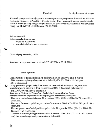 Protokoi do uiytku wewn^trznego Kontroli przeprowadzonej zgodnie z ramowym rocznym planem kontroli na 2008r.w Referacie Finansow i Podatkow Urz^du Gminy Psary przez glownego specialist? d/s kontroli wewne.trznej Malgorzate. Grzeszna^na podstawie upowaznienia Wojta Gminy Psary Nr SKW0913 - 10/08 zdnia 27.10.2008r. Zakres kontroli: 1 .Gospodarka finansowa: - wydatki budzetowe - zagadnienia kadrowo - placowe Okres objety kontrola^ 2007r. Kontrol? przeprowadzono w dniach 27.10.2008r. - 05.11.2008r. Dane ogolne : Urzajd Gminy w Psarach dziala na podstawie art.33 ustawy z dnia 8 marca 1990r. o samorzajdzie gminnym (tekst jednolity Dz.U z 2001r. Nr 142 poz. 1591 z pozn.zm.) Urzaji prowadzi gospodark? finansow^ na zasadach okreslonych dla jednostek budzetowych w ustawie z dnia 30 czerwca 2005r. o finansach publicznych (Dz.U.Nr 249 poz.2104 z pozn.zm.) Kontrol? w Referacie Finansow i Podatkow Urz?du Gminy Psary przeprowadzono na podstawie nast^puja^cych przepisow prawnych: - Ustawa o rachunkowosci z dn. 29 wrzesnia 1994r. (D.U z 2002r. Nr 76 poz. 694 z pozn.zm.) - Ustawa o finansach publicznych z dnia 30 czerwca 2005r.( Dz.U.Nr 249 poz.2104 z pozn.zm.) - Ustawa prawo zamowien publicznych z dnia 29 stycznia 2004r.( Dz.U z 2006r Nr 164 poz. 1163 z pozn.zm.) - Ustawa o samorzajdzie gminnym z dnia 8 marca 1990r.( Dz.U 01.142.1591 z pozn. zm) i w oparciu o przepisy wewnetrzne jednostki. Ustalenia kontroli 1 .Budzet gminy na 2007r. Uchwalony przez Rad? Gminy w dniu 30 stycznia 2007r.Uchwal^Nr V/20/2007, po stronie dochodow budzetowych zamykal si? kwota^ 18.795.920zi, przychody stanowity kwot? 2.519.500zi, a po stronie wydatkow budzetowych kwota_ 19.851.618zt. oraz rozchodow 1.463.802zl. - na splat? zaciajmietego kredytu w G6rnosla_skim Banku Gospodarczym na przebudow? nawierzchni na ul. Kolejowej w Grodkowie, kredytow zaci^gni?tych w ING Bank Sla_ski na remont budynku stacji wodoci^gowej w Gorze Siewierskiej, modernizacj? drogi dojazdowej do pol ul. Podwale w Strzyzowicach, na termomodernizacj? Szkoly Podstawowej w Sarnowie, kredytow zacia£ni?tych w BOS w Katowicach na termomodernizacj? budynku Szkory Podstawowej w Grodkowie i termomodernizacj? budynku GOK w Grodkowie. W wyniku wprowadzonych zmian budzet Gminy na dzieri 31.12.2007r. wynosil po stronie dochodow budzetowych 19.802.081,14zl, a po stronie wydatkow budzetowych 22.271.050,14zt. Zmiany zwie_kszaja,ce i zmniejszaja^ce budzet Gminy wprowadzane byly uchwalami Rady Gminy oraz zarzadzeniami Wqjta. 2.Sprawdzono wyrywkowo faktury z 2007r. pod wzgl^dem terminowosci placenia, pod wzgl^dem celowosci dokonywania wydatkow oraz racjonalnego gospodarowania srodkami budzetowymi: - FVAT 3130006367 z dn. 02.04.2007r. za oswietlenie uliczne w okresie - 28.02-28.03.2007r. nakwot? 27.053,27zt. Termin 18.04.2007r.- zapl 13.04.07r. FVAT3130008914zdn. 02.05.2007r. za oswietlenie uliczne w okresie 28.03.07r. do 26.04.2007r. na kwote. 20.227,36zt. Termin 18.05.07r. - zapl. 16.05.2007r. - FVAT48/2007 z dn. 14.06.2007r. dot. fak. koncowej za chodnik przy ul. Szkolnej w Psarach III etap na kwot? 86.787,98zt. Termin 14.07.07r. - zapi. 02.07.2007r. FVAT3130013258 z dn. 02.07.2007r. za oswietlenie uliczne w Gminie Psary od 28.05-30.06.07r. na kwot? 17.481,94zt. Termin 20.07.07r. - zapl. 19.07.2007r. - FVATS/000645/07 z dn. 05.07.2007r. na wykonanie instalacji CO. w Budynku Komunalnym w Dabiu 1 na kwot? 29.28Ozl.termin 26.07.2007r. - zapl. 26.07.07r. - FVAT3130000044 z dn. 01.08.2007r. na kwot? 11.934,47zl. za oswietlenie uliczne w okresie 01.07-25.07.07r. Termin 17.08.07r. - zapl. 16.08.2007r. - FVAT3130005008 z dn. 03.09.2007r. za oswietlenie uliczne na kwot? 17.646,57zl. w okresie 25.07- 30.08.07r. Termin 21.09.07r. - zapl. 20.09.2007r. - FVAT07485/POS/03-0000-SKR-P-10/07zdn. 5.11.2007r. za przesylki pocztowe nadane w Urz?dzie Gminy w pazdzierniku 2007r. na kwot? 2.603,35zl. Termin 7dni-zapl. 13.11.2007r. - - FVATRF/4zdn. 13.11.2007r. z ZGK Psary refaktura za zuzycie energii elektrycznej w stacji uzdatniania wody w Malinowicach na kwote, 9.159,28zl. w okresie 20.09-30.10.2007r. - termin 27.11.07r. - 23.11.2007r. FVATNr 01/75/07 z dnia 30.11.2007r. z PTHU „ Interpromex" za sprzatanie przystankow zgodnie z umowa. 1.800,81 zt. PP342/99/2006 termin 17.12.2007r.zapiatal2.12.2007r. - FVAT3130010597 z dn. 29.11.2007r. za oswietlenie uliczne w okresie 26.10- - 27.11.2007r. nakwot? 33.101,72zl. Termin 13.12.2007r. - zap*. 12.12.2007r. FVAT08359/POS/03-0000-SKR-P-11/07 z dnia 05.12.2007r. za nadanie listow w listopadzie z Urz?du Gminy Psary termin 7 dni - zapl. 14.12.2007r. - FVAT0370/07/FVS z dnia 17.12.2007r. za kalendarze jako art. promocyjne w zwiazku z XXXV- leciem Gminy na kwote, 4.026zl. Termin 31.12.2007r.przelew31.12.2007r. 3.Sprawdzono prawidtowosc rozliczania ryczaftow w 2007r. za miesia^ce styczeri, luty, marzec, kwiecieri i sierpien. Wszystkie zostaly rozliczone zgodnie z umowq, 4.Sprawdzono wyrywkowo umowy zawarte w 2007r.: - Umow? o dzielo z dnia 01.10.2007r. z Panem Andrzejem HorzeH Zaklad Rem.Bud. na wykonanie kompl. biurek z dostawka_2 szt. kontenerow biurowych, 4szt. odbojnic sciennych do pok. 213 oraz 2 szt. biurek, 2 szt. kontenerow biurowych 4 szt. odbojnic do pok. 204. w okresie od 01.10.07-10.10.2007r. Wynagr. 4.148zh - Umow? zlecenie Nr 38/2007 z dn. 16.07.2007r. A Panem A. Pawlikiem na petaienie nadzoru zgodnie z obowiazuja^cymi przepisami nadzoru inwestorskiego nad „ Remontem nawierzchni drogi gminnej przy ul. Poprzecznej w Grodkowie" Nadzor inwestorski w okresie od 24.07-09.10.2007r. wynagrodzenie - 5.500zt.brutto. Umow? zlec. Nr 2/2007r. z 02.01.2007r. z P.W ,,Zamex" z siedziba^ w Miasteczku Sla^skim na abonament roczny dotycza^cy: 1 .Przeprowadzanie wylapywania bezdomnych wat?saja_cych si? psow na terenie Gminy Psary . 2.Wykonywania wywozu wylapywanych psow do schroniska. 3.0bjazdu jeden raz w miesi^cu tj.do 20-go kazdego miesia^ca terenu Gminy Psary i wylapywanie bezdomnych wat?sajacych si? psow. Wynagrodzenie ryczaitowe w kwocie 4.000zt. w tym 