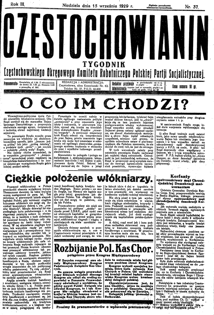 Rok 111. Niedziela dnia 15 września 1929 r. O p la ta p o c z to w a u isz c z o n a ry c z a łte m . Nr. 37. TYGODNI K (w liitlim litii Nw u m p loiiisii Eiiiliiiziii Pilsłiti Piilfl hiiilM miej. DfPflllinfllflłg« K w a rta ln ie rlu ilU illelfllB » zl. 1.30. Z o d n o s z e n ie m do d o m u Zł. 1.65. gr. R o c z n ie 5.20 z p rz e s y łk ą zł. 860. REDAKCJA i ADMINISTRACJA: Częstochowa, ulica Koszciuszki Nr. 62. TelefonNr. 37. P.K.O. 66.600 iMaMoi pizpBje : Pipą"ird'ii,ki „°d63zt fldntinlflfpüniöi c z y n n a Jm ululMlilW j e s t w c z w a r tk i, p ią tk i i so - I 1 [BDI HEB lß er. O CO IM C H O D Z I ? Wewnętrzno-polityczne życie Pol Posunięcie to ocenić należy ' w ski oświetliła błyskawica sensacji. Oto świetle ogólnego nastawienia polityki Rząd zwrócił się do marszałka Sejmu „pomajowej“ a przy omawaniu jego Ignacego Daszyńskiego -z propozycją istoty i znaczenia, w pierwszym rzę omówienia szeregu spraw, związanych dzie, oprzeć się trzeba na trzechletz techniką obrad najbliższej kadencji niem doświadczeniu Rządów „czwar tej brygady”. A ponieważ omawiany sejmowej. To posunięcie Rządu oceniła prasa krok Rządu odnosi się bezpośrednio sanacyjna we właściwy jej służalczo- do prac Sejmu, przeto znaczenie tego bezmyślny sposób, jako „jeszcze jed kroku nie może być omawiane w oder ną próbę“ lub jako „próbę ostatnią”, waniu od ogólnego stanowiska „pomaa podstaw tych „prób" — jak zwykle jowego systemu rządzenia w stosunku do prac i wysiłków ludowego przed — położyła „dobrą wolę” Rządu. ' Nie należy chyba uzasadniać, że stawicielstwa Stanowisko to polegało i polega na te wszystkie „przyczynki” i „komen tarze” sprzedajnej prasy rządowej > ą ńw iadoipm -L systesątycznęłą. lekce-.. kompletnie-bezwartościowe i że oce ważeniu’ znaczenia i roli Sejmu w pańny ostatniego wystąpienia Rządu gdżie stwowem Żyoiu Polski. Ilekroć też Rząd zwracał się do Sejmu z jakąś 'indziej szukać należy. propozycją lub żądaniem, tylekreć Sejm niezgłaszania wniosków przy druglem musiał dobrze baczyć, jaki to „chwyt“ czytaniu ustaw i t. p. kryje się za tem pozornie lojalnem W zamierzeniach Rządu mogą le postępowaniem władzy wykonawczej. Rząd wszystko zrobił, aby utrudnić żeć dwie wzajemnie wykluczające sic intencje: Sejmowi pracę: ustawy zgłaszał.zapóżno, nie dawał dostatecznych materja1) albo Rząd traktuje swój ostatni łów ą skoro Sejm żądał odnośnych krok, jako nowy sposób zdyskredyto uzupełnień, miotano nań gromy, że wania Sejmu lub obniżenia, jego zna opóźnia uchwalenie ustaw o pierwszo- czenia i w tym wypadku natrafi na rzędnem dla Państwa znaczeniu, że nie zdecydowany - opór -demokratycznej dorósł do swej roli, że jest do niczego. lewicy z P.P.S, na czele, 2) albo" też W tych warunkach należy przy Rząd doprawdy chce współpracy z ostatniem posunięciu Rządu zachować Sejmem, ale i w tym wypadków ostro jak najdalej idąćą ostrożność. Ostroż żność P. P.S. będzie wielka* bo „tiirneo ność ta jest.tembardziej wskazana. że. Danaos, ac dena- ferentes",(strzeżcie Rząd w propozycji swej wyraźnie zmie się Danaów, nawet wtedy,’ gdy dary rza: do nowego ograniczenia Upraw przynoszą). nień poselskich, wysuwając żądanie Ciężkie położenie włókniarzy. Przemysł włókienniczy w Polsęe przechodzi obecnie wyjątkowy kryzys. Tłomaczono dawniej, że takie kryzysy muszą następować co parę lat. Tak mówiono w pierwszych latach niepod ległości Polski, gdy uciskany ciągłym kryzysem włókniarz nie mógł się do czekać konjuktury dobrej t. zw. „cza sów tłóstych”. Minęło dziewięć lat nie podległego bytu państwowego i o ile sięgniemy pamięcią wstecz to stwier dzimy, że w każdym z tych dziesięciu lat panował kryzys, którego cały cię żar spychano na barki klasy robot niczej. W tej atmosferze ciągłego kry zysu, tak wszystkie rządy po sobie następujące jak i przemysłowcy trzy mali robotników, aby zarobki ich utrżymać na najniższym poziomie. Nie wątpliwie utrata takiego rynku zbytu na towary włókiennicze jak: cała ol brzymia Rosja wpłynęła rujnująco na ten przemysł. Niema bowiem obecnie nasz przemysł włókienniczy tak po ważnego odbiorcy towarów, jakiem był rynek rosyjski. Rządom polskim nie zależało na nawiązaniu stosunków handlowych z Rosją, chciano najwi doczniej w ten sposób podkreślić wrogie stanowisko do ich politycznej władzy państwowej. Tę rolę „stróża”, który miał przeciwstawiać się Rosji przed systematycznym wkraczaniem na zachód spełniano należycie. Anglja zawarła traktak handlowy z sowietami* następnie niemcy, Szwec ja, włochy łotwa i t. d. Polska pomi mo ie jest blizkim sąsiadem Rosji do tychczas traktatu handlowego nie po-; siada. Trudności nawiązania stosun ków handlowych z sowietami s ą ; już d z iśd la n aa tru d n e.g d y żp o c zą tk o w o sowiety zadowolniły się- kredytem krótkoterminowymi, a z biegiem- cza su w miarę potęgującej się konku K o rfanty opatrznościowy mąż Chrzeacjańsklej Demokracji mal wersantem rencji handlowej żądają kredytu bar le fabryk idzie 4 dni. w tygodniu to dzo długiego. Rzecz prosta — co mo łatwo stwierdzić, jak daleko zarobek Ostatnio Generalna Dyrekcja Banże Anglja, czy Niemcy nie będzie mo w tym przemyśle nie wystarczy na n , P' ^ rai- przeprowadziła rewizję gła przy takiej gospodarce jak do konieczne wydatki rodziny robotniczej. w Banku Śląskim, którego prezesem tychczas Polska. Tak długich kredy Nie chcę pisać o tym jak wycho tów jak dać mogą te państwa, nie wuje się klasa robotnicza w warun był słynny opatrznościow y m ą i chrześcijań sk iej dem okracji Kor da ich Polska: kach ciągłego niedostatku, krzywdy i fan ty. Przemysłowcy polscy nie mieli nic żalu. Podnieść zarobki robotniltów, a Jak wykazała rewizja, nadużycia w