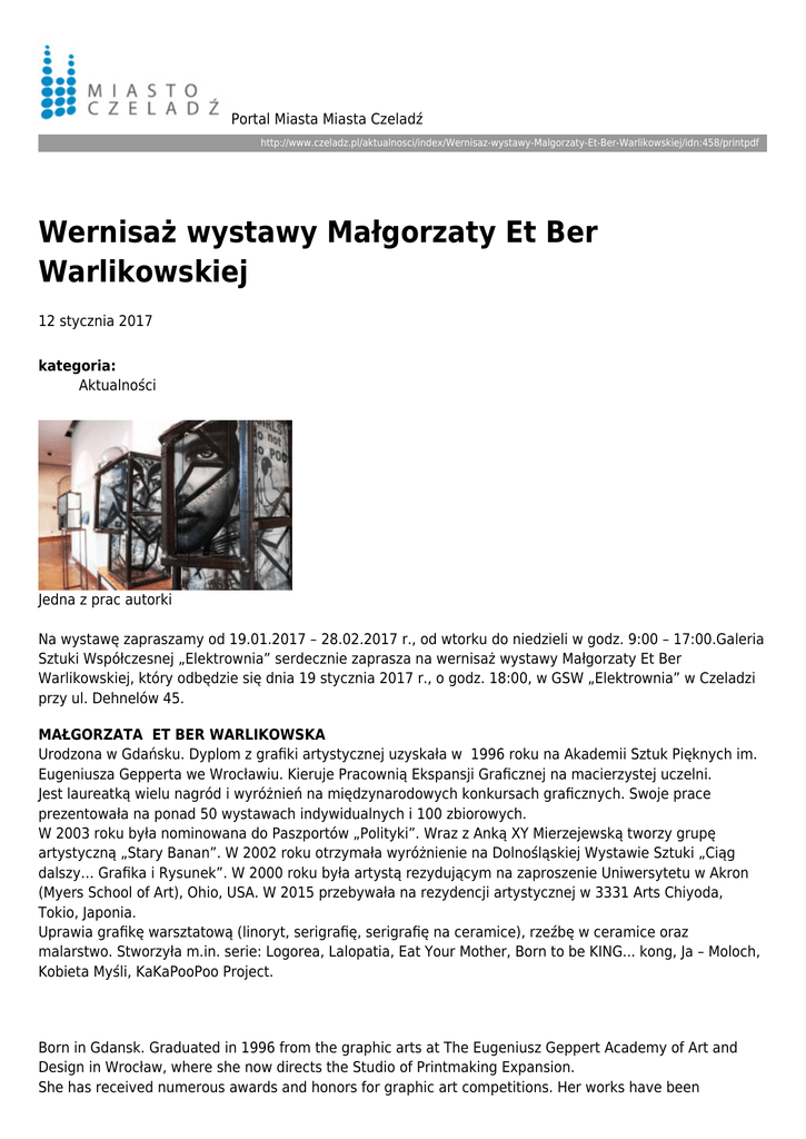 Portal Miasta Miasta Czeladź http://www.czeladz.pl/aktualnosci/index/Wernisaz-wystawy-Malgorzaty-Et-Ber-Warlikowskiej/idn:458/printpdf Wernisaż wystawy Małgorzaty Et Ber Warlikowskiej 12 stycznia 2017 kategoria: Aktualności Jedna z prac autorki Na wystawę zapraszamy od 19.01.2017 – 28.02.2017 r., od wtorku do niedzieli w godz. 9:00 – 17:00.Galeria Sztuki Współczesnej „Elektrownia” serdecznie zaprasza na wernisaż wystawy Małgorzaty Et Ber Warlikowskiej, który odbędzie się dnia 19 stycznia 2017 r., o godz. 18:00, w GSW „Elektrownia” w Czeladzi przy ul. Dehnelów 45. MAŁGORZATA ET BER WARLIKOWSKA Urodzona w Gdańsku. Dyplom z grafiki artystycznej uzyskała w 1996 roku na Akademii Sztuk Pięknych im. Eugeniusza Gepperta we Wrocławiu. Kieruje Pracownią Ekspansji Graficznej na macierzystej uczelni. Jest laureatką wielu nagród i wyróżnień na międzynarodowych konkursach graficznych. Swoje prace prezentowała na ponad 50 wystawach indywidualnych i 100 zbiorowych. W 2003 roku była nominowana do Paszportów „Polityki”. Wraz z Anką XY Mierzejewską tworzy grupę artystyczną „Stary Banan”. W 2002 roku otrzymała wyróżnienie na Dolnośląskiej Wystawie Sztuki „Ciąg dalszy… Grafika i Rysunek”. W 2000 roku była artystą rezydującym na zaproszenie Uniwersytetu w Akron (Myers School of Art), Ohio, USA. W 2015 przebywała na rezydencji artystycznej w 3331 Arts Chiyoda, Tokio, Japonia. Uprawia grafikę warsztatową (linoryt, serigrafię, serigrafię na ceramice), rzeźbę w ceramice oraz malarstwo. Stworzyła m.in. serie: Logorea, Lalopatia, Eat Your Mother, Born to be KING... kong, Ja – Moloch, Kobieta Myśli, KaKaPooPoo Project. Born in Gdansk. Graduated in 1996 from the graphic arts at The Eugeniusz Geppert Academy of Art and Design in Wrocław, where she now directs the Studio of Printmaking Expansion. She has received numerous awards and honors for graphic art competitions. Her works have been presented in more than 50 solo exhibitions and 100 group exhibitions. In 2003 she was nomi-nated for Passports of “Polityka”. With the XY Anka Mierzejewska she creates an artistic group “Old Banana”. In 2000 she was artist in residence at the invitation of the University of Akron (Myers School of Art), Ohio, USA. In 2015 she was on residency in 3331 Arts Chiyoda, Tokyo, Japan. She practices printmaking (linocut, silkscreen, silkscreen on ceramics), sculpture in ceramics and painting. Created, among others series: Logorrhea, Lalopathy, Eat Your Mother, Born to be KING… Kong, Me – crowd – Moloch, Woman Thinks, KaKaPooPoo Project.