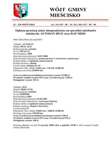 WÓJT GMINY MIEŚCISKO 62 – 290 MIEŚCISKO tel. ( 61) 429 – 80 – 10 ; fax ( 061) 427 – 80 – 88 Ogłasza przetarg ustny nieograniczony na sprzedaż autobusów szkolnych; AUTOSAN H9.21 oraz DAF SB201 Dane identyfikacyjne pojazdów: 1)Marka: AUTOSAN Model: H9.21 12,5t Rodzaj pojazdu: autobus Nr rej. PWAC111 Rok produkcji: 2000 Data pierwszej rejestracji: 20.07.2000 Kolor powłoki lakierniczej: pomarańczowy 1-warstwowy syntetyczny Rodzaj silnika: z zapłonem samoczynnym Rodzaj autobusu: szkolny Liczba miejsc siedzących: 43 Pojemność/ Moc silnika: 6540 ccm / 110 kW (150KM) Przebieg szacowany:243064 km Cena wywoławcza przedmiotu przetargu wynosi: 25.500 zł Wysokość wadium wynosi 10% ceny wywoławczej tj. 2.550 zł Postąpienie wynosi: 255 zł 2)Marka: DAF Model: SB201 16 Ot Rodzaj pojazdu: autobus Nr rej. PZH999K Rok produkcji:1984 Data pierwszej rejestracji:19.04.1984 Kolor powłoki lakierniczej: czerwono/wiśniowy Rodzaj silnika: z zapłonem samoczynnym Rodzaj autobusu: miejski 3 drzwiowy Liczba miejsc:33 Pojemność/ Moc silnika:11600 ccm / 160kW (218KM) Przebieg szacowany:128138 km Cena wywoławcza przedmiotu przetargu wynosi 5.700 zł Wysokość wadium wynosi 10% ceny wywoławczej tj.570 zł Postąpienie wynosi: 100 zł Przetarg odbędzie się dnia 9 stycznia 2008 roku o godzinie 10:00 w Sali sesyjnej Urzędu Gminy Mieścisko. Osoby zainteresowane udziałem w przetargu zobowiązane są do wpłaty wadium na konto Urzędu Gminy Mieścisko do dnia 9 stycznia 2008 roku do godziny 9:00 Nr konta BS Gniezno / Odział Mieścisko 02 9065 0006 0030 0300 0231 0001 Wadium wpłacone przez uczestnika przetargu, który przetarg wygra, zostanie zaliczone na poczet ceny nabycia. Pozostałym uczestnikom, wadium zostanie zwrócone na wskazane konto bankowe. Wadium nie podlega zwrotowi w przypadku gdy: żaden uczestnik przetargu nie zaoferuje co najmniej ceny wywoławczej oraz, gdy uczestnik przetargu który wygrał przetarg uchyla się od zawarcia umowy. Przedmiot przetargu można oglądać od poniedziałku do piątku w godzinach od 8:30 do 15:30 po wcześniejszym uzgodnieniu telefonicznym. Zastrzega się prawo unieważnienia przetargu bez podania przyczyny.