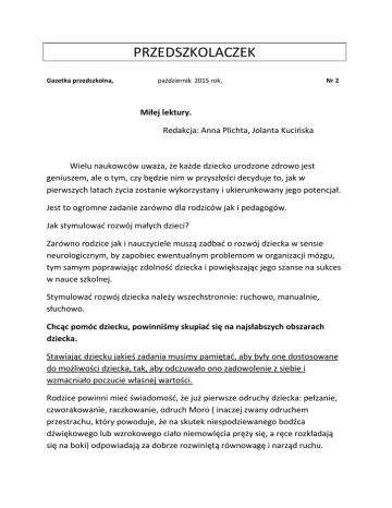 PRZEDSZKOLACZEK Gazetka przedszkolna, październik 2015 rok, Nr 2 Miłej lektury. Redakcja: Anna Plichta, Jolanta Kucińska Wielu naukowców uważa, że każde dziecko urodzone zdrowo jest geniuszem, ale o tym, czy będzie nim w przyszłości decyduje to, jak w pierwszych latach życia zostanie wykorzystany i ukierunkowany jego potencjał. Jest to ogromne zadanie zarówno dla rodziców jak i pedagogów. Jak stymulować rozwój małych dzieci? Zarówno rodzice jak i nauczyciele muszą zadbać o rozwój dziecka w sensie neurologicznym, by zapobiec ewentualnym problemom w organizacji mózgu, tym samym poprawiając zdolność dziecka i powiększając jego szanse na sukces w nauce szkolnej. Stymulować rozwój dziecka należy wszechstronnie: ruchowo, manualnie, słuchowo. Chcąc pomóc dziecku, powinniśmy skupiać się na najsłabszych obszarach dziecka. Stawiając dziecku jakieś zadania musimy pamiętać, aby były one dostosowane do możliwości dziecka, tak, aby odczuwało ono zadowolenie z siebie i wzmacniało poczucie własnej wartości. Rodzice powinni mieć świadomość, że już pierwsze odruchy dziecka: pełzanie, czworakowanie, raczkowanie, odruch Moro ( inaczej zwany odruchem przestrachu, który powoduje, że na skutek niespodziewanego bodźca dźwiękowego lub wzrokowego ciało niemowlęcia pręży się, a ręce rozkładają się na boki) odpowiadają za dobrze rozwiniętą równowagę i narząd ruchu. Mózg dziecka, który ma niewystarczająco dobrze rozwiniętą równowagę zajęty jest położeniem ciała w przestrzeni i nie i nie może zająć się aktywnościami intelektualnymi. Aktywność ruchowa i manualna w równej mierze jak doświadczenia wzrokowe, słuchowe i dotykowe kształtują budowę mózgu. Dzieci, które nie pełzały lub nie raczkowały nie osiągną w pełni swojego rozwoju intelektualnego, dopóki nie będą miały okazji do uzupełnienia brakujących elementów, a może mieć to miejsce do 6 roku życia, bo wtedy mózg jest najbardziej plastyczny. Mnóstwo jest okazji do zabaw ruchowych w ciągu dnia, czy choćby wieczorem: od ,,taczek”, naśladowania chodu zwierząt – czworakowania, chodzenia po schodach, czołgania, po jazdę na rowerze, bieganie, skakanie itp. Należy mieć tylko świadomość jak wielki wpływ ma ruch dziecka na usprawnianie procesów zachodzących w mózgu, chęci no i konsekwencje w zabawie. Także dużo czasu należy poświęcać na malowanie, wycinanie, lepienie, manipulowanie klockami, wydzieranie itp. Ponieważ dzieci skupiają uwagę na krótko, dlatego wszelkie zabawy i ćwiczenia powinny być przeplatane innymi aktywnościami: śpiewaniem, rozwijaniem kreatywności, pamięci i wyobraźni. Tutaj jest niewyczerpane źródło pomysłów: układanki 9puzzle, tangramy – układanie z figur geometrycznych według wzoru), patyczki, klocki, odwzorowywanie, klocki, kolorowanki, zagadki, książki, materiały przyrodnicze, wiersze, piosenki, gry planszowe… Każde działanie dziecka rozwija jednocześnie wiele procesów i ćwiczy logiczne myślenie. Bawiąc się z dzieckiem informacje powinniśmy przekazywać szybko, zwięźle, najlepiej bez tłumaczenia. Dziecko najlepiej rozumie reguły na podstawie wielu obserwacji i uczy się samodzielnie myśleć. Bawiąc się z dzieckiem zawsze należy pamiętać o dyscyplinie, czyli o podporządkowywaniu się regułom i konsekwencji. Ciekawostka Małe dzieci mają słuch absolutny, niebywałą zdolność nauki języka (do 4 lat), fotograficzną pamięć, doskonałą wyobraźnię i intuicję. Zdolności te można rozwijać, w przeciwnym razie wygasną. Jedne już w wieku pół roku, a inne w wieku 3 lub 6 lat. Każde działanie w domu może być zsynchronizowane z działaniem dziecka (rozmowa, włączanie do zajęć, spacery, jazda samochodem…) Największą i najważniejszą inwestycją rodziców powinno być dziecko!!! W naszej cywilizacji oczekujemy, że osoba inteligentna, za którą każdy chciałby uchodzić, to ktoś oczytany, znający języki obce, wrażliwy muzycznie, łatwo uczący się, a przy tym jest jednostką kreatywną, posiadającą bogatą wyobraźnie i bardzo dobrą pamięć. Ale nic nie ma za darmo. Zatem poświęcajmy dzieciom mnóstwo czasu. Wiersze i piosenki, które uczyliśmy się w październiku Wiersze 1. Zajączki, zajączki, zajączki, skakały przez pola i łączki. Stanęły pod lasem i patrzą, jak dzieci się bawią i skaczą. A dzieci podały im rączki i razem skakały zajączki. 2. Dokąd jadą wozy? Do młyna za łąkę. A co wiozą w workach? Pszenicę na mąkę. Młynarz mąkę zmiele, pięknie jak należy, Będą białe bułki, będzie chlebek świeży. 3. List ma trafić do adresata, choćby on mieszkał na końcu świata. Gdzieś na biegunie, albo na wyspie, bo poczta listy doręcza wszystkie. Lecz nie adresuj pisząc do cioci, kochana ciociu, poczta Okocim. Bo listonoszowi trzeba dopomóc. Podaj ulicę i numer domu, imię, nazwisko kochanej cioci – by pan listonosz, no pomyśl sama, nad twoim listem głowy nie łamał. 4. Na ulicy, pod drzewami, parasole dwa. Pod tym dużym idzie mama, pod ty małym – ja. Idę z mamą, idę słucham, mama słucha też, Jak z drzewami o czyś mówi rozgadany deszcz. Mówi cicho, to znów głośniej, w rynnie dzwoni, gra I wesoło stuka, puka w parasole dwa. Piosenki 1. Na marchewki urodziny, wszystkie zeszły się jarzyny A marchewka gości wita i o zdrowie grzecznie pyta – 2 x. Kartofelek podskakuje, burak z rzepką już tańcuje Pan kalafior z krótką nóżką, biegnie szybko za pietruszką – 2 x Kalarepka w kącie siadła, ze zmartwienia aż pobladła, Tak się martwi, płacze szczerze, nikt do tańca jej nie bierze – 2 x Wtem pomidor nagle wpada, kalarepce ukłon składa, Moja blada kalarepko, tańczże ze mną tańczże krzepko - 2 x Wszystkie pary jarzynowe, już do tańca są gotowe Gra muzyka, to poleczka, wszyscy tańczą już w kółeczkach – 2 x. 2 Ten mały nasz baranek wszyściutko ma weł
