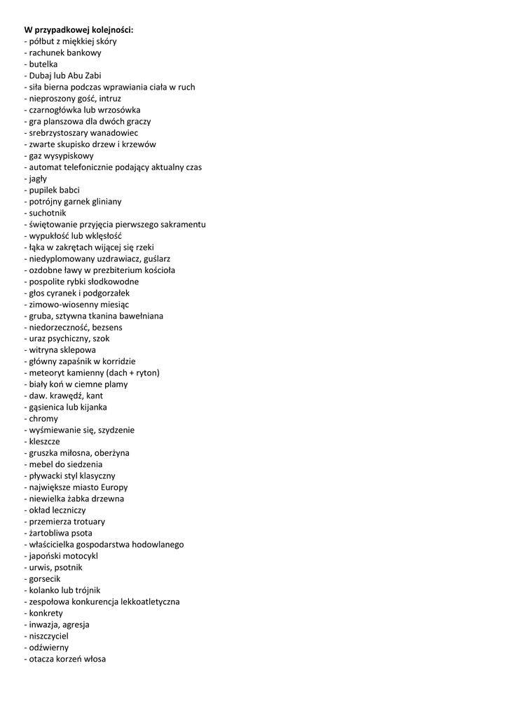 W przypadkowej kolejności: - półbut z miękkiej skóry - rachunek bankowy - butelka - Dubaj lub Abu Zabi - siła bierna podczas wprawiania ciała w ruch - nieproszony gość, intruz - czarnogłówka lub wrzosówka - gra planszowa dla dwóch graczy - srebrzystoszary wanadowiec - zwarte skupisko drzew i krzewów - gaz wysypiskowy - automat telefonicznie podający aktualny czas - jagły - pupilek babci - potrójny garnek gliniany - suchotnik - świętowanie przyjęcia pierwszego sakramentu - wypukłość lub wklęsłość - łąka w zakrętach wijącej się rzeki - niedyplomowany uzdrawiacz, guślarz - ozdobne ławy w prezbiterium kościoła - pospolite rybki słodkowodne - głos cyranek i podgorzałek - zimowo-wiosenny miesiąc - gruba, sztywna tkanina bawełniana - niedorzeczność, bezsens - uraz psychiczny, szok - witryna sklepowa - główny zapaśnik w korridzie - meteoryt kamienny (dach + ryton) - biały koń w ciemne plamy - daw. krawędź, kant - gąsienica lub kijanka - chromy - wyśmiewanie się, szydzenie - kleszcze - gruszka miłosna, oberżyna - mebel do siedzenia - pływacki styl klasyczny - największe miasto Europy - niewielka żabka drzewna - okład leczniczy - przemierza trotuary - żartobliwa psota - właścicielka gospodarstwa hodowlanego - japoński motocykl - urwis, psotnik - gorsecik - kolanko lub trójnik - zespołowa konkurencja lekkoatletyczna - konkrety - inwazja, agresja - niszczyciel - odźwierny - otacza korzeń włosa