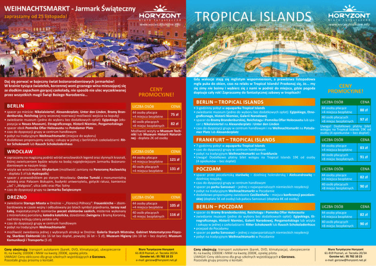 WEIHNACHTSMARKT - Jarmark Świąteczny zapraszamy od 25 listopada! www.wycieczkiszkolne.info Daj się porwać w bajeczny świat bożonarodzeniowych jarmarków! W krainie tysiąca światełek, korzennej woni grzanego wina mieszającej się ze słodkim zapachem gorącej czekolady, nie sposób nie ulec wyczekiwanej przez wszystkich magii Świąt Bożego Narodzenia… BERLIN •spacer po mieście: Nikolaiviertel, Alexanderplatz, Unter den Linden, Bramy Brandenburska, Reichstag (przy wczesnej rezerwacji możliwość wejścia na kopułę) •zwiedzanie muzeum (jedno do wyboru bez dodatkowych opłat): Egipskiego (ekspozycja w Neues Museum), Etnograficznego, Historii Niemiec, Pergamońskiego •spacer obok Pomnika Ofiar Holocaustu na Potsdamer Platz •czas do dyspozycji grupy w centrum handlowym •pobyt na tradycyjnym Weihnachtsmarkt (miejsce do wyboru) •dodatkowo proponujemy wizytę i zakupy w jednej z berlińskich czekoladziarni: Ritter Schokowelt lub Rausch Schokoladenhaus WROCŁAW •zapraszamy na magiczną podróż wśród wrocławskich legend oraz słynnych krasnali, której zwieńczeniem będzie wizyta na bodaj najpiękniejszym Jarmarku Bożonarodzeniowym w naszym kraju •wizyta we wrocławskim Afrykarium (możliwość zamiany na Panoramę Racławicką - dopłata 5 zł lub Hydropolis) •spacer z przewodnikiem po starym Wrocławiu: Ostrów Tumski z monumentalną katedrą oraz Pałacem Biskupim, budynki uniwersytetu, gotycki ratusz, kamienice „Jaś’ i „Małgosia”, ulica Jatki oraz Plac Solny •czas do dyspozycji grupy na Jarmarku Świątecznym DREZNO CENY PROMOCYJNE! LICZBA OSÓB CENA 44 osoby płacące 75 zł +4 miejsca bezpłatne 40 osób płacących 82 zł +8 miejsc bezpłatnych Możliwość wizyty w Muzeum Techniki lub Muzeum Historii Naturalnej - dopłata 2€ od osoby LICZBA OSÓB 44 osoby płacące +4 miejsca bezpłatne 40 osób płacących +4 miejsca bezpłatne LICZBA OSÓB CENA 121 zł 131 zł CENA •zwiedzanie Starego Miasta w Dreźnie – „Florencji Północy”: Frauenkirche – zbom44 osoby płacące 105 zł bardowany w czasie wojny i odbudowany po latach symbol pojednania, tarasy nad +4 miejsca bezpłatne Łabą, majestatycznych rozmiarów poczet elektorów saskich, misternie wykonany 40 osób płacących 116 zł z miśnieńskiej porcelany, katedra katolicka, dziedziniec Zwingeru z Bramą Koronną, +8 miejsc bezpłatnych nad którą królują cztery polskie orły •czas do dyspozycji grupy w centrum handlowym •pobyt na tradycyjnym Weihnachtsmarkt •możliwość zwiedzenia jednej z wybranych atrakcji w Dreźnie: Galeria Starych Mistrzów, Gabinet Matematyczno-Fizyczny, Skarbiec Elektorski (do 16 lat bez dopłat, powyżej 16 lat – 5 zł); Muzeum Higieny (do 18 lat – bez dopłat); Muzeum Komunikacji i Transportu (5 zł) Ceny obejmują: transport autokarem (barek, DVD, klimatyzacja), ubezpieczenie KL na kwotę 10000€ i NNW na kwotę 2000€, opiekę pilota. UWAGA! Ceny obliczono dla grup szkolnych wyjeżdżających z Gorzowa. Pozostałe grupy prosimy o kontakt. Biuro Turystyczne Horyzont 61-819 Poznań, ul. Taczaka 20/3A Gorzów tel.: 95 782 10 23 e-mail: [email protected] TROPICAL ISLANDS Gdy wakacje stają się mglistym wspomnieniem, a prawdziwa listopadowa mgła puka do okien, czas na relaks w Tropical Islands! Przekonaj się, że... my się zimy nie boimy i wybierz się z nami w podróż do miejsca, gdzie pogoda dopisuje cały rok! Zapraszamy do fantastycznej zabawy w tropikach! BERLIN – TROPICAL ISLANDS •3-godzinny pobyt w aquaparku Tropical Islands •zwiedzanie muzeum (jedno do wyboru bez dodatkowych opłat): Egipskiego, Etnograficznego, Historii Niemiec, Galerii Narodowej •spacer do Bramy Brandenburskiej, Reichstagu i Pomnika Ofiar Holocaustu lub spacer z Nikolaiviertel na Alexanderplatz i Unter den Linden •czas do dyspozycji grupy w centrum handlowym i na Weihnachtsmarkt na Potsdamer Platz lub Alexanderplatz FRANKFURT – TROPICAL ISLANDS •7-godzinny pobyt w aquaparku Tropical Islands •czas do dyspozycji grupy w centrum handlowym •pobyt na tradycyjnym Weihnachtsmarkt we Frankfurcie •Uwaga! Dodatkowo płatny bilet wstępu na Tropical Islands 19€ od osoby (4 opiekunów – bez dopłat) POCZDAM •spacer przez poczdamską starówkę – dzielnicę holenderską i Aleksandrowkę – dzielnicę rosyjską •czas do dyspozycji grupy w centrum handlowym •spacer po parku Sanssouci – jednej z najwspanialszych niemieckich rezydencji •pobyt na tradycyjnym Weihnachtsmarkt w Poczdamie •dodatkowo proponujemy zwiedzanie Cecilienhofu – miejsca konferencji poczdamskiej (dopłata 5€ od osoby) lub pałacu Sanssouci (dopłata 8€ od osoby) BERLIN – POCZDAM •spacer do Bramy Brandenburskiej, Reichstagu i Pomnika Ofiar Holocaustu •zwiedzanie muzeum (jedno do wyboru bez dodatkowych opłat): Egipskiego, Etnograficznego, Historii Niemiec, Galerii Narodowej, Pergamońskiego lub wizyta i zakupy w jednej z czekoladziarni: Ritter Schokowelt lub Rausch Schokoladenhaus •przejazd do Poczdamu •spacer po parku Sanssouci – jednej z najwspanialszych niemieckich rezydencji •pobyt na tradycyjnym Weihnachtsmarkt w Poczdamie Ceny obejmują: transport autokarem (barek, DVD, klimatyzacja), ubezpieczenie KL na kwotę 10000€ i NNW na kwotę 2000€, opiekę pilota. UWAGA! Ceny obliczono dla grup szkolnych wyjeżdżających z Gorzowa. Pozostałe grupy prosimy o kontakt. www.wycieczkiszkolne.info CENY PROMOCYJNE! LICZBA OSÓB CENA 44 osoby płacące 88 zł +4 miejsca bezpłatne 40 osób płacących 97 zł +8 miejsc bezpłatnych Uwaga! Dodatkowo płatny bilet wstępu na Tropical Islands 19€ od osoby (4 opiekunów – bez dopłat) LICZBA OSÓB CENA 44 osoby płacące +4 miejsca bezpłatne 40 osób płacących +8 miejsc bezpłatnych 83 zł LICZBA OSÓB CENA 44 osoby płacące +4 miejsca bezpłatne 40 osób płacących +8 miejsc bezpłatnych 82 zł LICZBA OSÓB CENA 44 osoby płacące +4 miejsca bezpłatne 40 osób płacących +8 miejsc bezpłatny
