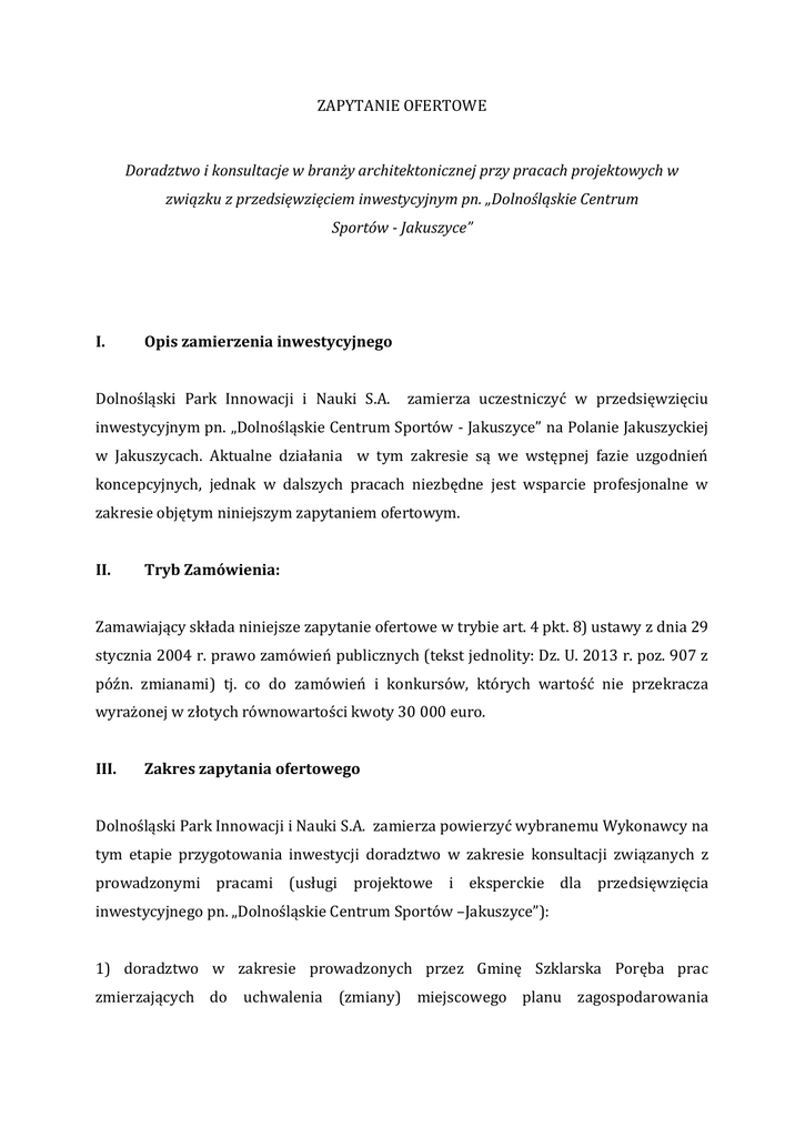 ZAPYTANIE OFERTOWE Doradztwo i konsultacje w branży architektonicznej przy pracach projektowych w związku z przedsięwzięciem inwestycyjnym pn. „Dolnośląskie Centrum Sportów - Jakuszyce” I. Opis zamierzenia inwestycyjnego Dolnośląski Park Innowacji i Nauki S.A. zamierza uczestniczyć w przedsięwzięciu inwestycyjnym pn. „Dolnośląskie Centrum Sportów - Jakuszyce” na Polanie Jakuszyckiej w Jakuszycach. Aktualne działania w tym zakresie są we wstępnej fazie uzgodnień koncepcyjnych, jednak w dalszych pracach niezbędne jest wsparcie profesjonalne w zakresie objętym niniejszym zapytaniem ofertowym. II. Tryb Zamówienia: Zamawiający składa niniejsze zapytanie ofertowe w trybie art. 4 pkt. 8) ustawy z dnia 29 stycznia 2004 r. prawo zamówień publicznych (tekst jednolity: Dz. U. 2013 r. poz. 907 z późn. zmianami) tj. co do zamówień i konkursów, których wartość nie przekracza wyrażonej w złotych równowartości kwoty 30 000 euro. III. Zakres zapytania ofertowego Dolnośląski Park Innowacji i Nauki S.A. zamierza powierzyć wybranemu Wykonawcy na tym etapie przygotowania inwestycji doradztwo w zakresie konsultacji związanych z prowadzonymi pracami (usługi projektowe i eksperckie dla przedsięwzięcia inwestycyjnego pn. „Dolnośląskie Centrum Sportów –Jakuszyce”): 1) doradztwo w zakresie prowadzonych przez Gminę Szklarska Poręba prac zmierzających do uchwalenia (zmiany) miejscowego planu zagospodarowania przestrzennego dla obszaru Polany Jakuszyckiej, przygotowanie ewentualnych uwag do projektu planu; 2) analizy warunków terenowych i geotechnicznych, inwentaryzacji urbanistycznej oraz analizy dostępnych map, wypisów i wyrysów z ewidencji gruntów oraz map zasadniczych (sytuacyjno – wysokościowych) oraz istniejących opracowań i dokumentacji projektowej, 3) przygotowanie wystąpień o niezbędne dane dotyczące uwarunkowań przestrzennych, 4) określenie parametrów inwestycji w zakresie funkcji obiektu i ich rozmieszczenia oraz istotnych wskaźników technicznych: ogólne powierzchnie, kubatury, proponowane technologie konstrukcyjno – budowlane, 5) przygotowanie koncepcji funkcjonalno – przestrzennej dla przedsięwzięcia inwestycyjnego pn. „Dolnośląskie Centrum Sportów – Jakuszyce” w Jakuszycach w zakresie architektury i zagospodarowania terenu, 6) przygotowanie szacunkowego kosztorysu wskaźnikowego określającego nakłady inwestycyjne i potencjalne koszty eksploatacyjne w zakresie architektury i zagospodarowania terenu, 7) przygotowanie strony graficznej oferty inwestycyjnej wraz z trójwymiarowymi, fotorealistycznymi wizualizacjami z zewnątrz i z wnętrz obiektów centrum sportów zimowych, 8) przygotowanie dokumentacji przetargowej w przetargu na prace projektowe zaakceptowanej przez Dolnośląski Park Innowacji i Nauki S.A. koncepcji oraz na wyłonienie inżyniera kontraktu przy inwestycji (w jednym postępowaniu) w tym: przygotowanie SIWZ wraz z wszystkimi wymaganymi załącznikami (w tym projektu umowy) oraz udział w postępowaniu przetargowym (w tym przygotowywanie projektów odpowiedzi na pytania wykonawców). IV. Terminy: Zamawiający oczekuje, że Wykonawca wykona zamówienie sukcesywnie w okresie 4 miesięcy po podpisaniu umowy. V. Kryteria oceny oferty Zamawiający dokona oceny otrzymanych ofert w oparciu o następujące kryteria: - cena (waga max. 65 punktów - 65 %) - ocena przedłożonej przez Wykonawcę ogólnej wstępnej koncepcji organizacji centrum sportów zimowych w Jakuszycach (waga max. 30 punktów - 30%); - doświadczenie w wykonywaniu usług podobnych do usług objętych niniejszym zapytaniem (waga 5 punktów – 5%) Wykonawca zobowiązany jest podać jedną cenę ryczałtową za czynności do wykonania w związku z przedmiotem Zamówienia. Rozliczanie z zakresu: 20% - 14 dni po podpisaniu umowy i wystawieniu faktury częściowej, 20% - 14 dni po zrealizowaniu 1 – 5 i wystawieniu faktury częściowej, 60% - 14 dni po zrealizowaniu całości zadania i wystawieniu faktury końcowej. Wykonawca wraz z ofertą przedłoży wstępne, ramowe opracowanie na temat możliwej koncepcji zagospodarowania Polany Jakuszyckiej z przeznaczeniem dla przedsięwzięcia inwestycyjnego pn. „Dolnośląskie Centrum Sportów – Jakuszyce”). Wstępna koncepcja będzie podlegała ocenie Zamawiającego, który przyzna maksymalnie 30 punktów za przedłożoną koncepcję. Zamawiający dopuszcza oferty nie zawierające koncepcji jednak w tym wypadku wykonawca nie przedkładający takiej koncepcji otrzyma 0 punktów. Wykonawca wraz z ofertą zobowiązany będzie poinformować Zamawiającego, czy posiada doświadczenie w zakresie objętym niniejszym zapytaniem ofertowym a jeśli takie doświadczenie posiada wykazać jakie działania objęte przedmiotem niniejszego zamówienia, w zakresie obiektów sportowych wykonywał w ciągu ostatnich 3 lat przed złożeniem oferty. Brak doświadczenia nie wyklucza udziału w postępowaniu jednak spowoduje brak punktów za doświadczenie. W przypadku dwóch lub więcej ofert z tą samą liczbą punktów Zamawiający zastrzega sobie prawo dodatkowych negocjacji cenowych z Wykonawcami. VI. Termin złożenia oferty i wymagania Zamawiający rozpatrzy oferty, które zostaną złożone w terminie do 30.06.2015 roku, do godziny 12.00. Oferty powinny zostać złożone w siedzibie Zamawiającego, we Wrocławiu, przy ul. Kwiatkowskiego 4 lub pocztą elektroniczną na adres [email protected] VII. Pytania i odpowiedzi Zamawiający udzieli odpowiedzi na pytania w zakresie niniejszego zapytania ofertowego. Pytania mogą być kierowane na ręce pracownika Zamawiającego – Pani Małgorzaty Majchrzak-Fiali lub Pani Elżbiety Szlauer, bądź pisemnie na adres: Dolnośląski Park Innowacji i Nauki S.A. ul. E. Kwiatkowskiego 4, 52-326 Wrocław lub za pomocą poczty elektronicznej na adres e-mail: [email protected] VIII. Termin związania ofertą Zamawiający oczekuje, że Wykonawca będzie związany zło