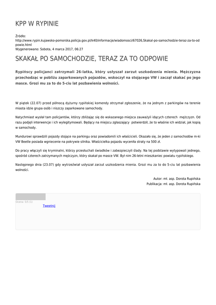 KPP W RYPINIE Źródło: http://www.rypin.kujawsko-pomorska.policja.gov.pl/k40/informacje/wiadomosci/67026,Skakal-po-samochodzie-teraz-za-to-od powie.html Wygenerowano: Sobota, 4 marca 2017, 06:27 SKAKAŁ PO SAMOCHODZIE, TERAZ ZA TO ODPOWIE Rypińscy policjanci zatrzymali 26-latka, który usłyszał zarzut uszkodzenia mienia. Mężczyzna przechodząc w pobliżu zaparkowanych pojazdów, wskoczył na stojącego VW i zaczął skakać po jego masce. Grozi mu za to do 5-ciu lat pozbawienia wolności. W piątek (22.07) przed północą dyżurny rypińskiej komendy otrzymał zgłoszenie, że na jednym z parkingów na terenie miasta idzie grupa osób i niszczy zaparkowane samochody. Natychmiast wysłał tam policjantów, którzy zbliżając się do wskazanego miejsca zauważyli idących czterech mężczyzn. Od razu podjęli interwencje i ich wylegitymowali. Będący na miejscu zgłaszający potwierdził, że to właśnie ich widział, jak kopią w samochody. Mundurowi sprawdzili pojazdy stojące na parkingu oraz powiadomili ich właścicieli. Okazało się, że jeden z samochodów m-ki VW Beetle posiada wgniecenie na pokrywie silnika. Właścicielka pojazdu wyceniła straty na 500 zł. Do pracy włączyli się kryminalni, którzy przesłuchali świadków i zabezpieczyli ślady. Na tej podstawie wytypowali jednego, spośród czterech zatrzymanych mężczyzn, który skakał po masce VW. Był nim 26-letni mieszkaniec powiatu rypińskiego. Następnego dnia (23.07) gdy wytrzeźwiał usłyszał zarzut uszkodzenia mienia. Grozi mu za to do 5-ciu lat pozbawienia wolności. Autor: mł. asp. Dorota Rupińska Publikacja: mł. asp. Dorota Rupińska Ocena: 5/5 (1) Tweetnij