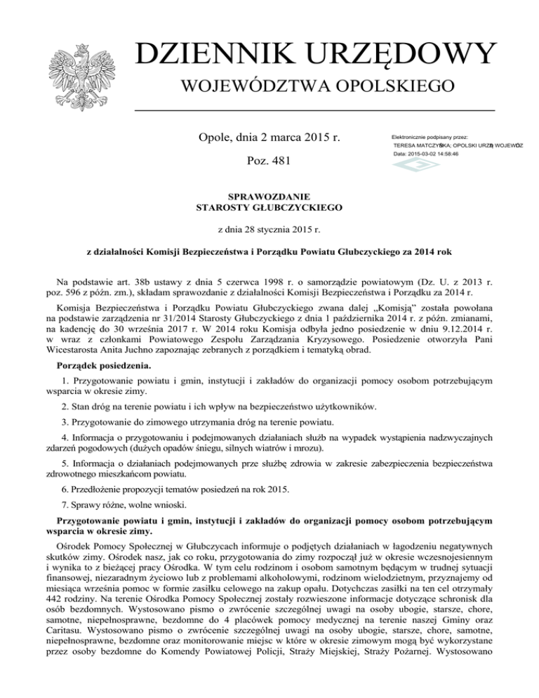 DZIENNIK URZĘDOWY WOJEWÓDZTWA OPOLSKIEGO Opole, dnia 2 marca 2015 r. Elektronicznie podpisany przez: TERESA MATCZYŃSKA; OPOLSKI URZĄD WOJEWÓDZKI Poz. 481 Data: 2015-03-02 14:58:46 SPRAWOZDANIE STAROSTY GŁUBCZYCKIEGO z dnia 28 stycznia 2015 r. z działalności Komisji Bezpieczeństwa i Porządku Powiatu Głubczyckiego za 2014 rok Na podstawie art. 38b ustawy z dnia 5 czerwca 1998 r. o samorządzie powiatowym (Dz. U. z 2013 r. poz. 596 z późn. zm.), składam sprawozdanie z działalności Komisji Bezpieczeństwa i Porządku za 2014 r. Komisja Bezpieczeństwa i Porządku Powiatu Głubczyckiego zwana dalej „Komisją” została powołana na podstawie zarządzenia nr 31/2014 Starosty Głubczyckiego z dnia 1 października 2014 r. z późn. zmianami, na kadencję do 30 września 2017 r. W 2014 roku Komisja odbyła jedno posiedzenie w dniu 9.12.2014 r. w wraz z członkami Powiatowego Zespołu Zarządzania Kryzysowego. Posiedzenie otworzyła Pani Wicestarosta Anita Juchno zapoznając zebranych z porządkiem i tematyką obrad. Porządek posiedzenia. 1. Przygotowanie powiatu i gmin, instytucji i zakładów do organizacji pomocy osobom potrzebującym wsparcia w okresie zimy. 2. Stan dróg na terenie powiatu i ich wpływ na bezpieczeństwo użytkowników. 3. Przygotowanie do zimowego utrzymania dróg na terenie powiatu. 4. Informacja o przygotowaniu i podejmowanych działaniach służb na wypadek wystąpienia nadzwyczajnych zdarzeń pogodowych (dużych opadów śniegu, silnych wiatrów i mrozu). 5. Informacja o działaniach podejmowanych prze służbę zdrowia w zakresie zabezpieczenia bezpieczeństwa zdrowotnego mieszkańcom powiatu. 6. Przedłożenie propozycji tematów posiedzeń na rok 2015. 7. Sprawy różne, wolne wnioski. Przygotowanie powiatu i gmin, instytucji i zakładów do organizacji pomocy osobom potrzebującym wsparcia w okresie zimy. Ośrodek Pomocy Społecznej w Głubczycach informuje o podjętych działaniach w łagodzeniu negatywnych skutków zimy. Ośrodek nasz, jak co roku, przygotowania do zimy rozpoczął już w okresie wczesnojesiennym i wynika to z bieżącej pracy Ośrodka. W tym celu rodzinom i osobom samotnym będącym w trudnej sytuacji finansowej, niezaradnym życiowo lub z problemami alkoholowymi, rodzinom wielodzietnym, przyznajemy od miesiąca września pomoc w formie zasiłku celowego na zakup opału. Dotychczas zasiłki na ten cel otrzymały 442 rodziny. Na terenie Ośrodka Pomocy Społecznej zostały rozwieszone informacje dotyczące schronisk dla osób bezdomnych. Wystosowano pismo o zwrócenie szczególnej uwagi na osoby ubogie, starsze, chore, samotne, niepełnosprawne, bezdomne do 4 placówek pomocy medycznej na terenie naszej Gminy oraz Caritasu. Wystosowano pismo o zwrócenie szczególnej uwagi na osoby ubogie, starsze, chore, samotne, niepełnosprawne, bezdomne oraz monitorowanie miejsc w które w okresie zimowym mogą być wykorzystane przez osoby bezdomne do Komendy Powiatowej Policji, Straży Miejskiej, Straży Pożarnej. Wystosowano Dziennik Urzędowy Województwa Opolskiego –2– Poz. 481 pismo do szkół oraz przedszkoli z terenu Gminy Głubczyce o zwrócenie szczególnej uwagi na dzieci ich ubiór i wyżywienie stosowne do pory roku. Współpracujemy ze Strażą Miejską w Głubczycach oraz Komedą Powiatową Policji w Głubczycach. Pracownicy socjalni wspólnie z ww. funkcjonariuszami monitorują środowiska, w których gromadzą się bezdomni lub gdzie mieszkają osoby starsze, samotne i chore oraz rodziny niezaradne życiowo, z problemem alkoholowym. Udzielamy pomocy na zakup odzieży i obuwia zimowego w zależności od zgłaszanych potrzeb. Pomoc ta została przyznana dotychczas 18 rodzinom. Zabezpieczamy dzieci z terenu naszego miasta i gminy w bezpłatne obiady w stołówkach szkolnych i przedszkolnych. Wystąpimy z prośbą do dyrektorów szkół o przedłużenie na okres ferii zimowych stołówek szkolnych tak, by wszystkie dzieci wymagające wsparcia w formie gorącego posiłku mogły skorzystać z tej formy pomocy również podczas ferii. Pomocą tą objęliśmy już 338 dzieci. Osoby dorosłe mają możliwość skorzystania z pomocy w formie ciepłego posiłku w barze lub Domu Dziennego Pobytu w Głubczycach. Dom Dziennego Pobytu w Głubczycach oraz Środowiskowy Dom Samopomocy w Nowych Gołuszowicach świadczą pomoc dla osób starszych, niepełnosprawnych, którym zabezpieczają obiad, rehabilitację, terapię, ciepłe pomieszczenie. Placówki te posiadają jeszcze wolne miejsca. Osoby starsze (54 osoby) wymagające pomocy osób drugich mają zabezpieczona pomoc w formie usług opiekuńczych w miejscu zamieszkania, w ramach, których opiekunka dostarcza ciepły posiłek, robi codzienną pielęgnację, zakupy itp. Osoby, które ze względu na stan zdrowia łub wiek wymagają całodobowej pomocy osób drugich, a są takiej pomocy pozbawione mogą zostać skierowane do domu pomocy społecznej - w miesiącu listopadzie 2014 umieszczono 1 osobę. Współpracujemy ze schroniskami dla osób bezdomnych na terenie naszej gminy (Dom Samotnych Matek z Dziećmi w Zopowy), mamy podpisane porozumienie z Domem dla Osób Bezdomnych i Najuboższych „Markot" w Kędzierzynie - Koźlu oraz innymi z terenu województwa, a czasami poza nim. Pracownicy socjalni pomagają znaleźć miejsce w Schronisku. OPS opłaca pobyt za mieszkańców naszej gminy, którzy nie mając gdzie mieszkać łub warunki mieszkaniowe nie pozwalają im godnie przeżyć zimy, wyrażają chęć przebywania w schronisku dla bezdomnych. Niestety zdarzają się przypadki, kiedy osoby bezdomne nie chcą zostać skierowane do schroniska - pracownicy socjalni pozostają bezradni wobec takich osób, mogą jedynie pomóc w formie ciepłego posiłku zasiłku celowego. Obecnie w schroniskach przebywa 6 osób. Stan dróg na terenie powiatu i ich wpływ na bezpieczeństwo użytkowników. Urząd Miejski w Głubczycach informuje, że podobnie jak w latach ubiegłych, zadania w zakresie zi