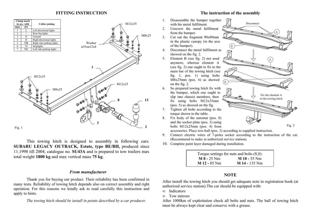 FITTING INSTRUCTION Clamp mark Cables joining in acc. with ISOElectric PN socket 7- poles according 1 PN-74/S-76055 L Left directional lights 2 54 - brake + Rear fog lights lights 3 58 L31 58 R-Ground sidelights 4 R Right directional lights –indicators 5 L,R 58R Right side parking lights + -fog 6 31 - earth, 54 Stoplights 7 58L Left side parking lights The instruction of the assembly 1. M12x35 M8x25 Washer ø35xø12x4 1 M12x35 M12x25 M8x25 8 13 3 2 Fig. 1 This towing hitch is designed to assembly in following cars: SUBARU LEGACY OUTBACK, Estate, type BE/BH, produced since 11.1998 till 2004, catalogue no. SU43A and is prepared to tow trailers max total weight 1800 kg and max vertical mass 75 kg. From manufacturer Thank you for buying our product. Their reliability has been confirmed in many tests. Reliability of towing hitch depends also on correct assembly and right operation. For this reasons we kindly ask to read carefully this instruction and apply to hints. The towing hitch should be install in points described by a car producer. Disassemble the bumper together Disconnect with his metal fulfilment. 2. Unscrew the metal fulfilment from the bumper. 3. Cut out the fragment 90x80mm in the plastic canopy (in the axis of the bumper). 4. Disconnect the metal fulfilment as showed on the fig. 2. 5. Element B (see fig. 2) not used anymore, whereas element A (see fig. 2) one ought to fix to the main bar of the towing hitch (see fig. 1, pos. 1) using bolts M8x25mm (pos. 6) as showed on the fig. 2. 6. So prepared towing hitch fix with the bumper, which one ought to Fix the element A slip into chassis members, then to the towing hitch fix using bolts M12x35mm (pos. 5) as showed on the fig. 7. Tighten all bolts according to the torque shown in the table. 8. Fix body of the automat (pos. 8) and the socket plate (pos. 3) using Fig. 2 bolts M12x25mm (pos. 4) from accessories. Place tow-ball (pos. 2) according to supplied instruction. 9. Connect electric wires of 7-poles socket according to the instruction of the car. (Recommend to make at authorized service station). 10. Complete paint layer damaged during installation. Torque settings for nuts and bolts (8,8): M 8 - 25 Nm M 10 - 55 Nm M 12 - 85 Nm M 14 - 135 Nm NOTE After install the towing hitch you should get adequate note in registration book (at authorised service station).The car should be equipped with: • Indicators • Tow mirrors After 1000km of exploitation check all bolts and nuts. The ball of towing hitch must be always kept clear and conserve with a grease. PPUH AUTO-HAK S.J. Towing hitch accessories: Produkcja Zaczepów Kulowych Henryk & Zbigniew Nejman 76-200 SŁUPSK ul. Słoneczna 16K tel/fax (059) 8-414-414; 8-414-413 E-mail: [email protected] www. autohak.com.pl Towing hitch (without electrical set) Class: A50-X Cat. no. SU43A Technical data: D-value: 10,5 kN maximum trailer weight: 1800 kg maximum vertical cup mass: 75 kg Designed for: Manufacturer: SUBARU Model: LEGACY OUTBACK Type: ESTATE, BE/BH produced since 11.1998 till 2004 Approval number according to Directive 94/20/EC: e20*94/20*0641*00 Foreword This towing hitch is designed according to rules of safety traffic regulations. The towing hitch is a safety component and can be install only by qualified personnel. Any alteration or conversion of the towing hitch is prohibited and would lead to cancellation of design certification. Remove insulating compound and underseal from vehicle (if present) in the area of the matting surfaces of the towing hitch. The vehicle manufacturer’s specifications regarding trailer load and max. vertical cup load are decisive for driving whereat values for the towing hitch cannot be exceeded. D-value formula: Max trailer weight [kg] x Max vehicle weight [kg] Max trailer weight [kg] + Max vehicle weight [kg] X 9,81 1000 = D [kN] INSTRUKCJA montaŜu i eksploatacji zaczepu kulowego Oznaczenie zacisku wg ISO PN 1 L 2 + 3 31 4 R 5 58R 6 54 7 58L Kolejność czynności przy montaŜu 1. M12x35 Łączenie przewodów Kierunkowskazy lewe Tylne światła przeciwmgłowe Masa Kierunkowskazy prawe Światła pozycyjne prawe Światła hamowania Światła pozycyjne lewe M8x25 Podkładka ø35xø12x4 1 M12x35 M12x25 M8x25 8 13 3 Rys. 1 2 Zaczep kulowy przeznaczony jest do zamontowania w samochodzie: SUBARU LEGACY OUTBACK, Kombi, typ BE/BH, produkowanym od 11.1998r. do 2004r., nr katalogowy SU43A i słuŜy do ciągnięcia przyczep o masie całkowitej do 1800 kg i nacisku na kulę max 75 kg. Zdemontować zderzak wraz z Rozłączyć metalowym jego wypełnieniem. 2. Odkręcić metalowe wypełnienie od zderzaka. 3. W plastikowej czaszy wyciąć fragment o wymiarach 90x80mm w osi zderzaka. 4. Metalowe wypełnienie zderzaka rozłączyć jak pokazano na rys. 2. 5. Część B (patrz rys. 2) nie będzie wykorzystana, natomiast część A (patrz rys. 2) przykręcić do belki głównej zaczepu (poz. 1, patrz rys. 1) śrubami M8x25mm (poz. 6) jak pokazano na rys. 2. 6. Tak przygotowany hak skręcić ze zderzakiem, który naleŜy wsunąć w podłuŜnice i skręcić Przykręcić część A śrubami M12x35mm (poz. 5) do zaczepu jak pokazano na rysunku. 7. Dokręcić wszystkie śruby z momentem jak pokazano w tabeli. 8. Przykręcić korpus automatu (poz. 8) śrubami M12x25mm (poz. 4) wraz z blachą pod gniazdo (poz. 3). Zamocować kulę zgodnie z Rys. 2 instrukcją dołączaną do zaczepu z końcówką szybkodemontowalną. 9. Podłączyć przewody gniazdka 7 – bieg. do instalacji elektrycznej zgodnie z instrukcją fabryczną samochodu (zaleca się wykonanie w ASO). 10. Uzupełnić ewentualne ubytki powłoki malarskiej zaczepu powstałe w trakcie montaŜu. Zalecany moment skręcający dla śrub i nakrętek 8,8: M 8 - 25 Nm M 10 - 55 Nm M 12 - 85 Nm M 14 - 135 Nm OD PRODUCENTA Dziękujemy za wybór produkowanego przez naszą firmę zaczepu kulowego. Jego niezawodność została potwierdzona licznymi testami oraz opiniami zadowolonych klientów. JednakŜe niezawodność zaczepów