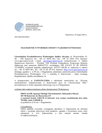 Katowice, 25 maja 2016 r. ZN/160/454/2016 OGŁOSZENIE O WYBORZE OFERTY NAJKORZYSTNIEJSZEJ Górnośląskie Przedsiębiorstwo Wodociągów Spółka Akcyjna, ul. Wojewódzka 19, 40 – 026 Katowice tel.: +48 32 6038 861, fax: +48 32 6038 614, Internet: www.gpw.katowice.pl, e-mail: [email protected] zarejestrowane w Sądzie Rejonowym Katowice – Wschód, VIII Wydział Gospodarczy Krajowego Rejestru Sądowego pod numerem 0000247533, posiadające NIP 634 012 87 88, REGON 271506695, wysokość kapitału zakładowego: 425 875 100,00 zł, wpłacono w całości tel.: +48 32 6038 861, fax: +48 32 60 38 614, Internet: http://www.gpw.katowice.pl działając zgodnie z § 98 ust. 2 Regulaminu udzielania zamówień przez Górnośląskie Przedsiębiorstwo Wodociągów S.A. z siedzibą w Katowicach – dalej zwanego Regulaminem, Spółka zawiadamia, że: w postępowaniu nr ZAPO/ZN/2/2016 o udzielenie zamówienia na: „Wycenę nieruchomości zlokalizowanej w Katowicach przy ul. Chorzowskiej 186a." prowadzonym w trybie zapytania ofertowego wg w/w Regulaminu wybrano jako najkorzystniejszą ofertę złożoną przez Wykonawcę: PROVALOR Agencja Obsługi Nieruchomości Aleksandra Olczyk 40-738 Katowice ul. Harcerska 2/5 o wartości brutto 3.062,70 zł (słownie: trzy tysiące sześćdziesiąt dwa złote 70/100), netto 2.490,00 zł. na podstawie § 94 ust. 1 Regulaminu. Uzasadnienie: Oferta spełniła wszystkie wymagania określone w Zaproszeniu do złożenia oferty i uzyskała najwyższa ilość punktów, zgodnie z kryteriami oceny ofert opisanymi w w/w Zaproszeniu, a tym samym uznana została za najkorzystniejszą. Wykaz wszystkich Wykonawców, którzy złożyli oferty w postępowaniu wraz z przyznaną punktacją przedstawia się następująco: L.p. 1. 2. 3. 4. 5. 6. Wykonawca RA-NO Nieruchomości Radosław Nowakowski 41-800 Zabrze ul. Szczepaniakowej 16/4 PROVALOR Agencja Obsługi Nieruchomości Aleksandra Olczyk 40-738 Katowice ul. Harcerska 2/5 Budoserwis Z.U.H. sp. z o.o. 41-500 Chorzów ul. Kościuszki 31 Zakład Usług Inwestycyjnych INBUD sp. z o.o. 41-200 Sosnowiec Aleja Zwycięstwa 13/47 CREO Ewa Łukasik 40-036 Katowice ul. Plebiscytowa 29/3 Grupa Konsultingowa DEFIN Sp. z o. o. 40-087 Katowice ul. Sokolska 65 Cena ofertowa netto Cena ofertowa brutto Ocena punktowa A 3.600,00 zł 3.600,00 zł 85,08 2.490,00 zł 3.062,70 zł 100 6.000,00 zł 7.380,00 zł 41,50 odrzucona 3.300,00 zł 4.059,00 zł 74,45 2.800,00 zł 3.444,00 zł 88,93 Otrzymują: 1. Strona internetowa 2. aa. Osoba do kontaktu: Joanna Mołdrzik, tel. 32/60-38-775, email: [email protected]