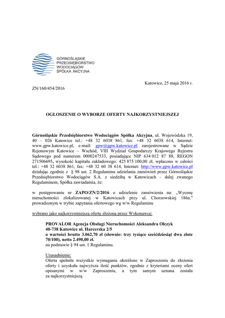 Katowice, 25 maja 2016 r. ZN/160/454/2016 OGŁOSZENIE O