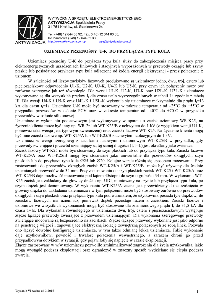 WYTWÓRNIA SPRZĘTU ELEKTROENERGETYCZNEGO AKTYWIZACJA Spółdzielnia Pracy 31-751 Kraków, ul. Stadionowa 24 Tel, (+48) 12 644 08 92, Fax. (+48) 12 644 03 55, Inf. handlowa (+48) 12 644 52 33 http://www.aktywizacja.com.pl [email protected] UZIEMIACZ PRZENOŚNY U-K DO PRZYŁĄCZA TYPU KULA Uziemiacz przenośny U-K do przyłącza typu kula służy do zabezpieczenia miejsca pracy przy elektroenergetycznych urządzeniach liniowych i stacyjnych wyposażonych w przewody okrągłe lub szyny płaskie lub posiadające przyłącza typu kula odłączone od źródła energii elektrycznej - przez połączenie z uziomem. W zależności od liczby zacisków fazowych produkowane są uziemiacze jedno, dwu, trój, cztero lub pięciozaciskowe odpowiednio U1-K, U2-K, U3-K, U4-K lub U5-K, przy czym ich połączenie może być zarówno szeregowe jak też równoległe. Dla wersji U1-K, U2-K, U3-K oraz U2L-K, U3L-K uziemiacze wykonywane są dla wszystkich prądów Ir dla czasu tr=1s wyszczególnionych w tabeli I i zgodnie z tabelą III. Dla wersji U4-K i U5-K oraz U4L-K i U5L-K wykonuje się uziemiacze maksymalnie dla prądu Ir=13 kA dla czasu tr=1s. Uziemiacz U-K może być stosowany w zakresie temperatur od –25oC do +55oC w przypadku przewodów w osłonie PCV oraz w zakresie temperatur od –40oC do +70oC w przypadku przewodów w osłonie silikonowej. Uziemiacz w wykonaniu podstawowym jest wykonywany w oparciu o zacisk uziomowy WR-K25, na życzenie klienta może być inny np. WR-2z lub WT-K25/B z uchwytem do 1 kV (z wyjątkiem wersji U1-K, ponieważ taka wersja jest typowym zwieraczem) oraz zaciski fazowe WT-K25. Na życzenie klienta mogą być inne zaciski fazowe np. WT-K25/A lub WT-K25/B z uchwytem izolacyjnym do 1 kV. Uziemiacz w wersji szeregowej z zaciskami fazowymi i uziomowym WT-K25/B w przypadku, gdy przewody zwierające i przewód uziemiający są tej samej długości (L1=L) jest określany jako zwieracz. Zacisk fazowy WT-K25 może być stosowany do szyn płaskich lub do przyłącza typu kula. Zaciski fazowe WT-K25/A oraz WT-K25/B mogą być stosowane jako uniwersalne dla przewodów okrągłych, szyn płaskich lub do przyłącza typu kula ∅25 lub ∅20. Kolejne wersje różnią się sposobem mocowania. Przy zastosowaniu do przewodów okrągłych zacisk WT-K25/A i WT-K25/B może być używany dla średnic uziemianych przewodów do 34 mm. Przy zastosowaniu do szyn płaskich zacisk WT-K25 i WT-K25/A oraz WT-K25/B daje możliwość mocowania pod kątem 45stopni do szyn o grubości 34 mm. W wykonaniu WTK25 zacisk jest zakładany do głowicy drążka np. UDI, montowany na szynie lub przyłączu typu kula, po czym drążek jest demontowany. W wykonaniu WT-K25/A zacisk jest przewidziany do zatrzaśnięcia w głowicy drążka do zakładania uziemiacza i w tym połączeniu może być stosowany zarówno do przewodów okrągłych i szyn płaskich oraz przyłącza typu kula pod warunkiem, że użytkownik posiada tyle drążków, ile zacisków fazowych ma uziemiacz, ponieważ drążek pozostaje razem z zaciskiem. Zaciski fazowe i uziomowe we wszystkich wykonaniach mogą być stosowane dla znamionowego prądu Ir do 31,5 kA dla czasu tr=1s. Dla wykonania równoległego w uziemiaczu dwu, trój, cztero i pięciozaciskowym występuje złącze łączące przewody zwierające z przewodem uziemiającym. Dla wykonania szeregowego przewody zwierające mocowane są bezpośrednio na zaciskach. Złącze łączące przewody wykonane jest jako odporne na penetrację wilgoci i zapewniające elektryczną izolację zewnętrzną połączonych ze sobą linek. Pozwala ono łączyć dowolne konfiguracje uziemiacza, w tym także odmianę lekką uziemiacza. Takie wykonanie daje użytkownikowi pewność i trwałość połączenia wewnętrznego, a zarazem chroni go przed przypadkowym dotykiem w sytuacji, gdy pojawiłoby się napięcie w czasie eksploatacji. Złącze zastosowane w w/w uziemiaczu pozwoliło zminimalizować zagrożenia dla życia użytkownika, jakie mogą wystąpić podczas eksploatacji oraz ograniczyć w znaczny sposób wydzielane się ciepła podczas zwarcia. Wydanie VI ważne od 3.2016 1 Wszystkie zaciski fazowe wykonane są z mosiądzu. Rozsuwanie lub docisk szczęk zacisków odbywa się za pomocą śruby zakończonej pokrętłem. Siła docisku szczęk wynosi około 1 kN. Zaciski fazowe i uziomowy połączone są ze sobą przewodem z linki miedzianej w osłonie z przeźroczystego PCV lub silikonowej. Odgiętki z klejem zabezpieczają linkę przed uszkodzeniem w miejscach zamocowania i zabezpieczają linkę przed wnikaniem i niekorzystnym działaniem wilgoci.Dla znamionowego prądu Ir dla czasu znamionowego tr=1s przewody uziemiacza mają przekroje zgodnie z tabelą I. TABELA I Tylko wersje U1-K, U2-K, U3-K Wszystkie wersje uziemiacza U-K Znamionowy prąd Ir dla tr=1s [kA] Prąd szczytowy Im[kA] 4 6,5 9 13 18,5 25 31,5 10 16,2 22,5 32,5 46,2 62,5 78,7 Całka Joule’a [MA2s] 16 42 81 169 342 625 992 Przekrój przewodu uziemiacza [mm2] 16 25 35 50 95 120 150 Uziemiacz posiada standartowe długości przewodów podane w tabeli II. TABELA II U1 U2-U5 L [m] L [m] L1 [m] 1 2 1 1 3 4 2 2 5 6 3 3 8 9 4 4 10 12 5 5 14 16 8 8 Istnieje możliwość wykonania uziemiacza o innych długościach L i L1 z gradacją co 0,1 [m] przy założeniu, że: - długość przewodu L uziemiacza jednozaciskowego lub - suma długości przewodów L+L1 uziemiacza wielozaciskowego o przewodach połączonych równolegle lub - suma długości przewodów L+(X-1)L1 uziemiacza wielozaciskowego o przewodach połączonych szeregowo nie przekroczy 24 [m]. W ofercie produkcyjnej są również uziemiacze przenośne lekkie, to znaczy takie, których przewód uziemiający ma przekrój mniejszy od przekroju przewodów zwierających. Uziemiacze takie mogą być stosowane w sieciach nie uziemionych bezpośrednio. Właściwy dobór minimalnych przekrojów przewodów uziemiających w odniesieniu do przewodów zwierających przedstawia tabela III. TABELA III Przekrój p