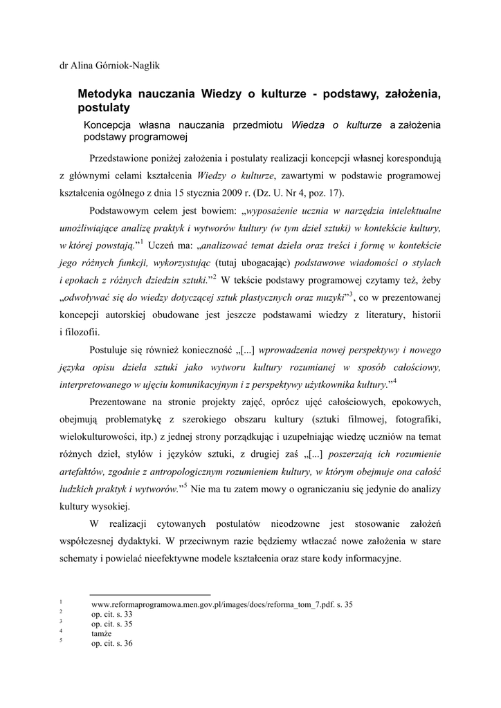 dr Alina Górniok-Naglik Metodyka nauczania Wiedzy o kulturze - podstawy, założenia, postulaty Koncepcja własna nauczania przedmiotu Wiedza o kulturze a założenia podstawy programowej Przedstawione poniżej założenia i postulaty realizacji koncepcji własnej korespondują z głównymi celami kształcenia Wiedzy o kulturze, zawartymi w podstawie programowej kształcenia ogólnego z dnia 15 stycznia 2009 r. (Dz. U. Nr 4, poz. 17). Podstawowym celem jest bowiem: „wyposażenie ucznia w narzędzia intelektualne umożliwiające analizę praktyk i wytworów kultury (w tym dzieł sztuki) w kontekście kultury, w której powstają.” 1 Uczeń ma: „analizować temat dzieła oraz treści i formę w kontekście jego różnych funkcji, wykorzystując (tutaj ubogacając) podstawowe wiadomości o stylach i epokach z różnych dziedzin sztuki.” 2 W tekście podstawy programowej czytamy też, żeby „odwoływać się do wiedzy dotyczącej sztuk plastycznych oraz muzyki” 3 , co w prezentowanej koncepcji autorskiej obudowane jest jeszcze podstawami wiedzy z literatury, historii i filozofii. Postuluje się również konieczność „[...] wprowadzenia nowej perspektywy i nowego języka opisu dzieła sztuki jako wytworu kultury rozumianej w sposób całościowy, interpretowanego w ujęciu komunikacyjnym i z perspektywy użytkownika kultury.” 4 Prezentowane na stronie projekty zajęć, oprócz ujęć całościowych, epokowych, obejmują problematykę z szerokiego obszaru kultury (sztuki filmowej, fotografiki, wielokulturowości, itp.) z jednej strony porządkując i uzupełniając wiedzę uczniów na temat różnych dzieł, stylów i języków sztuki, z drugiej zaś „[...] poszerzają ich rozumienie artefaktów, zgodnie z antropologicznym rozumieniem kultury, w którym obejmuje ona całość ludzkich praktyk i wytworów.” 5 Nie ma tu zatem mowy o ograniczaniu się jedynie do analizy kultury wysokiej. W realizacji cytowanych postulatów nieodzowne jest stosowanie założeń współczesnej dydaktyki. W przeciwnym razie będziemy wtłaczać nowe założenia w stare schematy i powielać nieefektywne modele kształcenia oraz stare kody informacyjne. 1 2 3 4 5 www.reformaprogramowa.men.gov.pl/images/docs/reforma_tom_7.pdf. s. 35 op. cit. s. 33 op. cit. s. 35 tamże op. cit. s. 36 Iwona Kurz w komentarzu do podstawy programowej przedmiotu Wiedza o kulturze pisze: „Projekt, forma utrwalona już w praktyce szkolnej, może być skupiony wokół określonego dzieła lub gatunku, badanego w różnych, najszerszych aspektach.” 6 Mamy tutaj postulat wykorzystania edukacji medialnej, mediów różnego rodzaju do multimedialnych wypowiedzi. Inaczej, wyróżnione w podstawie programowej media typu: słowo i obraz, mają funkcjonować na zajęciach z Wiedzy o kulturze za pośrednictwem różnych mediów technicznych, środków przekazu. Zamieszczone na stronie cykle zajęć zintegrowanych, konspekty zajęć wraz z prezentacjami multimedialnymi są pokłosiem prowadzonych przeze mnie zajęć z Metodyki nauczania wiedzy o kulturze oraz Praktyk szkolnych organizowanych i prowadzonych przez mgr Agnieszkę Matusiak. Scharakteryzowana poniżej koncepcja autorska nauczania przedmiotu Wiedza o kulturze była weryfikowana empirycznie. Stanowiła podstawę prowadzonych przeze mnie badań eksperymentalnych w latach 2002-2003 oraz 2006-2007. Dzięki wydatnej współpracy, za którą w tym miejscu dziękuję mgr Agnieszce Matusiak, w bieżącym roku akademickim studenci V-roku ASK mieli możliwość weryfikowania założeń teoretycznych w praktyce i uczestniczenia, w ramach praktyk, w eksperymencie pedagogicznym dotyczącym recepcji wytworów kultury w kontekście autokreacji młodzieży. Prezentowane projekty zajęć stanowią materiał dydaktyczny, który może zainspirować nauczycieli Wiedzy o kulturze, a także może stanowić kanwę samodzielnych poszukiwań dla studentów oraz uczniów przy tworzeniu autorskich prezentacji czy blogów. Cytowana uprzednio I. Kurz pisze: „[...] projekt - poza procesem pozyskiwania i porządkowania informacji [...] ma istotny wymiar praktyczny, ponieważ wiąże się ze stworzeniem zapisu efektu tych działań.” 7 Prezentacje, blogi (tworzone przez uczniów) mają zmuszać do refleksji nad tymi formami medialnymi oraz, co nie mniej istotne, forma projektu stanowi sposób na przekroczenie skromnych ram czasowych przedmiotu. Edukacja w zakresie Wiedzy o kulturze — zarys koncepcji własnej Proces kształcenia szkolnego za jedno z podstawowych zadań stawia sobie przygotowanie ogółu społeczeństwa do uczestnictwa w kulturze. Przedmiot Wiedza o kulturze stwarza szansę walki z wyjałowieniem estetycznym młodzieży, z ich zawężoną wyobraźnią, co jest skutkiem ogłuszenia medialnego i ogłupienia przez kulturę popularną, masową. 6 7 tamże op. cit. s. 36 Szczególnie istotnym jest złączenie sfery przeżyciowej z działaniową i z poznaniem, co stanowi jedno z podstawowych założeń współczesnej dydaktyki. Ekspozycja uczenia się przez przeżywanie, zacieśnienia więzi między intelektualną a intuicyjno-emocjonalną sferą psychiki ucznia leży u podstaw koncepcji własnej nauczania przedmiotu Wiedza o kulturze, a przedstawionej w książce autorskiej Sztuka w treściach nauczania. Na tropie korelacji i integracji w liceum 8 . Kolejnym założeniem, przydatnym w realizacji omawianego przedmiotu, jest przyjęcie idei integracji, jako punktu wyjścia do organizowania i przeprowadzania cyklów zajęć zintegrowanych. Idea ta jest jak najbardziej zasadna w odniesieniu do kształcenia na poziomie liceum. Należy podkreślić, że integracja to nie tylko łączenie bliskich sobie treści w układach wewnątrzprzedmiotowych czy międzyprzedmiotowych, ale to też – a może głównie – integrowanie działań edukacyjnych nauczyciela i uczniów w ramach pewnego kompleksu cyklu zajęć 9 . Projektując z uczniem zajęcia nauczyciel powinien zintegrować ich działa