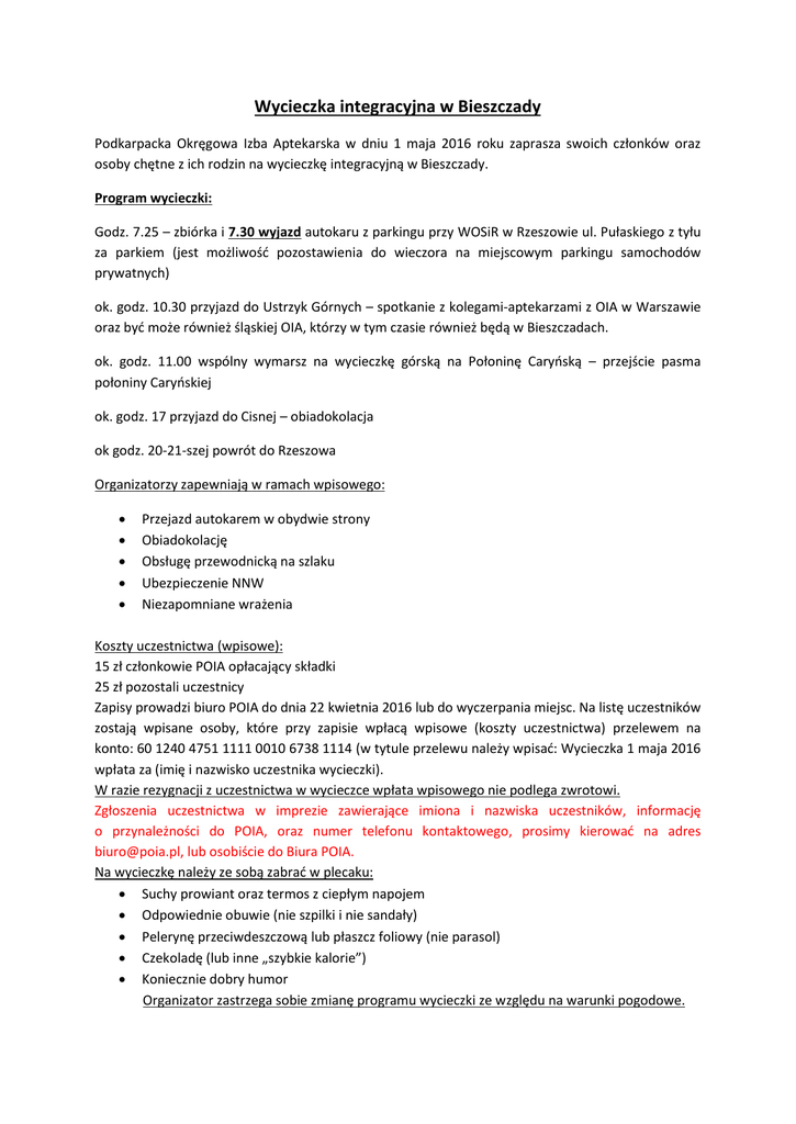 Wycieczka integracyjna w Bieszczady Podkarpacka Okręgowa Izba Aptekarska w dniu 1 maja 2016 roku zaprasza swoich członków oraz osoby chętne z ich rodzin na wycieczkę integracyjną w Bieszczady. Program wycieczki: Godz. 7.25 – zbiórka i 7.30 wyjazd autokaru z parkingu przy WOSiR w Rzeszowie ul. Pułaskiego z tyłu za parkiem (jest możliwość pozostawienia do wieczora na miejscowym parkingu samochodów prywatnych) ok. godz. 10.30 przyjazd do Ustrzyk Górnych – spotkanie z kolegami-aptekarzami z OIA w Warszawie oraz być może również śląskiej OIA, którzy w tym czasie również będą w Bieszczadach. ok. godz. 11.00 wspólny wymarsz na wycieczkę górską na Połoninę Caryńską – przejście pasma połoniny Caryńskiej ok. godz. 17 przyjazd do Cisnej – obiadokolacja ok godz. 20-21-szej powrót do Rzeszowa Organizatorzy zapewniają w ramach wpisowego: Przejazd autokarem w obydwie strony Obiadokolację Obsługę przewodnicką na szlaku Ubezpieczenie NNW Niezapomniane wrażenia Koszty uczestnictwa (wpisowe): 15 zł członkowie POIA opłacający składki 25 zł pozostali uczestnicy Zapisy prowadzi biuro POIA do dnia 22 kwietnia 2016 lub do wyczerpania miejsc. Na listę uczestników zostają wpisane osoby, które przy zapisie wpłacą wpisowe (koszty uczestnictwa) przelewem na konto: 60 1240 4751 1111 0010 6738 1114 (w tytule przelewu należy wpisać: Wycieczka 1 maja 2016 wpłata za (imię i nazwisko uczestnika wycieczki). W razie rezygnacji z uczestnictwa w wycieczce wpłata wpisowego nie podlega zwrotowi. Zgłoszenia uczestnictwa w imprezie zawierające imiona i nazwiska uczestników, informację o przynależności do POIA, oraz numer telefonu kontaktowego, prosimy kierować na adres [email protected], lub osobiście do Biura POIA. Na wycieczkę należy ze sobą zabrać w plecaku: Suchy prowiant oraz termos z ciepłym napojem Odpowiednie obuwie (nie szpilki i nie sandały) Pelerynę przeciwdeszczową lub płaszcz foliowy (nie parasol) Czekoladę (lub inne „szybkie kalorie”) Koniecznie dobry humor Organizator zastrzega sobie zmianę programu wycieczki ze względu na warunki pogodowe.