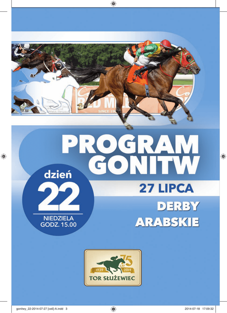 gonitwy_22-2014-07-27 [cs6]-A.indd 3 2014-07-18 17:09:32 Fani sportu dziękują graczom LOTTO Każda złotówka, którą przeznaczasz na gry liczbowe LOTTO, to 19 groszy dla sportu i kultury. Gramy dla sportu i kultury gonitwy_21-2014-07-06 [cs6]-A.indd 6 2014-06-27 18:50:59 SPIS GONITW 1 15:00 2 22 DZIEŃ 27 LIPCA 2014 Gonitwa handikapowa III grupy dla 3-letnich i starszych koni. Wagi według handikapu generalnego: 4-letnie i starsze minus 5 kg, 3-letnie minus 10 kg. dystans 1600 m suma nagród 11 550 zł Nagroda dodatkowa PKWK Gonitwa handikapowa III grupy dla 4-letnich i starszych koni czystej krwi arabskiej. Wagi według handikapu generalnego: 5-letnie i starsze minus 4 kg, 4-letnie minus 7 kg. dystans 1800 m suma nagród 8 400 zł Gonitwa dla 2-letnich koni II grupy. Nagroda dodatkowa PKWK dystans 1200 m suma nagród 16 625 zł 15:30 3 16:00 4 16:30 5 Nagroda PZHKA – (kat. B) Gonitwa dla 3-letnich klaczy czystej krwi arabskiej hodowli krajowej wpisanych do Polskiej Księgi Stadnej Koni Arabskich Czystej Krwi (PASB). dystans 2000 m suma nagród 24 500 zł Gonitwa dla 3-letnich i starszych koni wyłącznie IV grupy. Nagroda dodatkowa PKWK dystans 1200 m suma nagród 9 800 zł Nagroda Ofira – (kat. A) Gonitwa międzynarodowa dla 4-letnich i starszych koni czystej krwi arabskiej. dystans 2400 m suma nagród 35 000 zł Gonitwa dla 3-letnich koni III grupy. Nagroda dodatkowa PKWK dystans 1800 m suma nagród 11 550 zł 17:00 6 17:30 7 18:00 8 18:30 9 Derby Arabskie – (kat. A) dystans 3000 m suma nagród 70 000 zł Gonitwa dla 4-letnich ogierów i klaczy czystej krwi arabskiej hodowli krajowej wpisanych do Polskiej Księgi Stadnej Koni Arabskich Czystej Krwi (PASB). Nagroda Eldona 19:00 Gonitwa dla 3-letnich koni czystej krwi arabskiej I grupy hodowli krajowej wpisanych do Polskiej Księgi Stadnej Koni Arabskich Czystej Krwi (PASB). dystans 1800 m suma nagród 17 500 zł 10 Gonitwa dla 3-letnich i starszych koni wyłącznie IV grupy. Nagroda dodatkowa PKWK dystans 1200 m suma nagród 9 800 zł 19:30 JAK CZYTAĆ PROGRAM GONITW numer gonitwy 1 numer gonitwy w sezonie godzina rozpoczęcia gonitwy nagrody za poszczególne miejsca wyniki osiągnięte w danym roku kolejność na celowniku dystans i czas gonitwy gonitwy_22-2014-07-27 [cs6]-A.indd 5 Dandolo – Handikap Otwarcia Gonitwa handikapowa I grupy dla 4-letnich i starszych koni. Wagi według handikapu generalnego minus 11 kg. 1800 m 15:00 15 500 zł wypłaty nieobjęte planem gonitw NAGRODA DODATKOWA PKWK. (1) I II 6 200 zł III 3 100 zł IV 1 550 zł V dystans gonitwy 775 zł SUMA NAGRÓD 27 125 ZŁ 1 nazwa nagrody Jansen 2012ȩsȩȩsȩȩZ 14.10 IV gr. ȩZȩsȩ*UTRZENKAȩȩ-ORlNAȩȩJansen 59ȩDYSTȩIȩ MȩYȩMȩIȩnȩ,'RIGOREVAȩ*ASNAȩȩ,UCKYȩ-OMENTȩȩ+ARBONADOȩȩ sȩ1600m – 1’45,2”ȩȩsȩtor elastyczny (3,3)ȩsȩSTYLȩSILNIEȩ WYSYANYȩsȩðDALEKO suma nagród suma nagród zdobytych w danym roku przebieg gonitwy stan toru 2014-07-21 15:47:21 ($ ,$;T #$%&'$()*+%,&,$-.-&'*/01023*.,&'*/0+*,&4$($ 5$46 '%/,7( $/,(802/2%6( &'*.'$ /7,.9:9.)%&)/$0*; <%&4$(0 $)*.,&4$($ 5$46'6-.,&'*/02'6-.,202/2%&0$'29: &'** ,&/'&=;$ 5$46>$%5$;*&43*., 6%&' !" E E D E " F 9 09 * E F ?%? @A ? B %? AA ?C D !" E E D E F " ** BC " J L D N F I KM gonitwy_22-2014-07-27 [cs6]-A.indd 6 E FH" %?3&G! BCH " D KM KL @K @F "D JL * 9 %4 E "HF I KF "M JL D" FJ KMF 2014-07-21 15:48:13 4 @A ? 6 B 4 AA ?C " L !" E E D E F " ** E F 9.S&0'* 40 * E " 3&G! BC BCH @ @ D " D KF J K@ "D L @M DM / "A ? 6 B !@ E E F E " *** gonitwy_22-2014-07-27 [cs6]-A.indd 7 E F ** D E " * 9.S&0'* /,( E D 2014-07-21 15:48:14 3&G! BCH " D K@ J @J JF L DM K@M D K@M @JM N @KM J@M F ""D DN@ I LMJ KMMF KM N@M KJJM 9 JA ? 6 B 9 AA ?C F !@ E E " *V E J E " *** E F E J ** K E F * 9.S&0'* 90 BC E K 3&G! BC BCH J @J JF L K@M @JM D "DM N@M N FJM KDFM F KDFM ""DM I "M@J DMJF KM LMJM KMMFM gonitwy_22-2014-07-27 [cs6]-A.indd 8 2014-07-21 15:48:14 /%S / ? "AA A ?A,A? -O OC? ? BC A A BCH BCA O O H P *!@ **!" ***!J *BCH P@Q"QJR@J P@JQ@RJF !@ 0' ? L A A ?A ,A? OC O? ? BC A A BCH BC A O O H P *U@ **U" ***UKE *VUJ VU@ *BCH P@W"WKWJW@RJF PJFW@RID !@ )2)/.3&G )!3&G 4 OOOC3&G /OC"H XH Y O?O ?H / A *H H H? / )2)/.=9*$'$ 4O )!=9*$'$ OC H ? ) O H E H ? 60$* !% AO B ?A ?C !)/ZB ?OBC ?H ?HCH OA/ !0 BCAAA? B 6 HH !0BC !) ?, / 0B A - [ O A /0B A)OH /H gonitwy_22-2014-07-27 [cs6]-A.indd 9 2014-07-21 15:48:14 1 Gonitwa handikapowa III grupy dla 3-letnich i starszych koni. Wagi według handikapu generalnego: 4-letnie i starsze minus 5 kg, 3-letnie minus 10 kg. NAGRODA DODATKOWA PKWK (183) 15:00 I 6 600 zł II 2 640 zł III 1 320 zł IV 660 zł V 1600 m 330 zł SUMA NAGRÓD 11 550 ZŁ NR KOŃ POCHODZENIE HODOWCA, WŁAŚCICIEL, STAJNIA, TRENER 1 Rosalka (GER) 2 Newman okulary 3 Crucis Abbey (IRE) 4 Navos 5 Lebensart (GER) okulary 6 Murager (IRE) 7 Pani Minister (IRE) okulary JEŹDZIEC KG (POWOŻĄCY) (-4) J.Wyrzyk 57,5 3 lata klacz kasztanowata P: Tertullian – Rimera po Sholokhov H: Gestüt Erftmühle W: A.Wyrzyk S: Rosłońce T: A.Wyrzyk dż. A.Turgaev 59 3 lata ogier ciemnogniady P: Nowogródek – Nuvolona po Don Corleone H: SK Golejewko W: SK Golejewko i B.Olkowska S: Golejewko IX T: W.Olkowski (-4) K.Brygier 59,5 6 lat wałach gniady P: Acclamation – Golden Ribes po Charismatic H: M.G. Daly W: M.Krzyśków i K.Brygier S: Bayonetta T: M.Krzyśków dż. W.Szymczuk 57 3 lata ogier gniady P: Nowogródek – Nekanda po Fourth of June H: SK Golejewko W: SK Golejewko i M.Janikowski S: Golejewko IV T: M.Janikowski dż. S.Wasiutow 56 3 lata klacz ciemnogniada P: Martillo – Liebste po Nebos H: Gestüt Evershorst W: N.Magomedov S: Faworyt T: K.Ziemiański dż. V.Popov 58,5 dż. S.Mazur 54,5 3 lata klacz siwa P: Verglas – Mascara po Mtoto H: Mascara Partnership W: Y.Baizharkinov S: Nurdaulet T: J.Siwonia 3 lata klacz gniada P: Iffraaj – Mrs Mason po Turtle Island H: Airlie Stud W: Bohema – M.Bochiński S: Bohema T: A.Wyrzyk OCENA SZANS KONI: Polską hodowlę reprezentują w stawce tylko przyrodni bracia Newman i Navos.