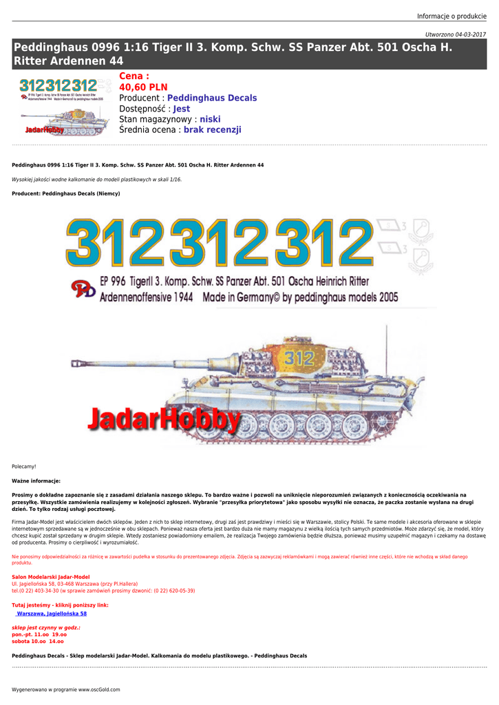 Informacje o produkcie Utworzono 04-03-2017 Peddinghaus 0996 1:16 Tiger II 3. Komp. Schw. SS Panzer Abt. 501 Oscha H. Ritter Ardennen 44 Cena : 40,60 PLN Producent : Peddinghaus Decals Dostępność : Jest Stan magazynowy : niski Średnia ocena : brak recenzji Peddinghaus 0996 1:16 Tiger II 3. Komp. Schw. SS Panzer Abt. 501 Oscha H. Ritter Ardennen 44 Wysokiej jakości wodne kalkomanie do modeli plastikowych w skali 1/16. Producent: Peddinghaus Decals (Niemcy) Polecamy! Ważne informacje: Prosimy o dokładne zapoznanie się z zasadami działania naszego sklepu. To bardzo ważne i pozwoli na uniknięcie nieporozumień związanych z koniecznością oczekiwania na przesyłkę. Wszystkie zamówienia realizujemy w kolejności zgłoszeń. Wybranie "przesyłka priorytetowa" jako sposobu wysyłki nie oznacza, że paczka zostanie wysłana na drugi dzień. To tylko rodzaj usługi pocztowej. Firma Jadar-Model jest właścicielem dwóch sklepów. Jeden z nich to sklep internetowy, drugi zaś jest prawdziwy i mieści się w Warszawie, stolicy Polski. Te same modele i akcesoria oferowane w sklepie internetowym sprzedawane są w jednocześnie w obu sklepach. Ponieważ nasza oferta jest bardzo duża nie mamy magazynu z wielką ilością tych samych przedmiotów. Może zdarzyć się, że model, który chcesz kupić został sprzedany w drugim sklepie. Wtedy zostaniesz powiadomiony emailem, że realizacja Twojego zamówienia będzie dłuższa, ponieważ musimy uzupełnić magazyn i czekamy na dostawę od producenta. Prosimy o cierpliwość i wyrozumiałość. Nie ponosimy odpowiedzialności za różnicę w zawartości pudełka w stosunku do prezentowanego zdjęcia. Zdjęcia są zazwyczaj reklamówkami i mogą zawierać również inne części, które nie wchodzą w skład danego produktu. Salon Modelarski Jadar-Model Ul. Jagiellońska 58, 03-468 Warszawa (przy Pl.Hallera) tel.(0 22) 403-34-30 (w sprawie zamówień prosimy dzwonić: (0 22) 620-05-39) Tutaj jesteśmy - kliknij poniższy link: Warszawa, Jagiellońska 58 sklep jest czynny w godz.: pon.-pt. 11.oo 19.oo sobota 10.oo 14.oo Peddinghaus Decals - Sklep modelarski Jadar-Model. Kalkomania do modelu plastikowego. - Peddinghaus Decals Wygenerowano w programie www.oscGold.com