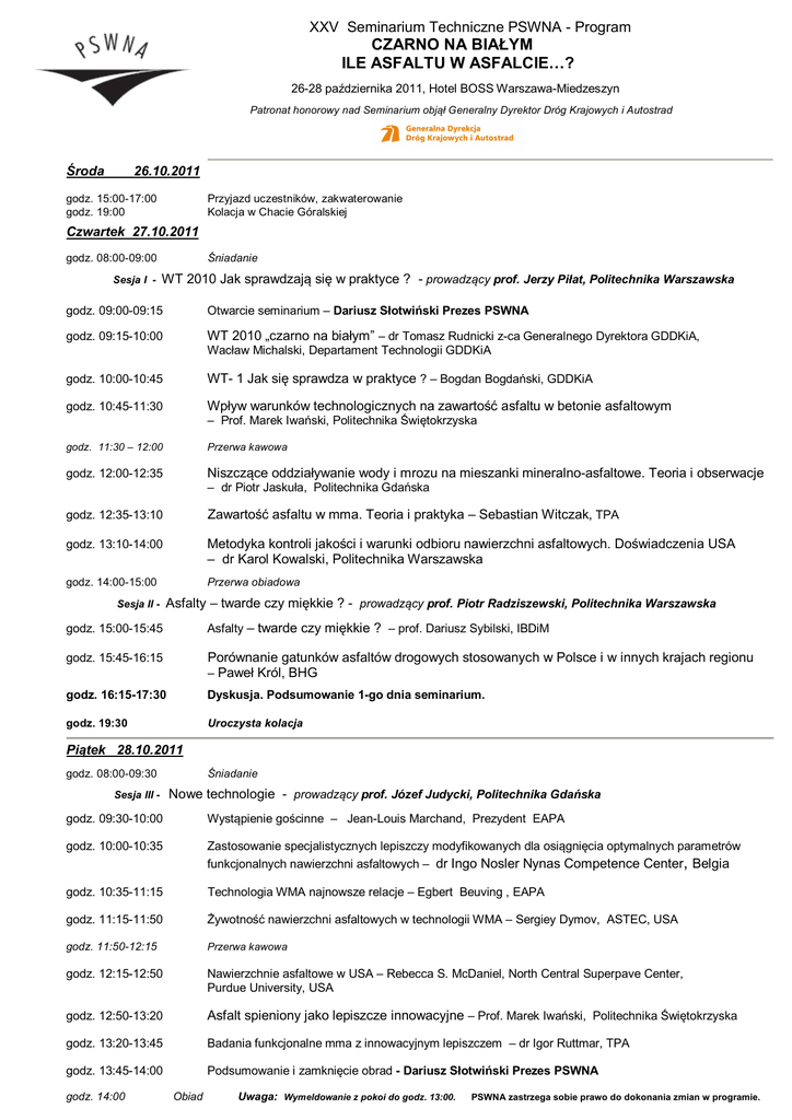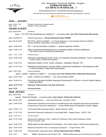 XXV Seminarium Techniczne PSWNA - Program CZARNO NA BIAŁYM ILE ASFALTU W ASFALCIE…? 26-28 października 2011, Hotel BOSS Warszawa-Miedzeszyn Patronat honorowy nad Seminarium objął Generalny Dyrektor Dróg Krajowych i Autostrad Środa 26.10.2011 godz. 15:00-17:00 godz. 19:00 Przyjazd uczestników, zakwaterowanie Kolacja w Chacie Góralskiej Czwartek 27.10.2011 godz. 08:00-09:00 Sesja I - Śniadanie WT 2010 Jak sprawdzają się w praktyce ? - prowadzący prof. Jerzy Piłat, Politechnika Warszawska godz. 09:00-09:15 Otwarcie seminarium – Dariusz Słotwiński Prezes PSWNA godz. 09:15-10:00 WT 2010 „czarno na białym” – dr Tomasz Rudnicki z-ca Generalnego Dyrektora GDDKiA, Wacław Michalski, Departament Technologii GDDKiA godz. 10:00-10:45 WT- 1 Jak się sprawdza w praktyce ? – Bogdan Bogdański, GDDKiA godz. 10:45-11:30 Wpływ warunków technologicznych na zawartość asfaltu w betonie asfaltowym – Prof. Marek Iwański, Politechnika Świętokrzyska godz. 11:30 – 12:00 Przerwa kawowa godz. 12:00-12:35 Niszczące oddziaływanie wody i mrozu na mieszanki mineralno-asfaltowe. Teoria i obserwacje – dr Piotr Jaskuła, Politechnika Gdańska godz. 12:35-13:10 Zawartość asfaltu w mma. Teoria i praktyka – Sebastian Witczak, TPA godz. 13:10-14:00 Metodyka kontroli jakości i warunki odbioru nawierzchni asfaltowych. Doświadczenia USA – dr Karol Kowalski, Politechnika Warszawska godz. 14:00-15:00 Przerwa obiadowa Sesja II - Asfalty – twarde czy miękkie ? - prowadzący prof. Piotr Radziszewski, Politechnika Warszawska godz. 15:00-15:45 Asfalty – twarde czy miękkie ? – prof. Dariusz Sybilski, IBDiM godz. 15:45-16:15 Porównanie gatunków asfaltów drogowych stosowanych w Polsce i w innych krajach regionu – Paweł Król, BHG godz. 16:15-17:30 Dyskusja. Podsumowanie 1-go dnia seminarium. godz. 19:30 Uroczysta kolacja Piątek 28.10.2011 godz. 08:00-09:30 Sesja III - Śniadanie Nowe technologie - prowadzący prof. Józef Judycki, Politechnika Gdańska godz. 09:30-10:00 Wystąpienie gościnne – Jean-Louis Marchand, Prezydent EAPA godz. 10:00-10:35 Zastosowanie specjalistycznych lepiszczy modyfikowanych dla osiągnięcia optymalnych parametrów funkcjonalnych nawierzchni asfaltowych – dr Ingo Nosler Nynas Competence Center, Belgia godz. 10:35-11:15 Technologia WMA najnowsze relacje – Egbert Beuving , EAPA godz. 11:15-11:50 Żywotność nawierzchni asfaltowych w technologii WMA – Sergiey Dymov, ASTEC, USA godz. 11:50-12:15 Przerwa kawowa godz. 12:15-12:50 Nawierzchnie asfaltowe w USA – Rebecca S. McDaniel, North Central Superpave Center, Purdue University, USA godz. 12:50-13:20 Asfalt spieniony jako lepiszcze innowacyjne – Prof. Marek Iwański, Politechnika Świętokrzyska godz. 13:20-13:45 Badania funkcjonalne mma z innowacyjnym lepiszczem – dr Igor Ruttmar, TPA godz. 13:45-14:00 Podsumowanie i zamknięcie obrad - Dariusz Słotwiński Prezes PSWNA godz. 14:00 Obiad Uwaga: Wymeldowanie z pokoi do godz. 13:00. PSWNA zastrzega sobie prawo do dokonania zmian w programie.
