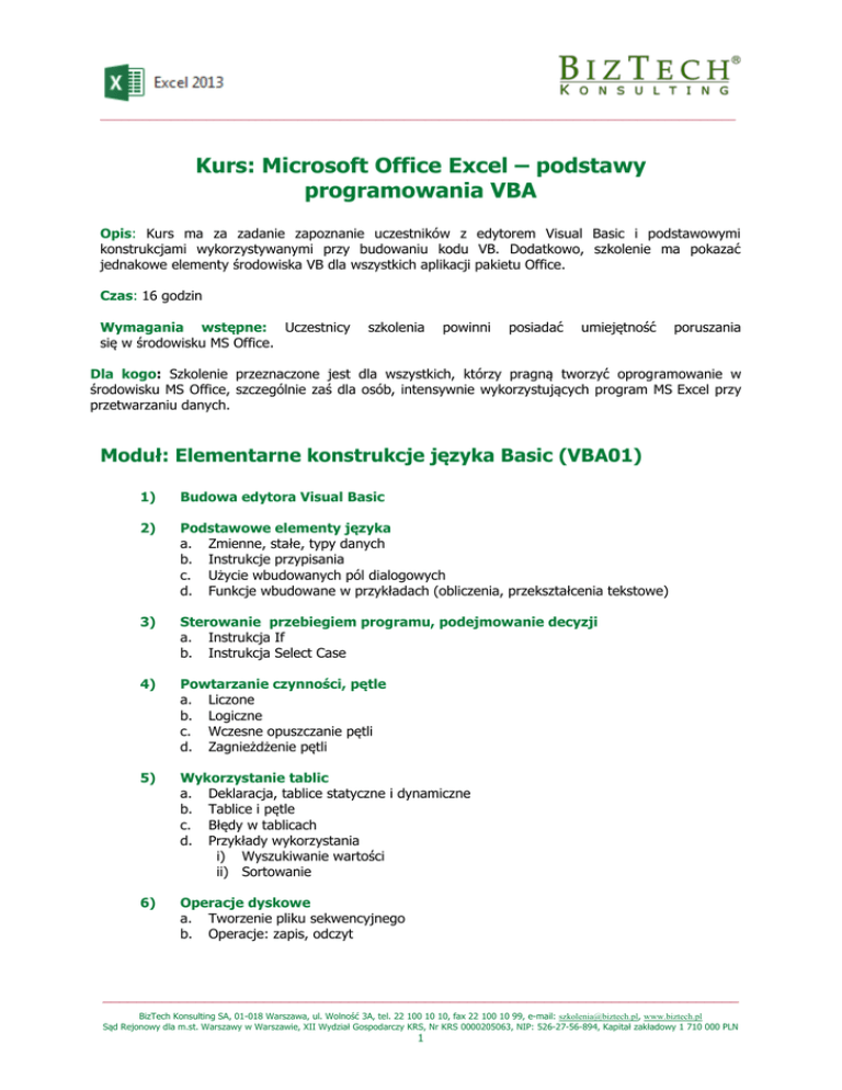 __________________________________________________________________________________________ Kurs: Microsoft Office Excel – podstawy programowania VBA Opis: Kurs ma za zadanie zapoznanie uczestników z edytorem Visual Basic i podstawowymi konstrukcjami wykorzystywanymi przy budowaniu kodu VB. Dodatkowo, szkolenie ma pokazać jednakowe elementy środowiska VB dla wszystkich aplikacji pakietu Office. Czas: 16 godzin Wymagania wstępne: Uczestnicy się w środowisku MS Office. szkolenia powinni posiadać umiejętność poruszania Dla kogo: Szkolenie przeznaczone jest dla wszystkich, którzy pragną tworzyć oprogramowanie w środowisku MS Office, szczególnie zaś dla osób, intensywnie wykorzystujących program MS Excel przy przetwarzaniu danych. Moduł: Elementarne konstrukcje języka Basic (VBA01) 1) Budowa edytora Visual Basic 2) Podstawowe elementy języka a. Zmienne, stałe, typy danych b. Instrukcje przypisania c. Użycie wbudowanych pól dialogowych d. Funkcje wbudowane w przykładach (obliczenia, przekształcenia tekstowe) 3) Sterowanie przebiegiem programu, podejmowanie decyzji a. Instrukcja If b. Instrukcja Select Case 4) Powtarzanie czynności, pętle a. Liczone b. Logiczne c. Wczesne opuszczanie pętli d. Zagnieżdżenie pętli 5) Wykorzystanie tablic a. Deklaracja, tablice statyczne i dynamiczne b. Tablice i pętle c. Błędy w tablicach d. Przykłady wykorzystania i) Wyszukiwanie wartości ii) Sortowanie 6) Operacje dyskowe a. Tworzenie pliku sekwencyjnego b. Operacje: zapis, odczyt ___________________________________________________________________________ BizTech Konsulting SA, 01-018 Warszawa, ul. Wolność 3A, tel. 22 100 10 10, fax 22 100 10 99, e-mail: [email protected], www.biztech.pl Sąd Rejonowy dla m.st. Warszawy w Warszawie, XII Wydział Gospodarczy KRS, Nr KRS 0000205063, NIP: 526-27-56-894, Kapitał zakładowy 1 710 000 PLN 1 __________________________________________________________________________________________ Moduł: Błędy w programach (VBA02) 1) Rodzaje błędów 2) Tryb przerwania, analiza kodu 3) Obsługa błędów wykonania 4) Tabela kodów błędów Moduł: Podstawowe zastosowania Visual Basic w MS Excel (VBAEX01) 1) Rejestrator makr a. Nagrywanie sekwencji czynności b. Czytanie i korekta kodu c. Przykłady wykorzystania makr przy automatyzacji pracy 2) Własne paski narzędzi 3) Wykorzystanie własnych funkcji na poziomie arkusza kalkulacyjnego a. Specyfika funkcji b. Wywoływanie funkcji c. Przykłady wykorzystania funkcji podczas przetwarzania danych 4) Wykorzystanie w arkuszu kontrolek a. Pasek Formularze b. Przybornik formantów c. Pojęcie i specyfika programowania zdarzeniowego d. Wykorzystanie funkcji do kontroli poprawności danych ___________________________________________________________________________ BizTech Konsulting SA, 01-018 Warszawa, ul. Wolność 3A, tel. 22 100 10 10, fax 22 100 10 99, e-mail: [email protected], www.biztech.pl Sąd Rejonowy dla m.st. Warszawy w Warszawie, XII Wydział Gospodarczy KRS, Nr KRS 0000205063, NIP: 526-27-56-894, Kapitał zakładowy 1 710 000 PLN 2