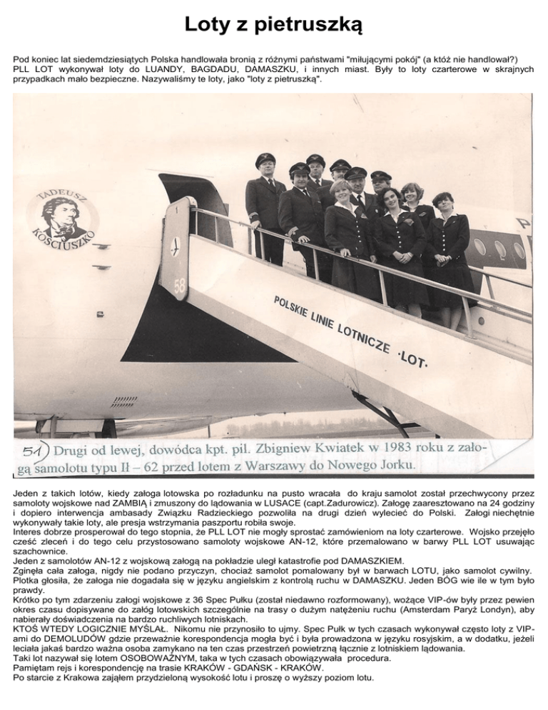 Loty z pietruszką Pod koniec lat siedemdziesiątych Polska handlowała bronią z różnymi państwami "miłującymi pokój" (a któż nie handlował?) PLL LOT wykonywał loty do LUANDY, BAGDADU, DAMASZKU, i innych miast. Były to loty czarterowe w skrajnych przypadkach mało bezpieczne. Nazywaliśmy te loty, jako "loty z pietruszką". Jeden z takich lotów, kiedy załoga lotowska po rozładunku na pusto wracała do kraju samolot został przechwycony przez samoloty wojskowe nad ZAMBIĄ i zmuszony do lądowania w LUSACE (capt.Zadurowicz). Załogę zaaresztowano na 24 godziny i dopiero interwencja ambasady Związku Radzieckiego pozwoliła na drugi dzień wylecieć do Polski. Załogi niechętnie wykonywały takie loty, ale presja wstrzymania paszportu robiła swoje. Interes dobrze prosperował do tego stopnia, że PLL LOT nie mogły sprostać zamówieniom na loty czarterowe. Wojsko przejęło cześć zleceń i do tego celu przystosowano samoloty wojskowe AN-12, które przemalowano w barwy PLL LOT usuwając szachownice. Jeden z samolotów AN-12 z wojskową załogą na pokładzie uległ katastrofie pod DAMASZKIEM. Zginęła cała załoga, nigdy nie podano przyczyn, chociaż samolot pomalowany był w barwach LOTU, jako samolot cywilny. Plotka głosiła, że załoga nie dogadała się w języku angielskim z kontrolą ruchu w DAMASZKU. Jeden BÓG wie ile w tym było prawdy. Krótko po tym zdarzeniu załogi wojskowe z 36 Spec Pułku (został niedawno rozformowany), wożące VIP-ów były przez pewien okres czasu dopisywane do załóg lotowskich szczególnie na trasy o dużym natężeniu ruchu (Amsterdam Paryż Londyn), aby nabierały doświadczenia na bardzo ruchliwych lotniskach. KTOŚ WTEDY LOGICZNIE MYŚLAŁ. Nikomu nie przynosiło to ujmy. Spec Pułk w tych czasach wykonywał często loty z VIPami do DEMOLUDÓW gdzie przeważnie korespondencja mogła być i była prowadzona w języku rosyjskim, a w dodatku, jeżeli leciała jakaś bardzo ważna osoba zamykano na ten czas przestrzeń powietrzną łącznie z lotniskiem lądowania. Taki lot nazywał się lotem OSOBOWAŻNYM, taka w tych czasach obowiązywała procedura. Pamiętam rejs i korespondencję na trasie KRAKÓW - GDAŃSK - KRAKÓW. Po starcie z Krakowa zająłem przydzieloną wysokość lotu i proszę o wyższy poziom lotu. Kraków wieża odpowiada: Nie mogę dać wyżej, bo przed wami leci OSOBOWAZNY. Ktoś z innej załogi włącza się i mówi: Pamiętaj przyjacielu, że kto w powietrzu to każdy ważny. Wieża odpowiada: Nie dyskutujcie, bo nie wiecie, kto leci. Jeszcze ktoś sie włącza i mówi: W myśl przepisów życie uczonego i wariata jest jednakowo ważne. Tego już było za wiele. Zapanowała na jakiś czas cisza w eterze, po czym wieża wywołuje mój samolot i mówi: Kapitan Kwiatek po przylocie z Gdańska zgłosi się na wieżę. Po przylocie do Krakowa "czterech smutnych" na wieży zaczęło mnie opieprzać za głupią dyskusję niezgodną z przepisami. Wytłumaczyłem się, że nie tylko mój samolot był w powietrzu na tej samej częstotliwości radiowej. Co było prawdą. Usłyszałem: Słuchajcie towarzyszu kapitanie, aby to było ostatni raz. Takie to były czasy. W dniu 12 maja 1977 roku moja załoga przyleciała do BAGDADU, jako pasażerowie, aby w dniu następnym wykonać rejs z ładunkiem specjalnym na trasie BAGDAD - ADDIS ABEBA w Etiopii. Drugi pilot Andrzej Cieślikowski pobrał z kasy PLL LOT 20 000 USD na opłaty za paliwo, lądowanie, catering, sprzątanie i inne nieprzewidziane wydatki. Dla nas była to KOSMICZNA suma, biorąc pod uwagę, że w tym czasie oficjalna cena bankowa dolara wynosiła 30 -35 złotych a czarnorynkowa cena wahała się w granicach 130 -140 złotych za dolara. Nasze zarobki w tym czasie na najlepiej opłacanym samolocie IŁ-62 w zależności od ilości wylatanych godzin oraz od funkcji sprawowanej na pokładzie wynosiły 5 000 - 7000 złotych. Potem w latach osiemdziesiątych wobec gigantyczncznej inflacji staliśmy się milionerami, aby po wymianie pieniędzy w latach dziewięćdziesiątych wymienić: Jeden milion za sto nowych złotych. To takie małe przypomnienie dla młodzieży. Andrzej zapakował 20 000 USD do saszetki przytwierdził do ręki, w hotelu saszetkę pod poduszkę i na wszelki wypadek krzesło pod drzwiami. W dniu 12 maja obserwuję temperaturę na lotnisku w Bagdadzie, która dochodzi w południe do +40 stopni Celsjusza (na pasie startowym od rozgrzanego betonu napewno wyższa). Wysyłam teleks do Warszawy z prośbą, aby przyspieszyć przylot samolotu do Bagdadu. Samolot przyleciał, ale 2 godziny później od czasu rozkładowego przylotu, w dodatku nie przywiózł zgody dyplomatycznej na przelot przez terytorium ARABII SAUDYJSKIEJ, która odmówiła zgody na przelot. Pozostawiło to nas w sytuacji niemal dramatycznej, nie mamy alternatywy pozostaje dotankować samolot do maksymalnie dopuszczalnego ciężaru samolotu do startu i jak najszybciej startować zwłaszcza, że kończy się termin innych zgód dyplomatycznych. Czas lotu około 7,5 godziny, czas nagli rośnie temperatura otoczenia. 0graniczenia producenta dla naszego samolotu to temperatura otoczenia dla silnika +45 stopni oraz operowanie na lotniskach do 3 000 metrów nad poziom morza. Zbieram załogę i informuję, że rozliczyłem długość startu, z którego wynika, że prędkość Vr. (prędkość rotacji podniesienie nosa samolotu do góry) osiągniemy na końcówce pasa startowego, a wiec start będzie na granicach bezpieczeństwa. Pokiwali głowami - skoro nie mamy innego wyjścia startujmy jak najszybciej. Składamy plan lotu do ADDIS ABEBY wpisując lot czarterowy, ładunek: pomoc charytatywna i medykamenty. Załoga, od której przejęliśmy samolot pomimo zmęczenia nie idzie do hotelu - czeka na nasz start. Startujemy: wiatr cisza , temperatura + 35 stopni. Samolot wolno nabiera prędkości obliczenia się sprawdzają, wreszcie upragniona informacja od nawigatora, który krzyczy Vr. Silniki 