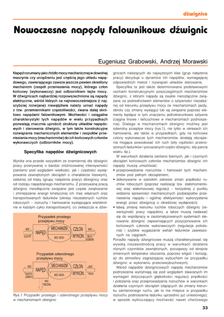 dŸwignice Nowoczesne napêdy falownikowe dŸwignic Eugeniusz Grabowski, Andrzej Morawski Napęd rozumiany jako źródło mocy mechanicznej w dowolnej maszynie czy urządzeniu jest częścią jego układu napę− dowego, zawierającego zawsze jeszcze pewien określony mechanizm (zespół przeniesienia mocy), którego człon końcowy (wykonawczy) jest odbiornikiem tejże mocy. W dźwignicach najbardziej rozpowszechnione są napędy elektryczne, wśród których za najnowocześniejsze (i naj− szybciej rozwijane) niewątpliwie należy uznać napędy z tzw. przemiennikami częstotliwości, zwane dalej skró− towo napędami falownikowymi. Możliwości i osiągalne charakterystyki tych napędów w wielu przypadkach pozwalają znacznie uprościć strukturę układów napędo− wych i sterowania dźwignic, w tym także konstrukcyjne rozwiązania mechanicznych elementów i zespołów prze− niesienia mocy (mechanizmów) do ich końcowych członów wykonawczych (odbiorników mocy). Specyfika napędów dźwignicowych Wynika ona przede wszystkim ze znamiennej dla dźwignic pracy przerywanej o bardzo zróżnicowanej intensywności (zarówno pod względem wielkości, jak i częstości wystę− powania zewnętrznych obciążeń o charakterze losowym), zależnej od klasy (grupy natężenia pracy) dźwignicy oraz od rodzaju napędzanego mechanizmu. Z przerywaną pracą dźwignic nieodłącznie związane jest częste zwiększanie i zmniejszanie energii kinetycznej ich mas własnych oraz transportowanych ładunków (okresy nieustalonych ruchów roboczych – rozruchy i hamowania występujące wielokrot− nie w każdym cyklu transportowym), co zwłaszcza w dźwi− Rys.1 Przypadki prostego i odwrotnego przepływu mocy w mechanizmach dźwignic gnicach należących do najwyższych klas (grup natężenia pracy) decyduje o dynamice ich napędów, wymagającej odpowiednich metod i rozwiązań układów sterowania. Specyfika ta jest także determinowana podstawowymi cechami konstrukcyjnymi poszczególnych mechanizmów dźwignic, z którymi napędy są zwykle nierozłącznie zwią− zane za pośrednictwem elementów o sztywności niezależ− nej od kierunku przepływu mocy (w mechanizmach jazdy, obrotu czy zmiany wysięgu) lub są związane poprzez ele− menty będące w tym znaczeniu jednokierunkowo sztywne (cięgna linowe i łańcuchowe w mechanizmach podnosze− nia). Dlatego w mechanizmach dźwignic możliwy jest odwrotny przepływ mocy (rys.1), nie tylko w okresach ich hamowania, ale także w przypadkach, gdy na końcowe człony wykonawcze tych mechanizmów działają obciąże− nia mogące powodować ich ruch (siły ciężkości przeno− szonych ładunków i poruszanych części dźwignic, siły parcia wiatru itp.). W warunkach działania zarówno biernych, jak i czynnych obciążeń końcowych członów mechanizmów dźwignic ich napędy muszą umożliwiać: · przeprowadzanie rozruchów i hamowań tych mechani− zmów pod pełnym obciążeniem; · dokonywanie w szerokim zakresie zmian prędkości ru− chów roboczych (poprzez realizację tzw. stałomomento− wej oraz stałomocowej regulacji – korzystnej z punktu widzenia sprawności mechanicznych podzespołów prze− niesienia napędu i ogólnej efektywności wykorzystania energii przez dźwignicę o określonej wydajności); · łatwą zmianę kierunku ruchów roboczych dźwignic (re− wersyjność pracy napędów), a także muszą nadawać się do współpracy w zautomatyzowanych systemach ste− rowania dźwignic zapewniających pozycjonowanie ich końcowych członów wykonawczych (regulacja położe− nia) i szybkie wygaszanie wahań ładunków zawieszo− nych na cięgnach. Ponadto napędy dźwignicowe muszą charakteryzować się wysoką niezawodnością pracy w warunkach działania różnych czynników zewnętrznych, począwszy od skrajnie zmiennych temperatur otoczenia, poprzez wilgoć i korozję, aż do atmosfery zagrażającej wybuchem (w przypadku dźwignic w wykonaniu przeciwwybuchowym). Wśród napędów dźwignicowych napędy mechanizmów podnoszenia wyróżniają się pod względem stawianych im wymagań dotyczących głębokości regulacji prędkości i położenia oraz przeprowadzania rozruchów w warunkach działania czynnych obciążeń (dążących do zmiany kierun− ku zamierzonego ruchu, jak to ma miejsce w przypadku rozruchu podnoszenia ładunku uprzednio już uniesionego), w sposób wykluczający możliwość nawet chwilowego 33 dŸwignice odwrócenia kierunku przepływu mocy (chwilowe opadnię− cie ładunku przy rozruchu jego podnoszenia). Występuje tu problem, różnie rozwiązywany w praktyce, przejęcia przez silnik w początkowej fazie rozruchu momentu od ciężaru podnoszonego ładunku, obciążającego hamulec mecha− niczny przed jego zluzowaniem. W napędach mechanizmów jazdy zwłaszcza dźwignic o dużych rozpiętościach ustrojów nośnych (suwnice pomo− stowe i bramowe z indywidualnymi napędami każdej z czołownic czy podpór) oprócz regulacji prędkości i po− łożenia istnieje potrzeba kontroli momentu celem zapobie− żenia poślizgowi kół odciążonej strony podczas rozruchu. Krótka charakterystyka współczesnych napędów falownikowych Typowy napęd falownikowy składa się z silnika indukcyj− nego klatkowego oraz przemiennika częstotliwości. Silnik klatkowy to najprostszy powszechnie stosowany przetwor− nik energii elektrycznej na mechaniczną (i odwrotnie), któ− rego regulacja prędkości obrotowej oparta jest na zastoso− waniu źródła energii elektrycznej prądu przemiennego o zmiennej częstotliwości. Takim źródłem jest obecnie po− wszechnie stosowany pośredni przemiennik częstotliwości, złożony z prostownika, zasilanego z dostępnej sieci prądu przemiennego, pośredniego obwodu prądu stałego i falow− nika. Falownik kształtuje przebieg napięcia i prądu o regu− lowanej amplitudzie, częstotliwości i fazie. Silnik klatkowy zasilany z taki