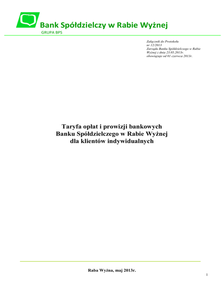 Taryfa podmioty - Bank Spółdzielczy w Rabie Wyżnej