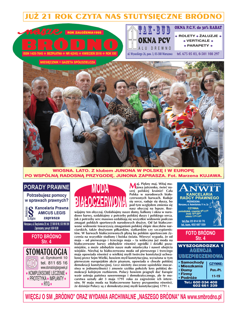 JUŻ 21 ROK CZYTA NAS STUTYSIĘCZNE BRÓDNO TA K- BU D ROK ZAŁOŻENIA1995 OKNA PCV A L U ISSN 1425-7645 v BEZPŁATNA v NR 4(245) v KWIECIEŃ 2016 v ROK XXI D R E W N O ul. Wysockiego 26, paw. 3, 03-388 Warszawa OKNA P.C.V. do 30% RABAT v ROLETY v ŻALUZJE v VERTICALE v v PARAPETY v v tel. 675 05 03, 0-501 108 297 MIESIĘCZNIK v GAZETA SPÓŁDZIELCZA WIOSNA. LATO. Z klubem JUNONA W POLSKĘ I W EUROPĘ PO WSPÓLNĄ RADOSNĄ PRZYGODĘ. JUNONA ZAPRASZA. Fot. Marzena KUJAWA. aj. Piękny maj. Witaj majowa jutrzenko, świeć naszej polskiej krainie! Cała Polska w narodowych białoczerwonych barwach. Raduje się serce, raduje się dusza, bo pod tym względem zmienia się nasz obyczaj na lepsze. Rozwijajmy ten obyczaj. Ozdabiajmy nasze domy, balkony i okna w narodowe barwy, ozdabiajmy z potrzeby polskiej duszy i polskiego serca. Jak z potrzeby serc masowo ozdabiają się wszystkie widownie podczas zmagań polskich sportowych narodowych drużyn. Od lat białoczerwone widownie towarzyszą zmaganiom polskiej ekipie skoczków narciarskich, także drużynom piłkarskim, siatkarskim czy szczypiornistów. W barwach białoczerwonych płyną ku polskim sportowcom życzenia na wszystkie stadiony i boiska świata. Wierzyć wypada, że od maja – od pierwszego i trzeciego maja – ta widoczna już moda na białoczerwone barwy zdobędzie również ogródki i działki pozamiejskie, a może zdobędzie nasze małe miasteczka i nawet obejścia wiejskie. Niechaj ta białoczerwona moda od pierwszego i trzeciego maja opowiada również o wielkiej myśli twórców konstytucji uchwalonej przez Sejm Wielki, bowiem myśl konstytucyjna, wyrażona w tym pierwszym europejskim akcie pisanym, opowiada o chwale polskiej demokracji konstytucyjnej. Lecz niestety ówczesne sąsiedzkie mocarstwa w jednomyślności i zmowie szybko położyły kres polskiej demokracji kolejnym rozbiorem. Polacy bowiem pragnęli dać Europie wzór ustroju państwa suwerennego i demokratycznego, ale te mocarstwa uznały akt 3 maja 1791 roku za zagrożenie ich interesów. W maju moda na białoczerwone barwy przypomina również, że dzisiejsi Polacy są z demokratycznej myśli konstytucyjnej 1791 r. MODA BIAŁOCZERWONA FOTO BRÓDNO Str. 4 STOMATOLOGIA ul. Syrokomli 10 tel. 811 65 16 www.stomatologtargowek.pl H KOMPLEKSOWE LECZENIE H H PROTETYKA H IMPLANTY H H RTG H M KANCELARIA RADCY PRAWNEGO PRZENIESIONA: Warszawa, ul. Nadwiślańska 11 m. 2a CZYNNA: poniedziałek, czwartek 900-1100 środa 1830-2000 sobota 1100-1400 tel./fax 22 814 53 70 tel. kom. 602 687 559 FOTO BRÓDNO Str. 4 WIĘCEJ O SM „BRÓDNO” ORAZ WYDANIA ARCHIWALNE „NASZEGO BRÓDNA” NA www.smbrodno.pl 2 DYŻURY CZŁONKÓW RADY NADZORCZEJ 18.04. – Jerzy GÓRCZAK Zbigniew GÓRSKI 16.05. – Tadeusz MAŁACHOWSKI Maria ODOLAK DY¯URY: ul. Krasnobrodzka 11 Biuro Zarz¹du SM „Bródno” Pocz¹tek dy¿urów – godz. 1700 DYŻURY RADNYCH Klub Radnych „Mieszkańcy Bródna-Targówka-Zacisza” Jacek DUCZMAN – pierwszy poniedzia³ek miesi¹ca Andrzej GAPYS – drugi poniedzia³ek miesi¹ca Biuro Zarządu SM „Bródno” Krasnobrodzka 11, pok. 5 Godz. 1600 - 1700 Zbigniew POCZESNY – pierwszy poniedzia³ek miesi¹ca Urząd Dzielnicy Targówek, ul. Kondratowicza 20 pok. nr 126, w godz. 1400 - 1600 Bożena WINTER – ostatni czwartek miesi¹ca Administracja Osiedla „Toruńska”, ul. Wybrańska 29 pok. nr 18, 1600 -1700 lub po wcześniejszym uzgodnieniu e-mail: [email protected] Wyrazy głębokiego współczucia z powodu śmierci żony BARBARY naszemu przyjacielowi PRALNIA WODNO-CHEMICZNA MAGIEL 20 LAT TRADYCJI Krasnobrodzka 11 (wejście z tyłu pawilonu) 675 14 15 Z osia TRZASKOMA ponownie prosi. W 2014 r. dwuletnia Zosia zachorowała na ostrą białaczkę szpikową. Po chemioterapii i po przeszczepieniu szpiku nastąpił nawrót choroby. Obecnie Zosię czeka powtórny przeszczep szpiku, a koszty leczenia są bardzo duże. Zosia ponownie zwraca się o pomoc finansową. Małe serduszko Zosi dziękuje i ponownie prosi! Wpłaty FUNDACJA DZIECIOM „Zdążyć z pomocą”. Bank BPH S.A. 15 1060 0076 0000 3310 0018 2615. Tytułem 25545 Trzaskoma Zofia – darowizna na pomoc i ochronę zdrowia. 1 proc. od podatku: KRS 0000037904 (dla Zosia Trzaskoma). Z ZOSIA PROSI OBRADY 21 marca obradowała Rada Nadzorcza SM „Bródno” podejmując kilka uchwał. Kolejno: o zmianach w regulaminach rozliczania kosztów ciepła i ciepłej wody z indywidualnymi użytkownikami, o zmianach w regulaminie rozliczania kosztów wody i ścieków. W następnych punktach obrad Rada Nadzorcza uchwaliła następujące regulaminy: Rady Osiedla, Komitetu Kolonii i Zebrania Komitetu Kolonii. Rada Nadzorcza zaakceptowała sprawozdania Rad Osiedli za 2015 r. RADY ZBYSZKOWI GÓRSKIEMU Rada i pracownicy Osiedla „Wysockiego” Spółdzielni Mieszkaniowej „Bródno” DEMOKRACJA POMOCNICZA Witaj Majowa jutrzenko, Świeć naszej polskiej krainie, Uczcimy ciebie piosenką, Która w całej Polsce słynie. Wiwat Maj, Trzeci Maj, Dla Polaków błogi raj! (bis) Błysnął znowu Trzeci Maj, I jest wolny błogi kraj. Błysnął znowu Trzeci Maj, I jest wolny błogi kraj. Wiwat Maj, Trzeci Maj, Dla Polaków błogi raj (bis) O środek Pomocy Społecznej (OPS) z siedzibą przy ulicy św. Wincentego jest bardzo dobrze znany mieszkańcom Targówka, w tym i mieszkańcom Bródna. Ośrodek posiada dwie filie: dla mieszkańców Bródna przy św. Wincentego 87 (tel. 22 277 02 00, e-mail: [email protected]); dla mieszkańców Targówka Mieszkaniowego, Fabrycznego i Zacisza przy Stojanowskiej 12/14 (tel. 22 679 51 57, 22 679 61 28, e-mail: [email protected]). Pod tymi adresami i kontaktami można uzyskać wszelkie informacje o rodzajach pomocy w trudnych życiowych sytuacjach, wsparciu materialnym, a także o podstawach prawnych udzielanej pomocy. racownicy ośrodka pomagają w znalezieniu pracy, udzielają wsparcia rodzinom w rozwiązywaniu trudnych spraw psychologiczno-pedagogicznych, pomagają dzieciom, osobom niepełnosprawnym i osob
