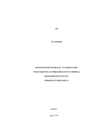 120 Ewa Kusideł BADANIE KOINTEGRACJI NA PODSTAWIE WEKTOROWO-AUTOREGRESYJNYCH MODELI EKONOMETRYCZNYCH. PODEJŚCIE JOHANSENA Seria C Łódź 1997 3 WSTĘP W ostatnich latach coraz większe zainteresowanie budzi badanie kointegracji zmiennych i coraz częściej włączane jest jako typowy etap analizy szeregów czasowych. Do popularnych metod badania kointegracji należy procedura Engle'a i Grangera. W pracy tej podejmuje się próbę wskazania jej wad, na których tle pokazana jest metoda Johansena, bazująca na modelach wektorowo-autoregresyjnych. Metoda Johansena jest coraz częściej dołączana do pakietów komputerowych jako typowy element analizy szeregów czasowych. Nie należy jej jednak stosować mechanicznie. Bardzo istotnym etapem w badaniu kointegracji metodą Johansena jest właściwa specyfikacja modelu wektorowoautoregresyjnego. Dalsza część badania, tzn. badanie związków kointegracyjnych może być wykonywana automatycznie, lecz wiarygodność wyników zależy właśnie od etapu wstępnego. Praca ta ma na celu szczegółową prezentację kolejnych etapów algorytmu znajdowania wektora kointegrującego metodą Johansena, a w szczególności etapu wstępnego, polegającego na specyfikacji postaci modelu. Wśród prezentowanych testów na uwagę zasługują przede wszystkim dwa z nich: - test długości opóźnień - test badający występowanie wyrazu wolnego w wektorze kointegrującym Testy te rzadko są stosowane jako typowy etap analizy kointegracyjnej, pomimo ich prostej kontrukcji, niewątpliwej przydatności i ciekawej interpretacji. 4 1. BADANIE KOINTEGRACJI- DWA ALTERNATYWNE PODEJŚCIA Bardzo popularnym algorytmem badającym skointegrowanie zmiennych jest podejście Engla- Grangera (por. R.F.Engle, C.W.J. Granger [1987], s.251256), gdzie w pierwszym kroku bada się rząd integracji zmiennych, a następnie estymuje związek długookresowej równowagi np. yt 0 1 zt et (1.1) Reszty z powyższego równania są odchyleniami od długookresowej równowagi. Jeśli odchylenia te są stacjonarne, to zmienne yt , zt CI (11 , ) , a wektor kointegrujący ma postać 1 0 1 . Metoda Engla i Grangera jest dość prostym narzędziem testowania kointegracji, lecz ma kilka istotnych wad. Po pierwsze procedura ta bazuje na dwustopniowej estymacji. W pierwszym kroku generujemy reszty ze związku długookresowej równowagi, które, w kroku drugim, są podstawą następnej regresji. Jeśli więc regresja równania równowagi była obarczona błędem, jest on przenoszony do etapu drugiego. Drugą wadą podejścia Engle'a i Grangera jest to, że estymacja związku długookresowej równowagi wymaga jednoznacznego rozstrzygnięcia, która ze zmiennych wystąpi w roli zmiennej objaśniającej, a która objaśnianej. Weźmy pod uwagę zmienne z modelu (1.1). Możliwe jest dla nich badanie dwóch związków długookresowej równowagi: yt 10 11 zt e1t (1.1a) zt 20 21 yt e2t (1.1b) Jeśli rozmiar próby rósłby w nieskończoność, to zgodnie z teorią asymptotyczną, testowanie istnienia pierwiastka jednostkowego w e1t jest równoznaczne z testowaniem istnienia pierwiastka szeregu e2 t . Jednocześnie 5 jednak właściwość ta, charakterystyczna dla dużych prób nie jest przydatna tam, gdzie badacz dysponuje ograniczoną próbą, a z taką sytuacją mamy zazwyczaj do czynienia. W praktyce więc, możliwa jest sytuacja, że regresja równania (1.1a) wskazuje na istnienie kointegracji zmiennych, a regresja równania (1.1b) wskazuje na brak kointegracji. Po trzecie zagadnienie kointegracji jest proste w przypadku dwóch zmiennych (objaśnianej i objaśniającej). Wtedy bowiem związek długookresowej równowagi można wyznaczyć jednoznacznie (lub stwierdzić, że zmienne nie są skointegrowane). Z bardziej skomplikowaną sytuacją mamy do czynienia, gdy rośnie liczba zmiennych objaśniających, wraz z którą rośnie liczba możliwych związków kointegrujących. Np. jeśli liczba zmiennych w modelu wynosi n istnieje od 0 do n 1 liniowo niezależnych wektorów kointegrujących. Procedura Engle'a i Grangera nie formułuje przepisu (testu) na wyznaczanie liczby wektorów kointegrujących. Pewien przełom w badaniach nad kointegracją nastąpił wraz z opublikowaniem pracy S. Johansena [1988] (s. 231-54), który proponuje badanie związków długookresowej równowagi na podstawie modeli wektorowoautoregresyjnych -VAR- postaci: xt A0 A1 xt 1 A2 xt 2 ... Ak xt k t (1.2) gdzie: xt - wektor o wymiarach (n×1) zawierający zmienne włączone do modelu VAR, xt x1t x2 t ... xnt ' A0 - wektor wyrazów wolnych, A0 a01 a02 ... a0n ' , Ai - (n×n) macierz parametrów przy opóźnionych zmiennych wektora xt , t - jest (n×1) wektorem zakłóceń losowych. Przyjmuje się, że t mogą być 6 jednocześnie skorelowane (korelacja pomiędzy poszczególnymi równaniami), ale nie podlegające autokorealcji (w czasie), zatem macierz kowariancji nie jest diagonalna. W celu użycia modelu VAR do badania kointegracji należy go przekształcić do postaci modelu korekty błędem VECM (ang. Vector Error Corretion Model ). Reprezentację VECM dla modelu (1.2) otrzymujemy poprzez odjęcie xt 1 od obu stron równania (1.2): xt A0 ( A1 I ) xt 1 A2 xt 2 A3 xt 3 ... Ak xt k t Kolejne przkształcenia polegające na odejmowaniu wyrażenia ( A1 I )xt 2 , ( A2 A1 I )xt 3 ..., doprowadzają do otrzymania modelu z korektą błędem postaci: k 1 xt A0 i xt i xt k t (1.3) i 1 gdzie: k Ai I i 1 i i Aj I j 1 Johansen dowiódł, że w przypadku wielowymiarowym, do badania kointegracji można użyć rzędu macierzy , który jest równy liczbie niezależnych wektorów kointegrujących, a w szczególności: 1. Jeśli rząd wynosi 0, to wszystkie elementy tej macierzy muszą być zerowe i model (1.3) jest typowym modelem VAR w pierwszych różnicach, dla którego nie istnieje reprezentacja korekty błędem - nie istnieje zatem kombinacja liniowa tych zmiennych, która jest stacjonarna. 7 2. Jeśli macierz jest pełnego rzędu, wtedy szereg