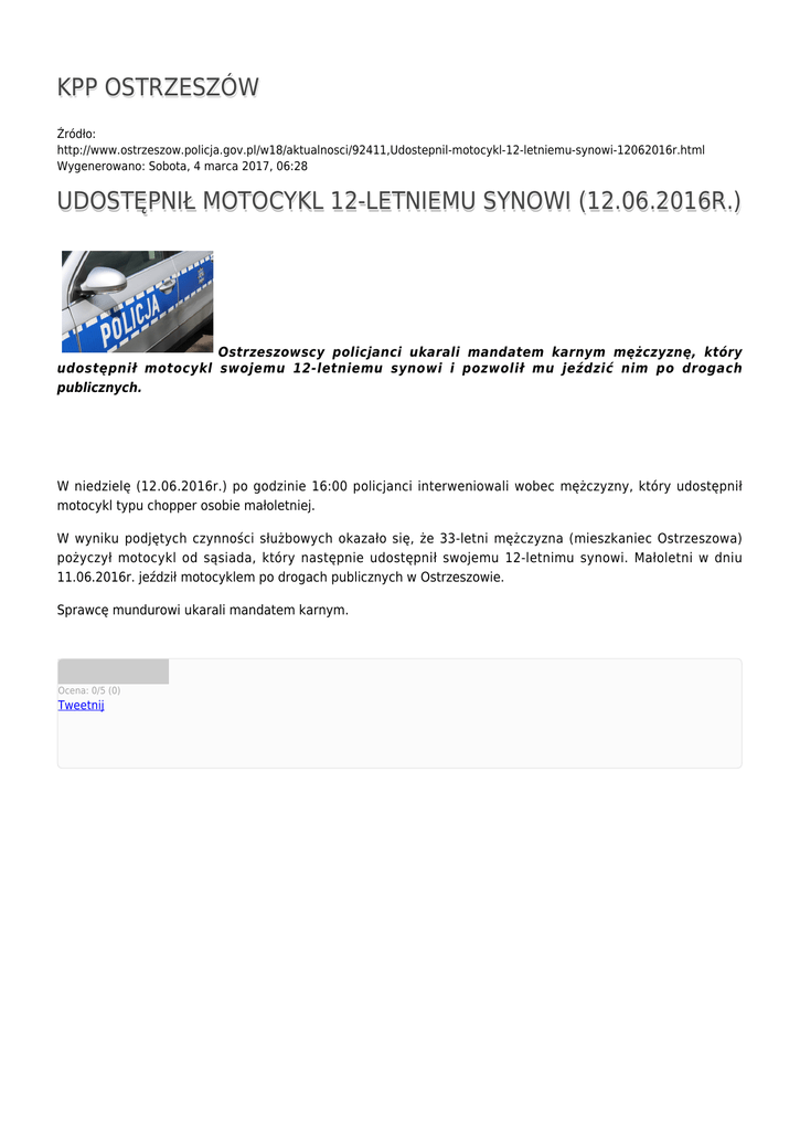 KPP OSTRZESZÓW Źródło: http://www.ostrzeszow.policja.gov.pl/w18/aktualnosci/92411,Udostepnil-motocykl-12-letniemu-synowi-12062016r.html Wygenerowano: Sobota, 4 marca 2017, 06:28 UDOSTĘPNIŁ MOTOCYKL 12-LETNIEMU SYNOWI (12.06.2016R.) Ostrzeszowscy policjanci ukarali mandatem karnym mężczyznę, który udostępnił motocykl swojemu 12-letniemu synowi i pozwolił mu jeździć nim po drogach publicznych. W niedzielę (12.06.2016r.) po godzinie 16:00 policjanci interweniowali wobec mężczyzny, który udostępnił motocykl typu chopper osobie małoletniej. W wyniku podjętych czynności służbowych okazało się, że 33-letni mężczyzna (mieszkaniec Ostrzeszowa) pożyczył motocykl od sąsiada, który następnie udostępnił swojemu 12-letnimu synowi. Małoletni w dniu 11.06.2016r. jeździł motocyklem po drogach publicznych w Ostrzeszowie. Sprawcę mundurowi ukarali mandatem karnym. Ocena: 0/5 (0) Tweetnij