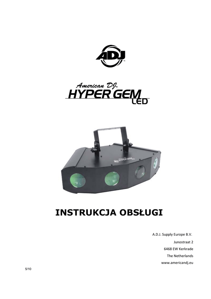 INSTRUKCJA OBSŁUGI A.D.J. Supply Europe B.V. Junostraat 2 6468 EW Kerkrade The Netherlands www.americandj.eu 5/10 Spistreści INFORMACJE OGÓLNE ........................................................................................................................ 3 WSKAZÓWKI OGÓLNE ........................................................................................................................ 3 CHARAKTERYSTYKA ............................................................................................................................ 3 BEZPIECZNA OBSŁUGA ....................................................................................................................... 4 ŚRODKI BEZPIECZEŃSTWA .................................................................................................................. 4 USTAWIENIA ....................................................................................................................................... 5 MENU SYSTEMU ................................................................................................................................. 7 DZIAŁANIE ......................................................................................................................................... 10 PRZEWODY ZASILANIA W POŁĄCZENIU SZEREGOWYM URZĄDZEŃ ................................................ 11 STEROWANIE KONSOLĄ UC3 ............................................................................................................ 11 4 KANAŁY DMX ................................................................................................................................. 12 256 KANAŁÓW DMX ......................................................................................................................... 12 WYMIANA BEZPIECZNIKA ................................................................................................................. 13 CZYSZCZENIE ..................................................................................................................................... 13 USUWANIE USTEREK ........................................................................................................................ 13 SPECYFIKACJA: .................................................................................................................................. 14 ROHS oraz WEEE ............................................................................................................................... 15 A.D.J. Supply Europe B.V. – www.americandj.eu – Hyper Gem LED Instrukcja Obsługi Str. 2 INFORMACJE OGÓLNE Wypakowanie: Dziękujemy za zakup urządzenia świetlnego Hyper Gem LED™ firmy American DJ®. Każdy egzemplarz Hyper Gem LED™ został gruntownie przetestowany, co jest gwarancją jego prawidłowego funkcjonowania. Przed rozpakowaniem należy sprawdzić czy opakowanie nie zostało uszkodzone w czasie transportu. W razie stwierdzenia uszkodzenia opakowania, dokładnie sprawdź, czy nie nastąpiło uszkodzenie sprzętu oraz upewnij się, że wszystkie części konieczne do obsługi urządzenia przybyły w stanie nienaruszonym. W razie stwierdzenia usterek lub braku części, należy skontaktować się z bezpłatnym biurem obsługi klienta. Prosimy o taki kontakt przed podjęciem decyzji o zwrocie urządzenia do sprzedawcy. Wstęp: Hyper Gem LED™ jest inteligentnym urządzeniem świetlnym LED kompatybilnym z systemem DMX. W trybie DMX użytkownik ma do wyboru tryb cztero- oraz dziesięciokanałowy. Urządzenie posiada trzy różne tryby pracy. Może być używane samodzielnie w trybie Stand Alone, w trybie reakcji na dźwięk (Sound Active) lub w konfiguracji Master/Slave. W celu osiągnięcia lepszych efektów poprzez poprawienie widoczności projektowanej wiązki światła, należy równocześnie użyć maszyny mgielnej lub dymu do efektów specjalnych. Obsługa klienta: W razie jakichkolwiek problemów, prosimy o kontakt z zaufanym punktem sprzedaży American Audio. Istnieje również możliwość bezpośredniego kontaktu z nami. Można to zrobić poprzez naszą stronę internetową www.americandj.eu oraz pisząc na adres: [email protected] Ostrzeżenie! Aby zapobiec lub zmniejszyć ryzyko porażenia prądem lub pożaru, nie włączaj urządzenia w warunkach deszczowych lub przy podwyższonej wilgotności powietrza. Ostrzeżenie! Urządzenie może poważnie uszkodzić wzrok. Nie należy patrzeć bezpośrednio na źródło światła. WSKAZÓWKI OGÓLNE Aby w pełni wykorzystać możliwości urządzenia, prosimy o przeczytanie instrukcji obsługi i zapoznanie z podstawowymi funkcjami urządzenia. Instrukcja zawiera ważne informacje dotyczące bezpieczeństwa obsługi oraz sposobu konserwacji urządzenia. Prosimy o zachowanie instrukcji obsługi w celu ponownego użycia. CHARAKTERYSTYKA • Kompatybilny z Protokołem (4 lub 256 Kanałów DMX) • Kolory RGB + White (Czerwony, Zielony, Niebieski + Biały) • 4 Tryby Operacyjne – Reakcja na Dźwięk (Sound Active), Kolor Statyczny (Static Color), Pokaz (Show) oraz tryb DMX • Praca Samodzielna (Stand Alone) lub Konfiguracja Master-Slave • Mikrofon Wewnętrzny • Cyfrowy Wyświetlacz dla Ustawienia Adresów i Funkcji • Kompatybilny z konsolą UC3 (sprzedawana osobno) • 12 zaprogramowanych fabrycznie pokazów (Show) oraz 1 Pokaz Wyboru Losowego • Szeregowe Połączenie Kabli Zasilania A.D.J. Supply Europe B.V. – www.americandj.eu – Hyper Gem LED Instrukcja Obsługi Str. 3 BEZPIECZNA OBSŁUGA Uwaga! Urządzenie nie zawiera żadnych elementów przeznaczonych do serwisowania przez użytkownika. Gwarancja na urządzenie traci ważność, jeśli użytkownik zdecyduje się na samowolną naprawę którejkolwiek z części. Jeżeli jakaś część wymaga naprawy to należy się skontaktować z American DJ. American DJ® nie ponosi żadnej odpowiedzialności za usterki wynikające z nie zapoznania się przez użytkownika z instruk