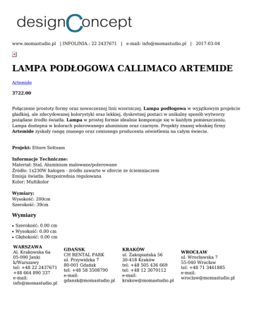 www.momastudio.pl | INFOLINIA.: 22 2437671 | e-mail: [email protected] | 2017-03-04 LAMPA PODŁOGOWA CALLIMACO ARTEMIDE Artemide 3722.00 Połączenie prostoty formy oraz nowoczesnej linii wzorniczej. Lampa podłogowa w wyjątkowym projekcie gładkiej, ale zdecydowanej kolorystyki oraz lekkiej, dyskretnej postaci w unikalny sposób wytworzy pożądane źrodło światła. Lampa w prostej formie idealnie komponuje się w każdym pomieszczeniu. Lampa dostepna w kolorach polerowanego aluminium oraz czarnym. Projekty znanej włoskiej firmy Artemide zyskały rangę znanego oraz cenionego producenta oświetlenia na całym świecie. Projekt: Ettore Sottsass Informacje Techniczne: Materiał: Stal, Aluminium malowane/polerowane Źródło: 1x230W halogen - źródło zawarte w ofercie ze ściemniaczem Emisja światła: Bezpośrednia regulowana Kolor: Multikolor Wymiary: Wysokość: 200cm Szerokość: 39cm Wymiary ● ● ● Szerokość: 0.00 cm Wysokość: 0.00 cm Głębokość: 0.00 cm WARSZAWA Al. Krakowska 6a 05-090 Janki k/Warszawy tel: +48 22 2437671 +48 664 890 337 e-mail: [email protected] GDAŃSK CH RENTAL PARK ul. Przywidzka 7 80-001 Gdańsk tel: +48 58 3508790 e-mail: [email protected] KRAKÓW ul. Zakopiańska 56 30-418 Kraków tel: +48 505 436 669 tel: +48 12 3070112 e-mail: [email protected] WROCŁAW ul. Wrocławska 7 55-040 Wrocław tel: +48 71 3461885 e-mail: [email protected]