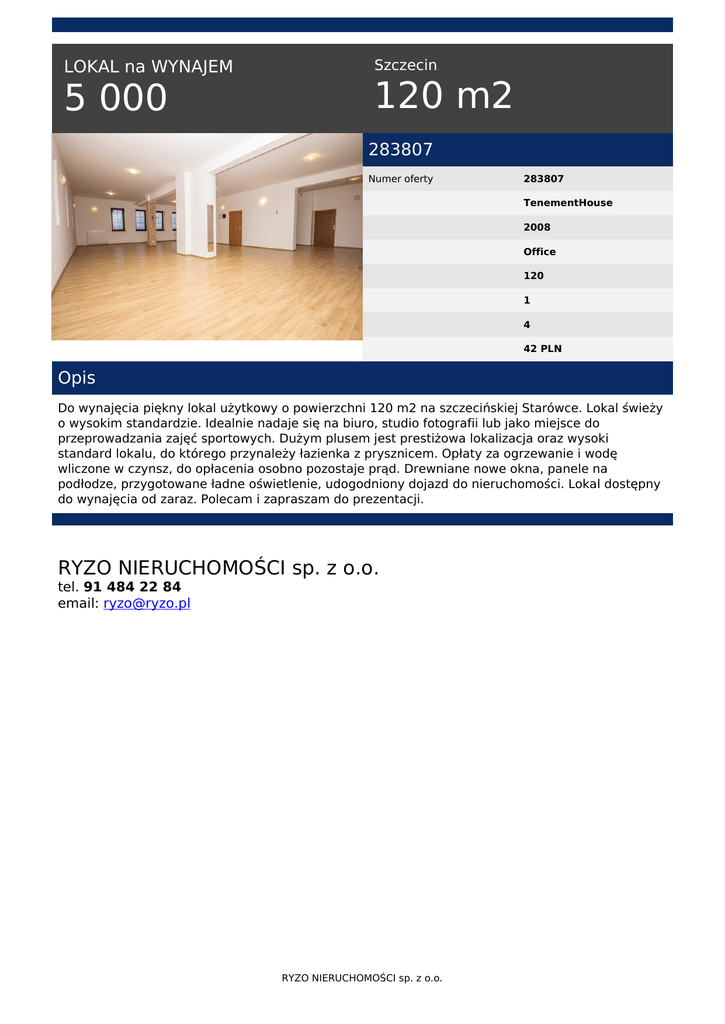 LOKAL na WYNAJEM 5 000 Szczecin 120 m2 283807 Numer oferty 283807 TenementHouse 2008 Office 120 1 4 42 PLN Opis Do wynajęcia piękny lokal użytkowy o powierzchni 120 m2 na szczecińskiej Starówce. Lokal świeży o wysokim standardzie. Idealnie nadaje się na biuro, studio fotografii lub jako miejsce do przeprowadzania zajęć sportowych. Dużym plusem jest prestiżowa lokalizacja oraz wysoki standard lokalu, do którego przynależy łazienka z prysznicem. Opłaty za ogrzewanie i wodę wliczone w czynsz, do opłacenia osobno pozostaje prąd. Drewniane nowe okna, panele na podłodze, przygotowane ładne oświetlenie, udogodniony dojazd do nieruchomości. Lokal dostępny do wynajęcia od zaraz. Polecam i zapraszam do prezentacji. RYZO NIERUCHOMOŚCI sp. z o.o. tel. 91 484 22 84 email: [email protected] RYZO NIERUCHOMOŚCI sp. z o.o. Powered by TCPDF (www.tcpdf.org)