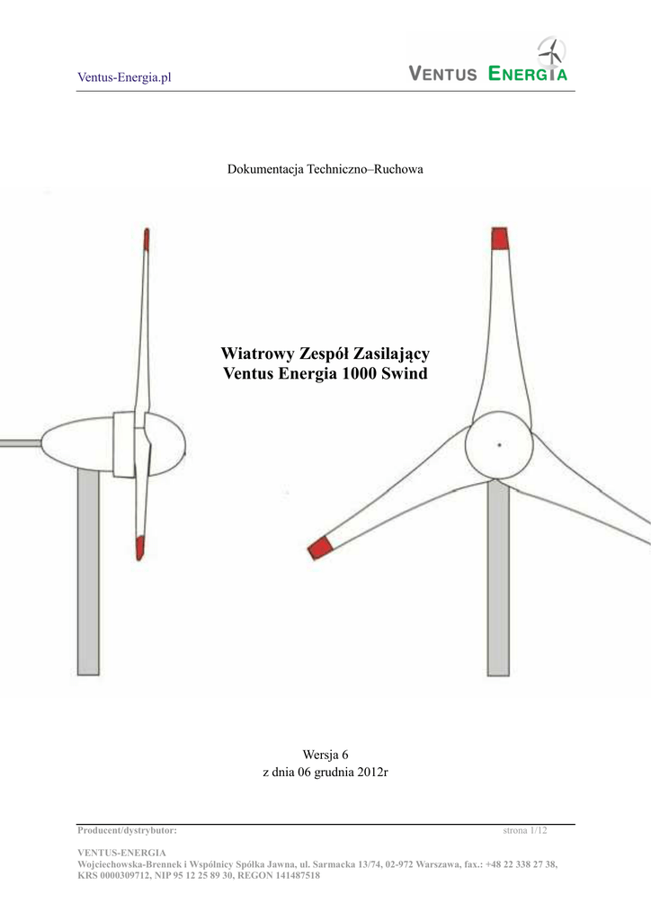 Ventus-Energia.pl Dokumentacja Techniczno–Ruchowa Wiatrowy Zespół Zasilający Ventus Energia 1000 Swind Wersja 6 z dnia 06 grudnia 2012r Producent/dystrybutor: strona 1/12 VENTUS-ENERGIA Wojciechowska-Brennek i Wspólnicy Spółka Jawna, ul. Sarmacka 13/74, 02-972 Warszawa, fax.: +48 22 338 27 38, KRS 0000309712, NIP 95 12 25 89 30, REGON 141487518 Ventus-Energia.pl SPIS TREŚCI 1. WSTĘP 3 2. ZASTOSOWANIE 3 3. OPIS TECHNICZNY 4 3.1 Podstawowe Parametry Techniczne 3.2 Schemat Instalacji Elektrycznej 3.3 Stosowane zabezpieczenia 4 7 8 4. DOSTAWA 9 5. WARUNKI MONTAŻOWE 9 6. WARUNKI EKSPLOATACJI 10 6.1 Przygotowanie Wiatrowego Zespołu Zasilającego do Pracy 6.2 Obsługa Zespołu Wiatrowego w czasie pracy 6.3 Zasady Bezpiecznej Eksploatacji 6.4 Warunki Gwarancji 10 10 10 11 7. UWAGI KOŃCOWE 12 8. ZAŁĄCZNIKI 12 Producent/dystrybutor: strona 2/12 VENTUS-ENERGIA Wojciechowska-Brennek i Wspólnicy Spółka Jawna, ul. Sarmacka 13/74, 02-972 Warszawa, fax.: +48 22 338 27 38, KRS 0000309712, NIP 95 12 25 89 30, REGON 141487518 Ventus-Energia.pl 1. WSTĘP Poniższy dokument przedstawia podstawowe parametry techniczne Wiatrowego Zespołu Zasilającego Ventus Energia 1000 Swind oraz zalecenia dotyczące montażu urządzenia i zasad jego eksploatacji. Zespół składa się z turbiny wiatrowej o mocy 1,0 kW, masztu wsporczego, służącego do posadowienia turbiny na dachu budynku lub na jednej z jego ścian zewnętrznych oraz sterownika elektronicznego i akumulatorów. Urządzenie zostało skonstruowane z myślą o dostarczeniu klientom wydajnego źródła bezpłatnej i czystej energii elektrycznej, które pozwoli na ograniczenie kosztów związanych ze stale rosnącymi cenami energii oraz sprzyjać będzie ochronie środowiska. 2. ZASTOSOWANIE Wiatrowy Zespół Zasilający Ventus Energia 1000 Swind służy do zasilania w energię indywidualnych zabudowań typu domy jednorodzinne, domki letniskowe, małe firmy produkcyjne i usługowe, gospodarstwa rolne, niewielkie hotele i pensjonaty oraz obiekty użyteczności publicznej. Może on pełnić funkcję dodatkowego źródła energii, wspomagającego zasilanie budynków podłączonych do sieci elektrycznej lub stanowić samodzielne źródło energii w przypadku obiektów, które nie mają dostępu do sieci. Ze względu na niewielką moc Ventus Energia 1000 Swind najlepiej nadaje się do zasilania oświetlenia oraz odbiorników takich jak telewizor czy komputer. Przy zastosowaniu zestawu z opcją zespołu sterownika typu ZSE-2, (szczegóły patrz pt. 3 Opis techniczny) urządzenie to może być również wykorzystywane do zasilania instalacji z indukcyjnymi silnikami elektrycznymi, typu lodówka czy hydrofor. Zgodnie z przepisami prawa budowlanego montaż Ventus Energia 1000 Swind na obiekcie nie wymaga uzyskania pozwolenia na budowę, co znacząco upraszcza procedurę inwestycyjną dla Klienta. Producent/dystrybutor: strona 3/12 VENTUS-ENERGIA Wojciechowska-Brennek i Wspólnicy Spółka Jawna, ul. Sarmacka 13/74, 02-972 Warszawa, fax.: +48 22 338 27 38, KRS 0000309712, NIP 95 12 25 89 30, REGON 141487518 Ventus-Energia.pl 3. OPIS TECHNICZNY 3.1 Podstawowe Parametry Techniczne W skład Wiatrowego Zespołu Zasilającego typu Ventus Energia 1000 Swind wchodzą następujące podzespoły: - turbina wiatrowa (generator, śmigło, układ regulacji) maszt wsporczy do posadowienia turbiny na dachu lub ścianie zewnętrznej budynku zespół sterownika elektronicznego, zespół baterii akumulatorów. Turbina wiatrowa: Turbina wiatrowa składa się z następujących elementów: Generator - prądnica wolnoobrotowa, synchroniczna, trójfazowa, bezszczotkowa na magnesach neodymowych, napięcie nominalne 24V. Śmigło - 3 łopatowe z kompozytów poliestrowych o średnicy 2,0m. Układ regulacji - aerodynamiczne i automatyczne ukierunkowanie na kierunek wiatru oraz zabezpieczenie przeciw burzowe sterem kierunkowym -regulacyjnym, posadowione na pionowym ułożyskowaniu /obrotnicy/. Producent/dystrybutor: strona 4/12 VENTUS-ENERGIA Wojciechowska-Brennek i Wspólnicy Spółka Jawna, ul. Sarmacka 13/74, 02-972 Warszawa, fax.: +48 22 338 27 38, KRS 0000309712, NIP 95 12 25 89 30, REGON 141487518 Ventus-Energia.pl Moc nominalna turbiny wiatrowej: Rozruchowa prędkość wiatru: Roczna produkcja energii: Masa gondoli: Emisja hałasu: Trwałość: 1000W przy prędkości wiatru 10m/s 2.3 m/s 1300 - 2500 kWh zależnie od siły wiatru. 35 kg (generator, śmigło, obrotnica, układ regulacji) <37dB (A) niezależnie od siły wiatru. 20 lat Maszt Wsporczy: Dostępny w opcjach: Maszt ścienny - element wsporczy o długości 4,5m, z ocynkowanej stali o profilu okrągłym z zespołem elementów tłumiących drgania, gumowo-metalowych. Masa masztu: 75kg. Maszt dachowy - element wsporczy o wysokości do 3m, z ocynkowanej stali, o profilu okrągłym. Ze względu na różnorodność konstrukcji dachowych jest wykonywany wg. indywidualnego projektu. Zespół Sterownika Elektronicznego: Zespół sterownika elektronicznego jest urządzeniem zawierającym układ regulacyjnokontrolny, pozwalający na regulację i kontrolę parametrów pracy urządzenia. Z lewej strony panelu kontrolnego, poniżej wskaźnika obciążenia /amperomierza/ znajduje się przełącznik START - STOP umożliwiający wybór funkcji uruchomienia i zatrzymania śmigła turbiny wiatrowej. Zespół sterownika elektronicznego jest umieszczony w metalowej, hermetycznej skrzynce o wymiarach 200x400x600mm, przystosowanej do montażu na zewnętrznej ścianie budynku. Producent/dystrybutor: strona 5/12 VENTUS-ENERGIA Wojciechowska-Brennek i Wspólnicy Spółka Jawna, ul. Sarmacka 13/74, 02-972 Warszawa, fax.: +48 22 338 27 38, KRS 0000309712, NIP 95 12 25 89 30, REGON 141487518 Ventus-Energia.pl Na płycie instalacyjnej zespołu sterownika elektronicznego znajduje się listwa WE/WY, do której są podłączone trzy wiązki elektryczne: „A, B, C'; „X, Y, Z”; „1, 2, 3”. Układ elektroniczny znajdujący się na płycie in